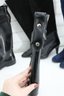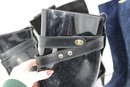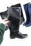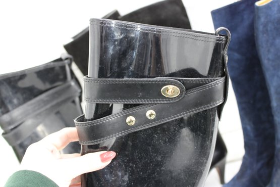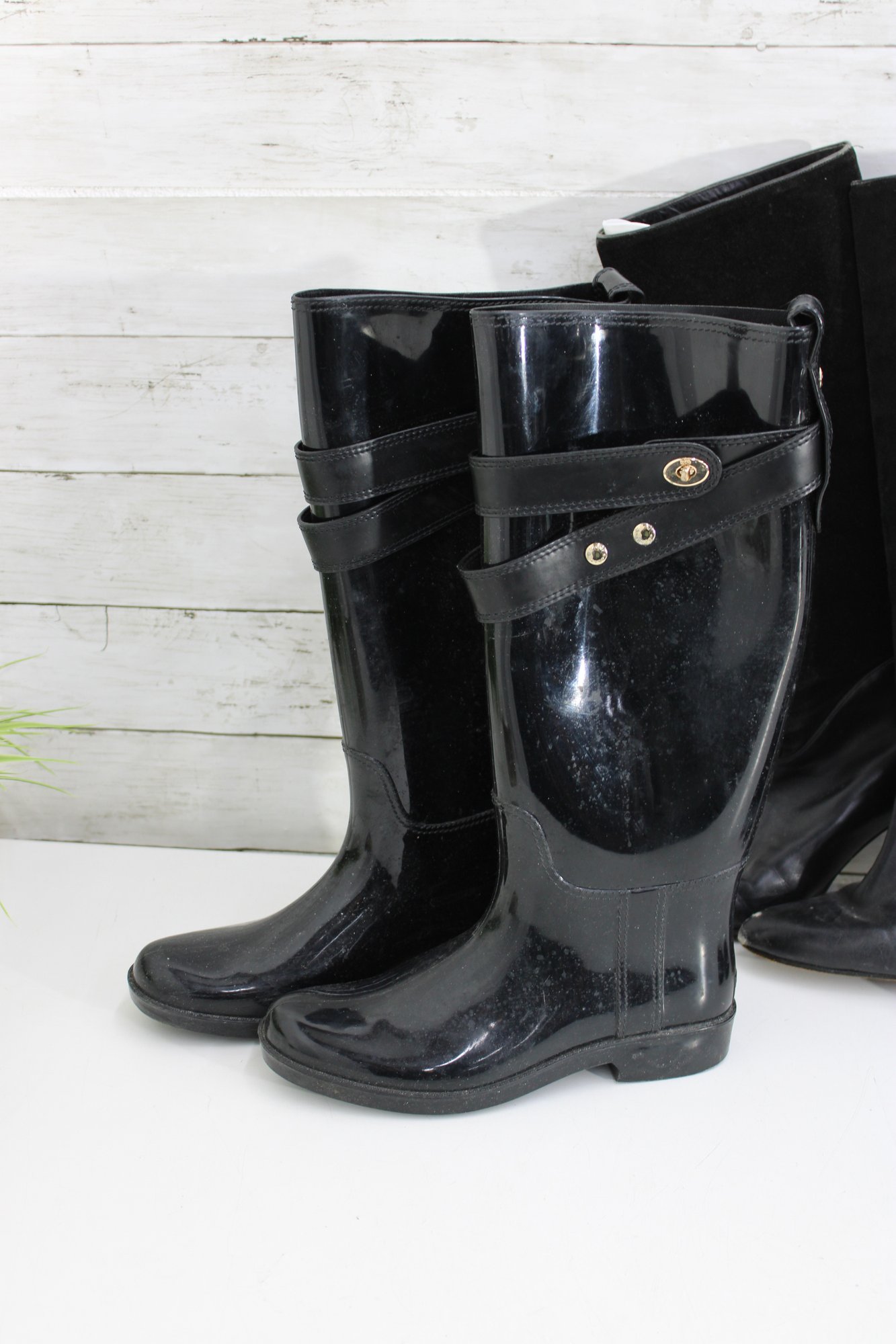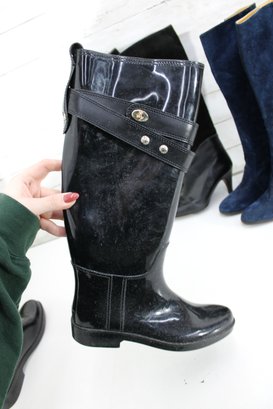 Sleek and practical, these Coach black glossy knee-high rain boots feature a polished finish accented with an adjustable strap and gold-tone hardware for a stylish touch. Designed for wet weather, they offer a classic silhouette that pairs easily with everyday outfits while providing durable coverage and comfort.