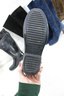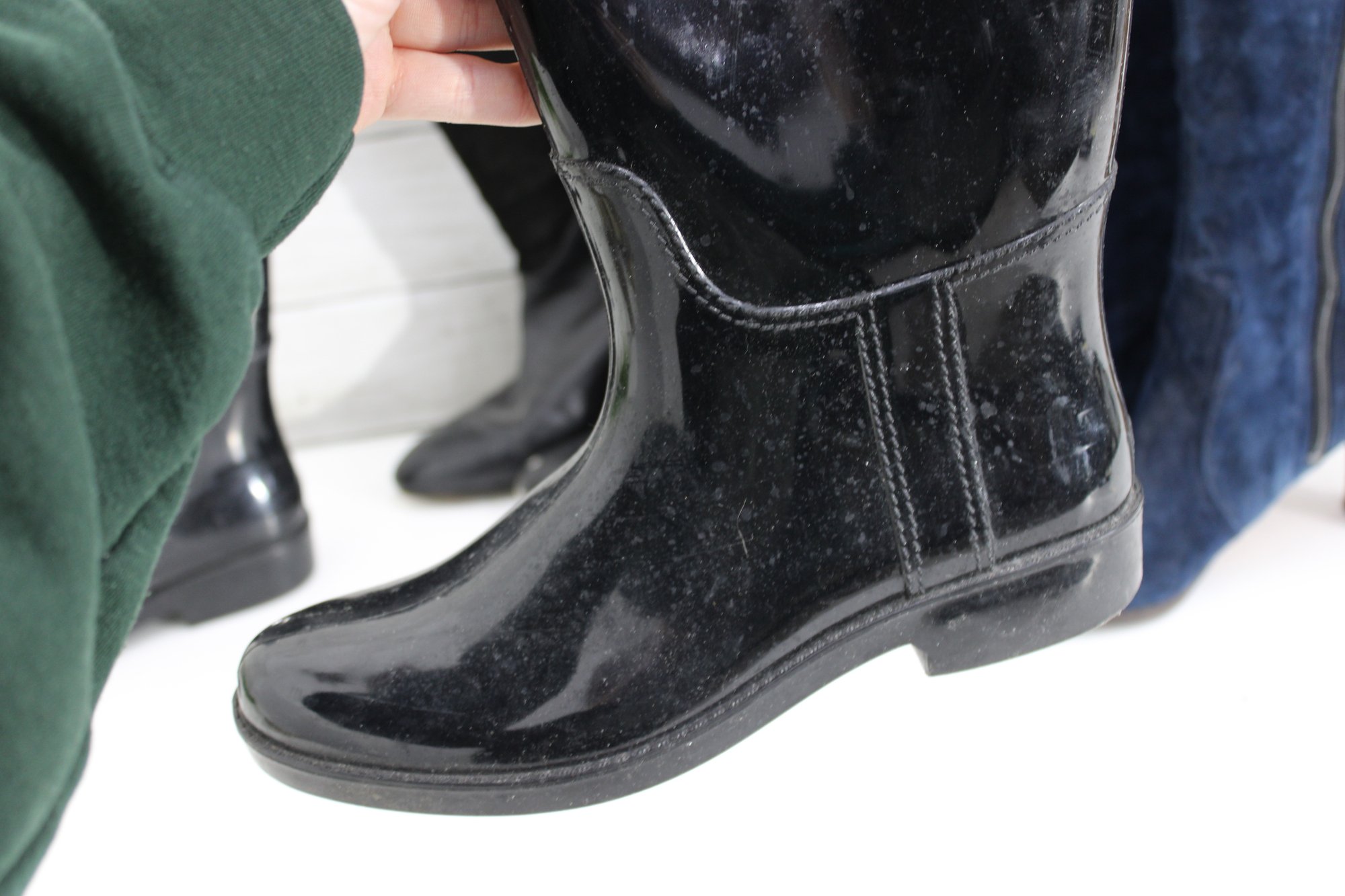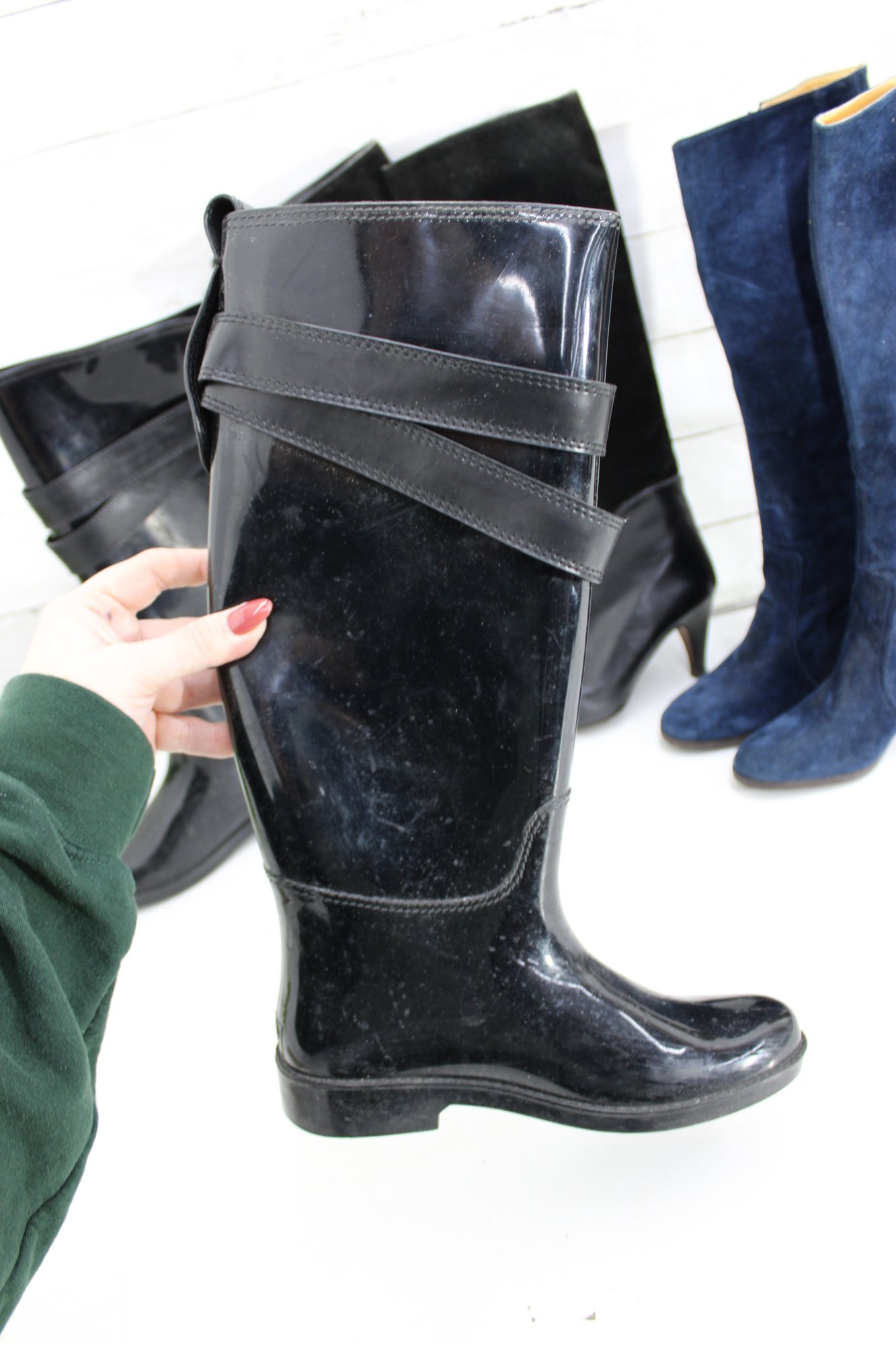 The boots have a low heel and textured sole for stability, making them suitable for rain, snow, or muddy conditions. A versatile and functional footwear option with subtle fashion detailing.