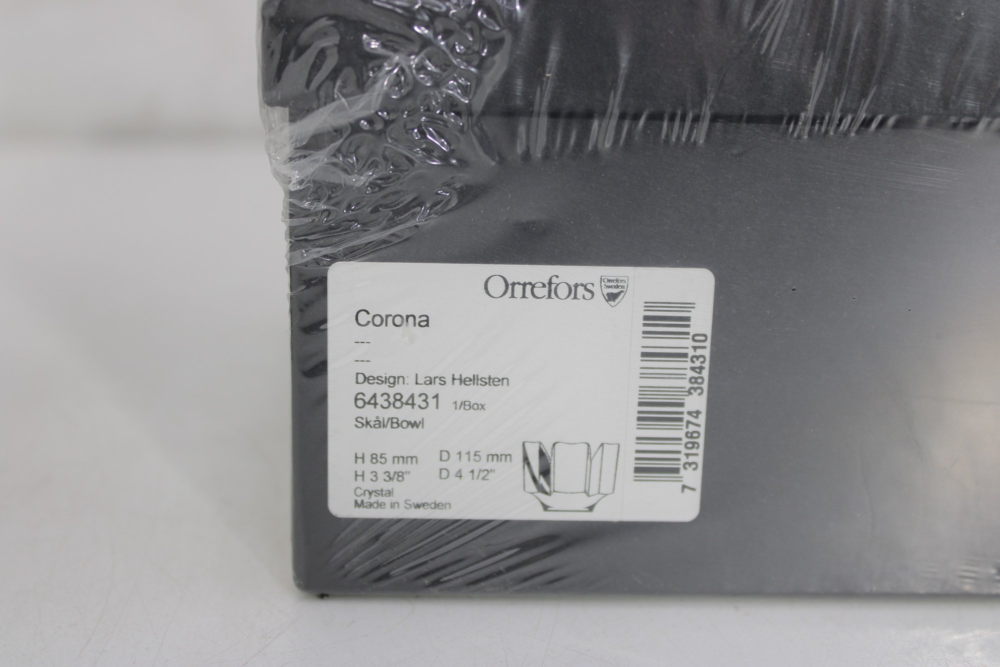 a brand new, in-the-box Orrefors Crystal “Corona” bowl, designed by renowned Swedish glass artist Lars Hellsten.