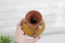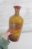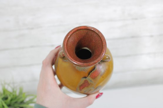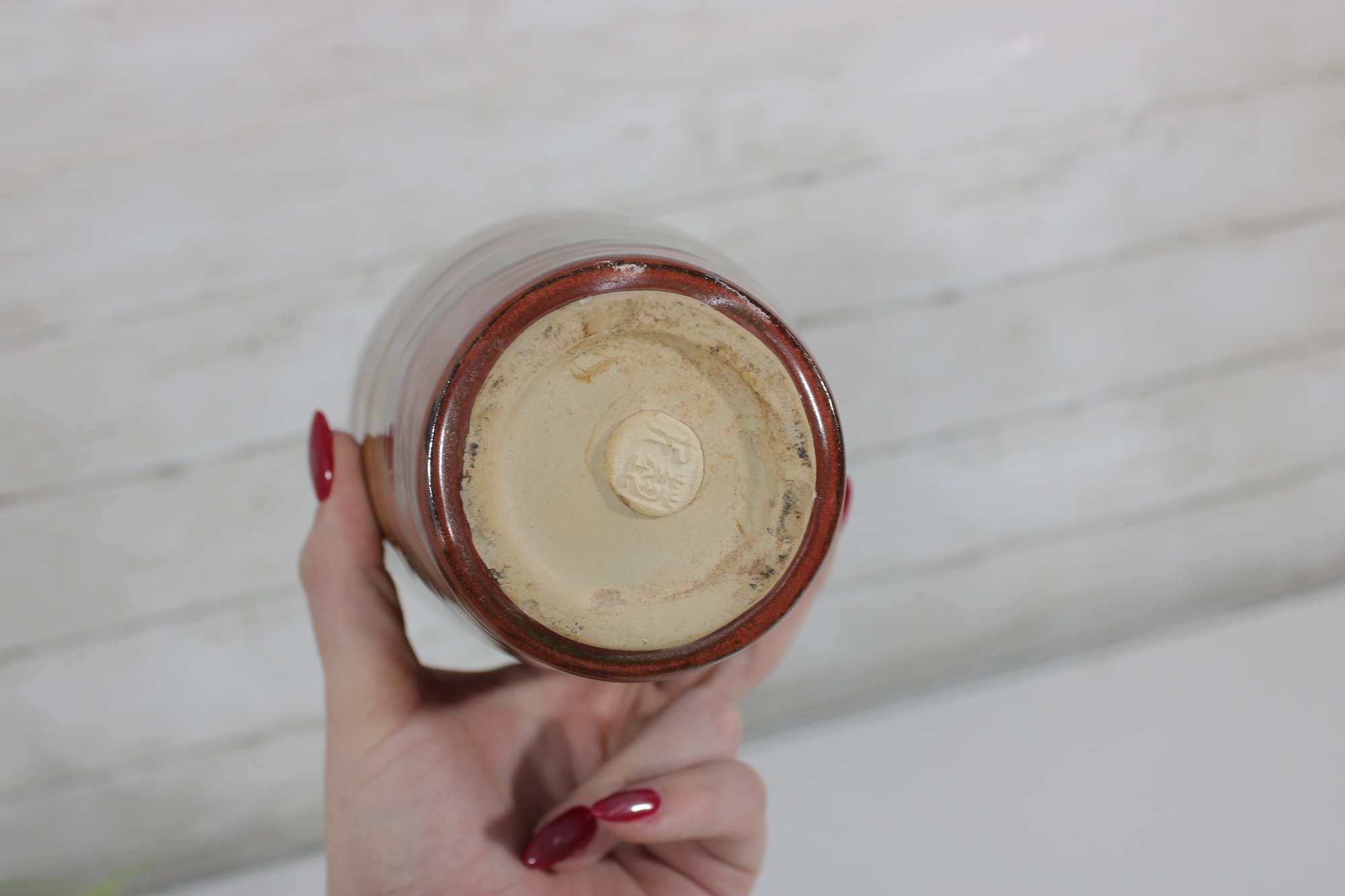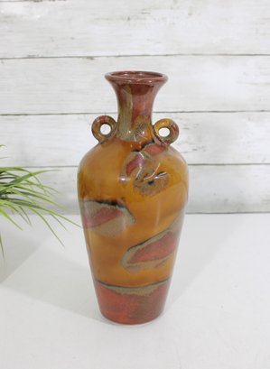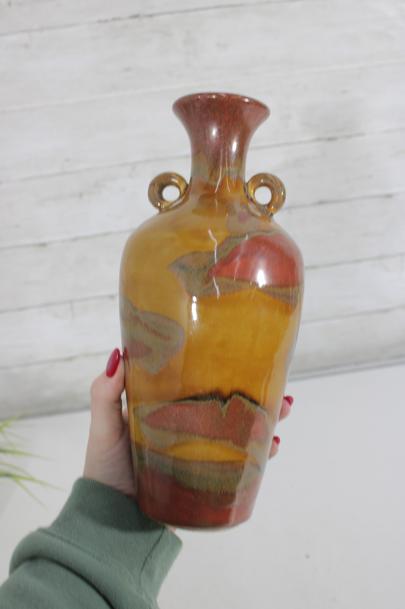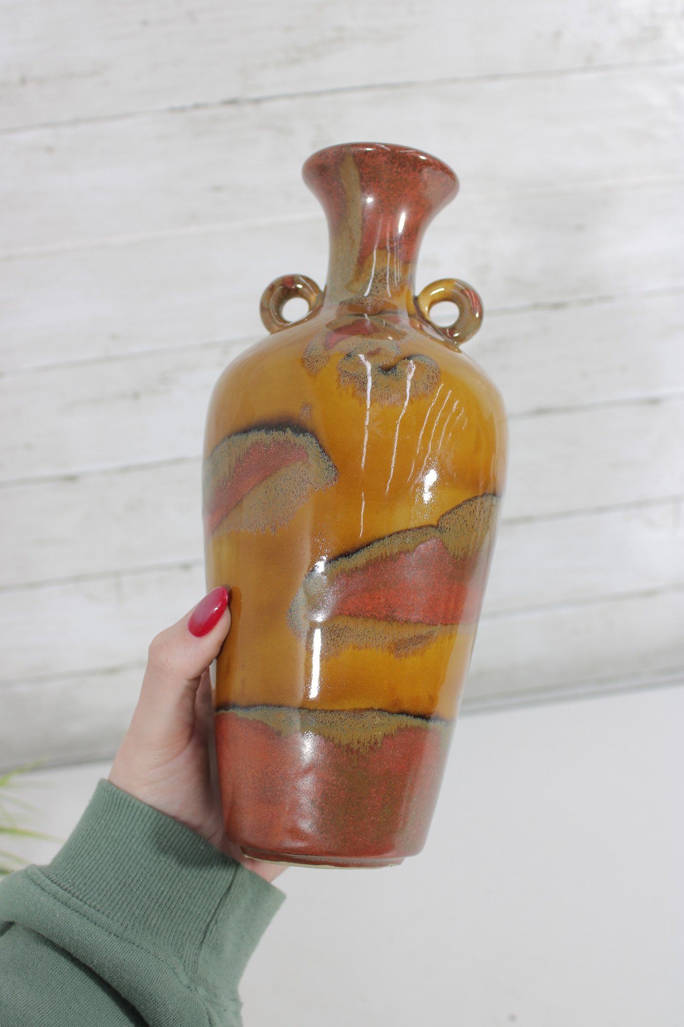 Beautiful handcrafted Shiwan-style pottery vase by Lemax, made in China, featuring a rich, earthy glaze and classic form. This piece stands approximately 10.5 inches tall and showcases a warm palette of amber, rust, and brown tones with flowing abstract patterns.