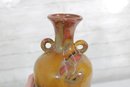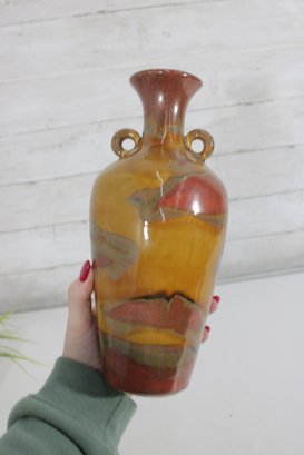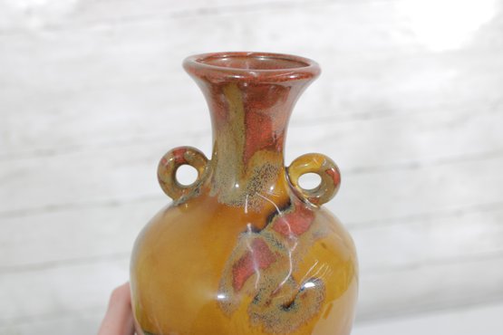 The vase features a narrow neck with a flared rim and two small decorative loop handles at the shoulder, adding to its traditional Asian-inspired design. The glossy glaze and natural color variations highlight its handmade character and artistic appeal.