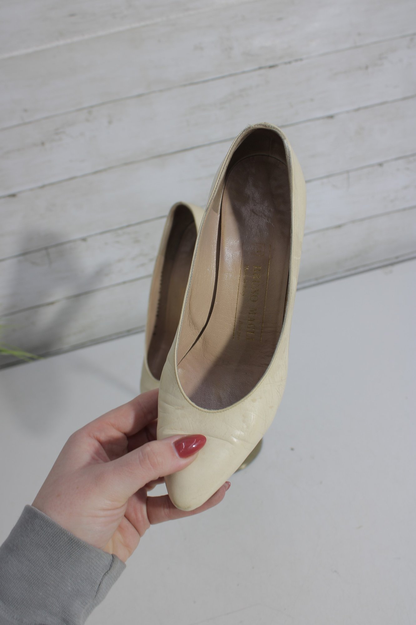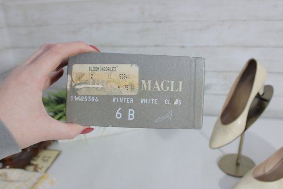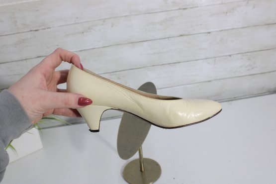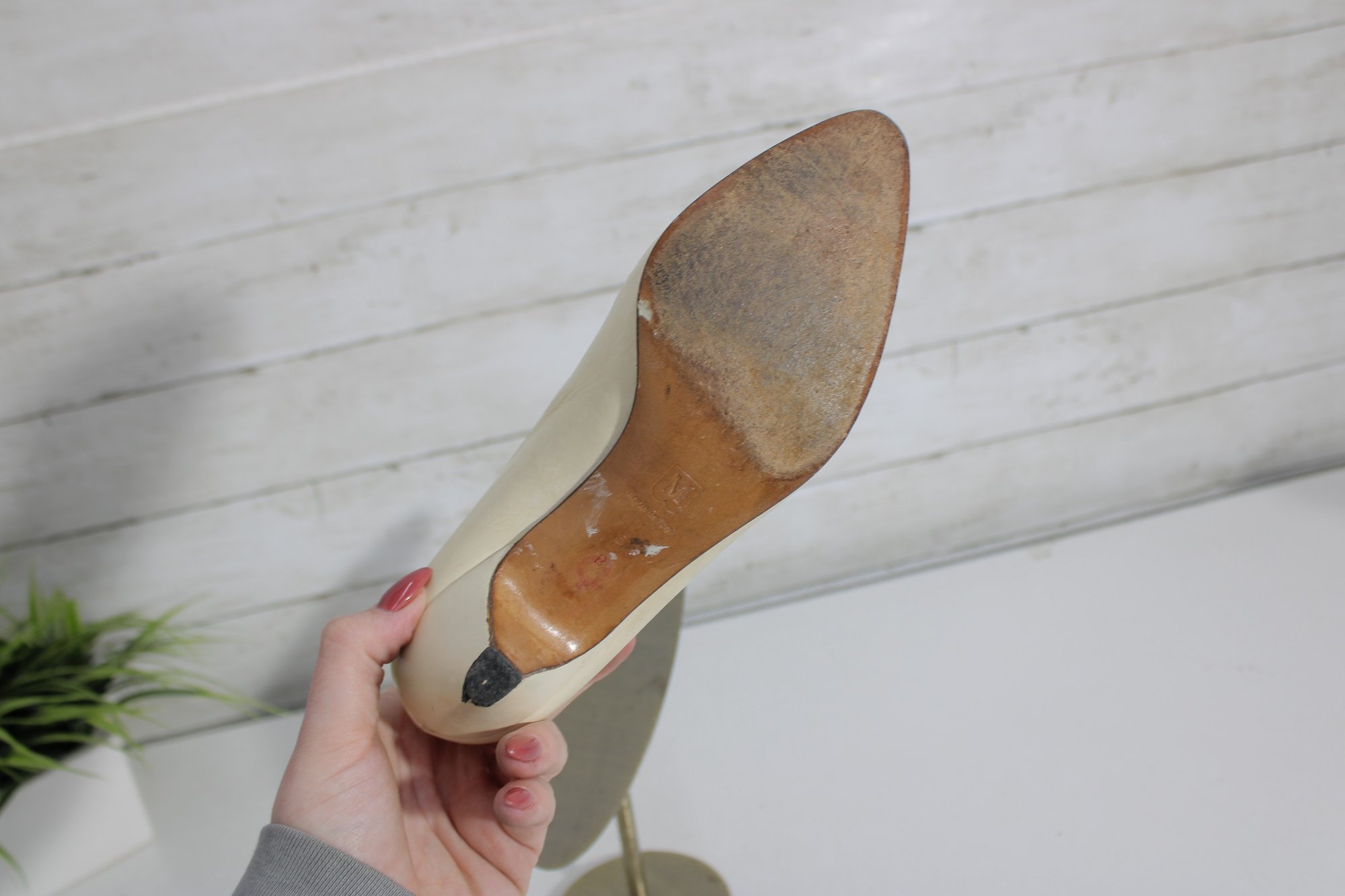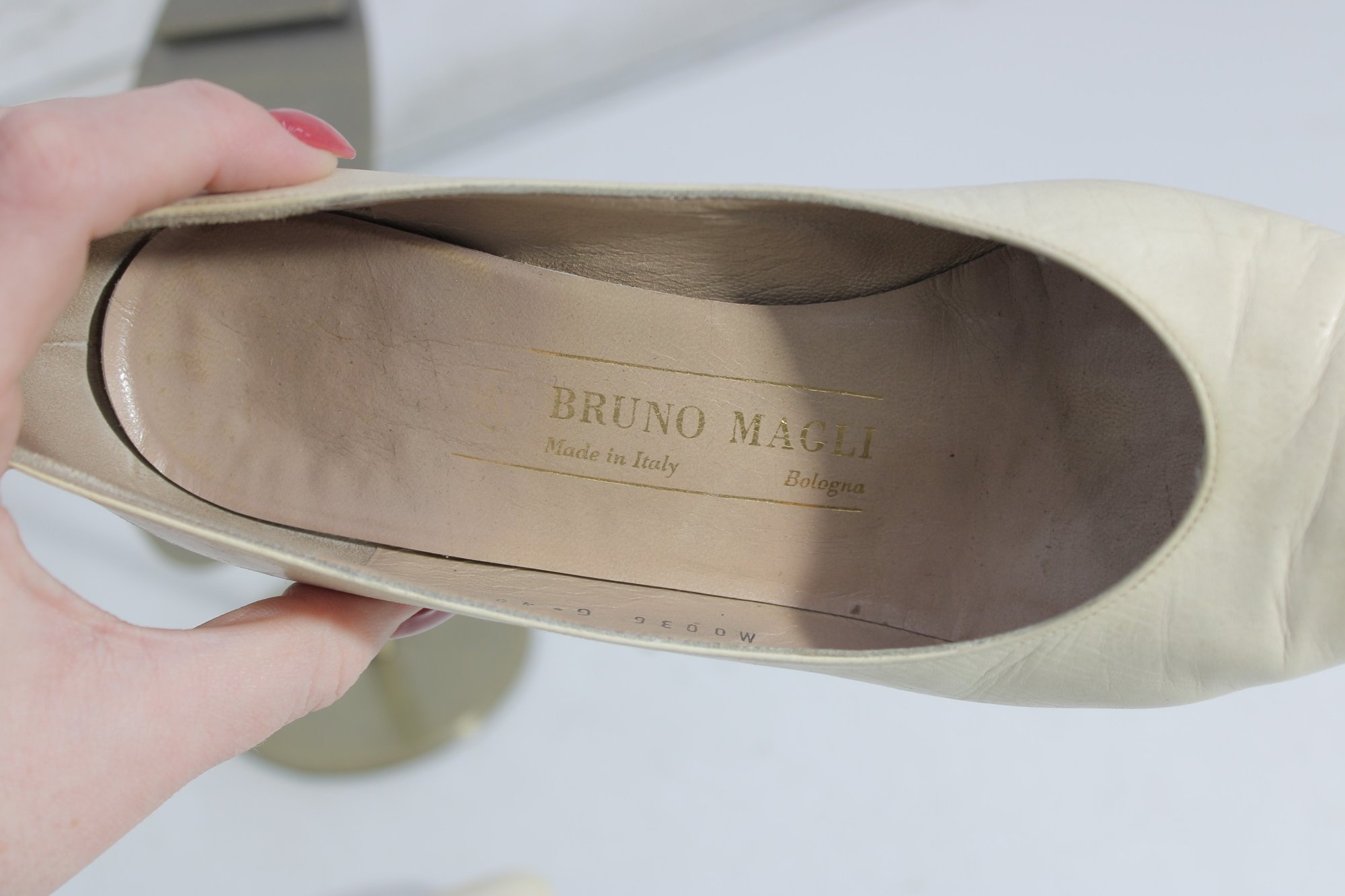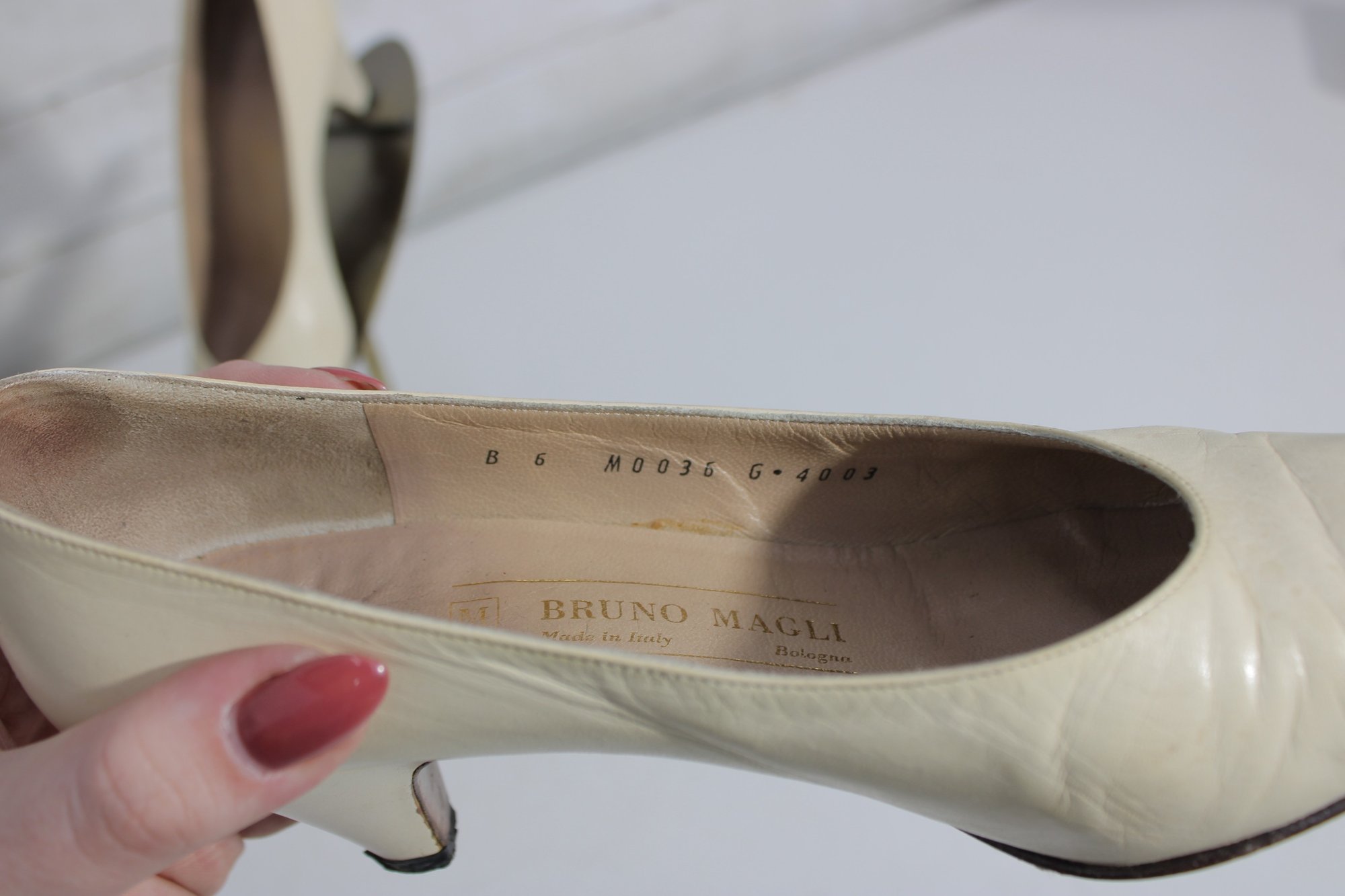 Step into timeless elegance with these authentic Bruno Magli leather pumps, expertly crafted in Italy. Featuring a sleek, classic silhouette, these shoes are finished in a soft cream/ivory tone that pairs effortlessly with both professional and formal looks.