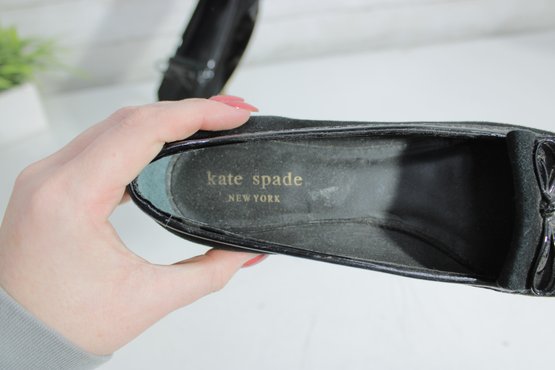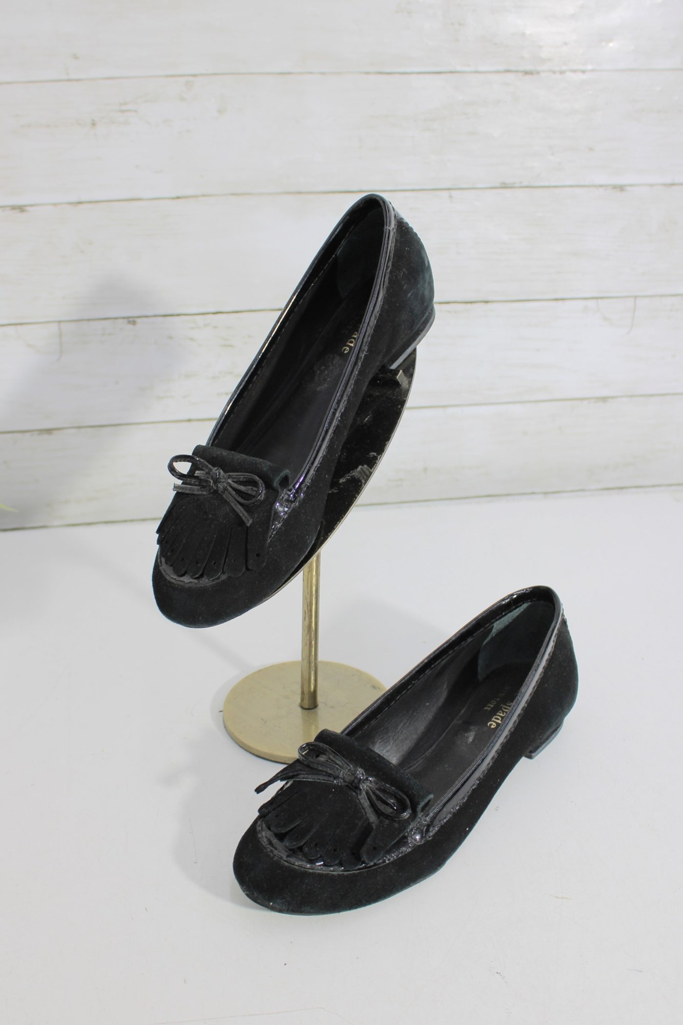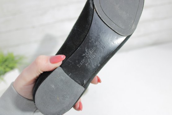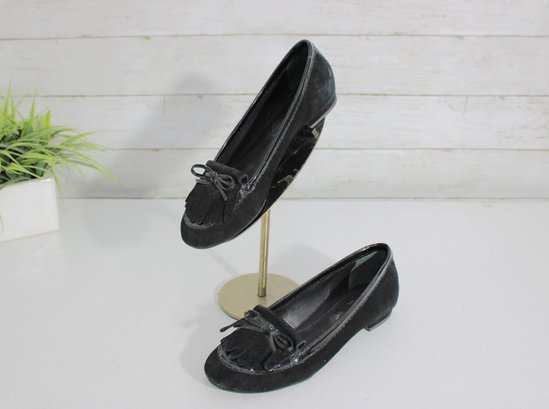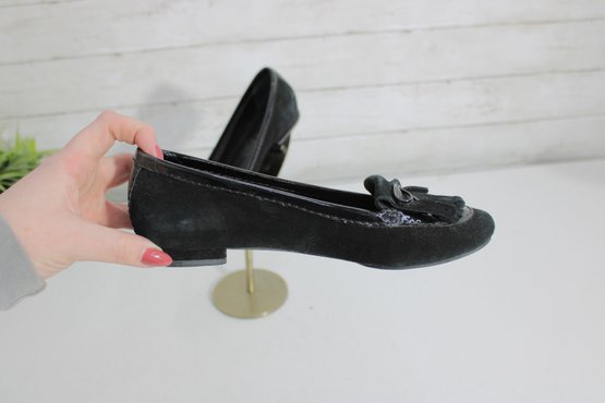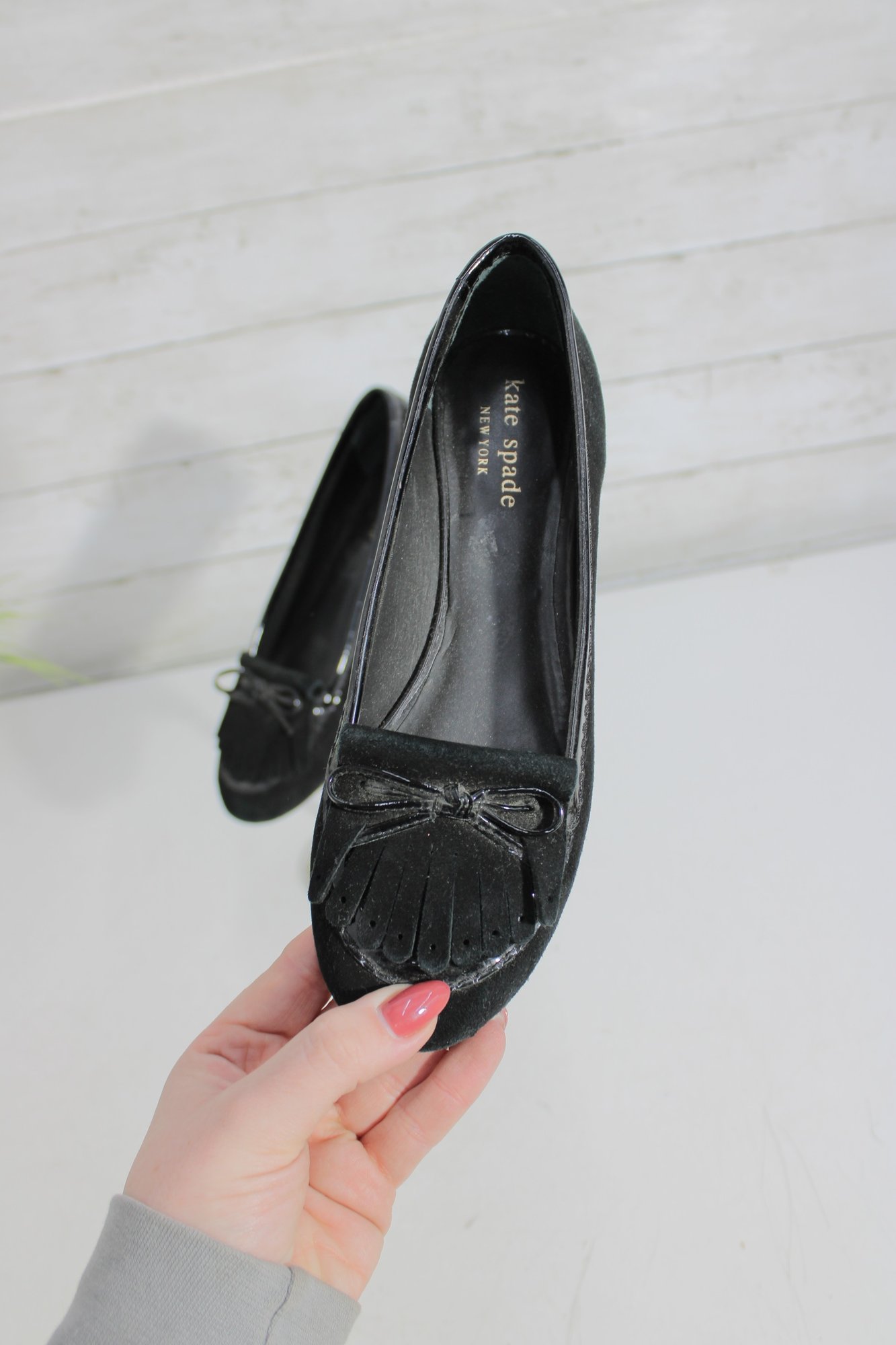Add timeless style to your wardrobe with these authentic Kate Spade New York loafers. Crafted in classic black suede, they feature an elegant bow and fringe detail at the toe, offering a polished yet comfortable look perfect for everyday wear or office attire.