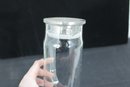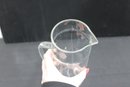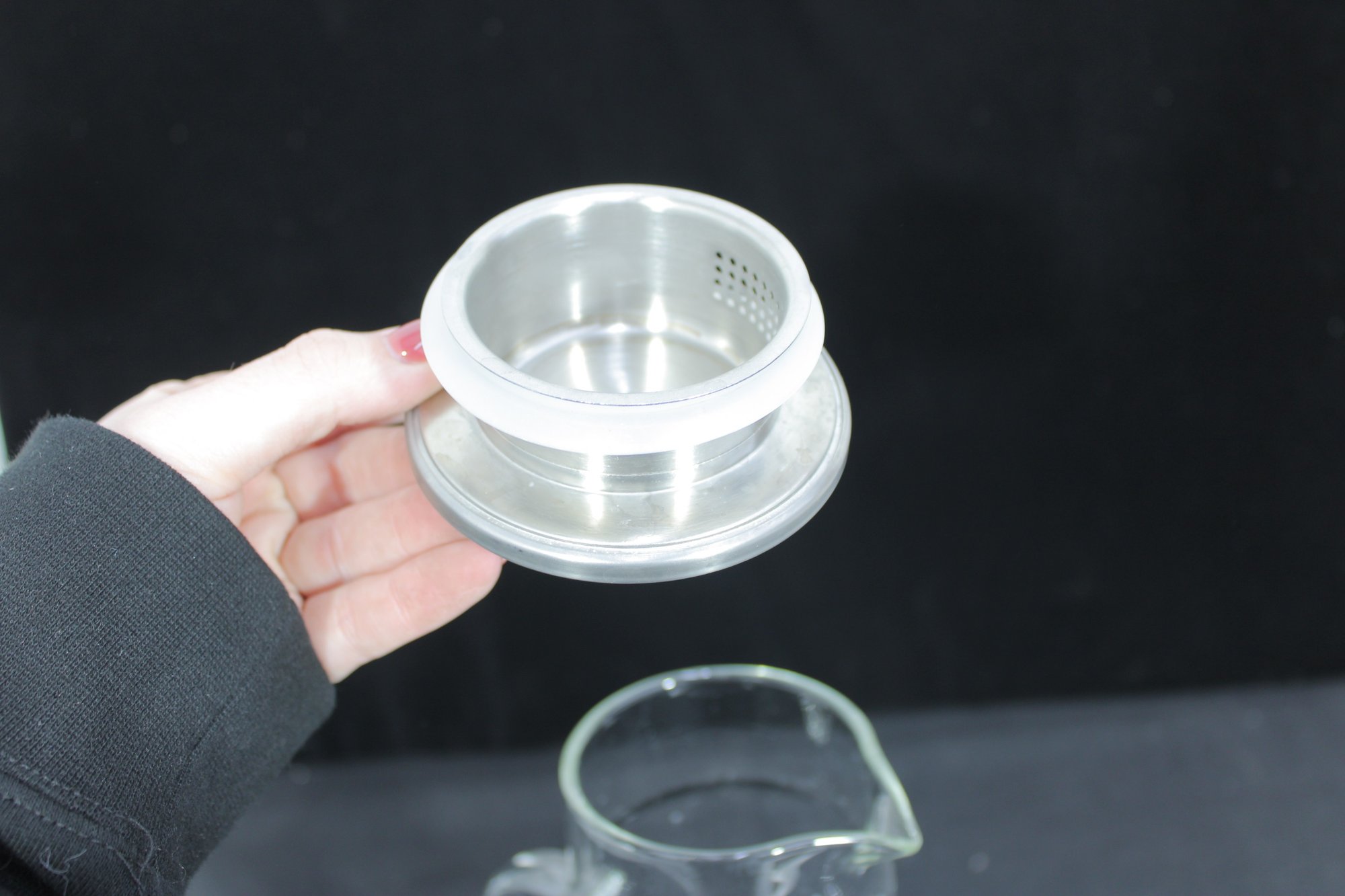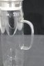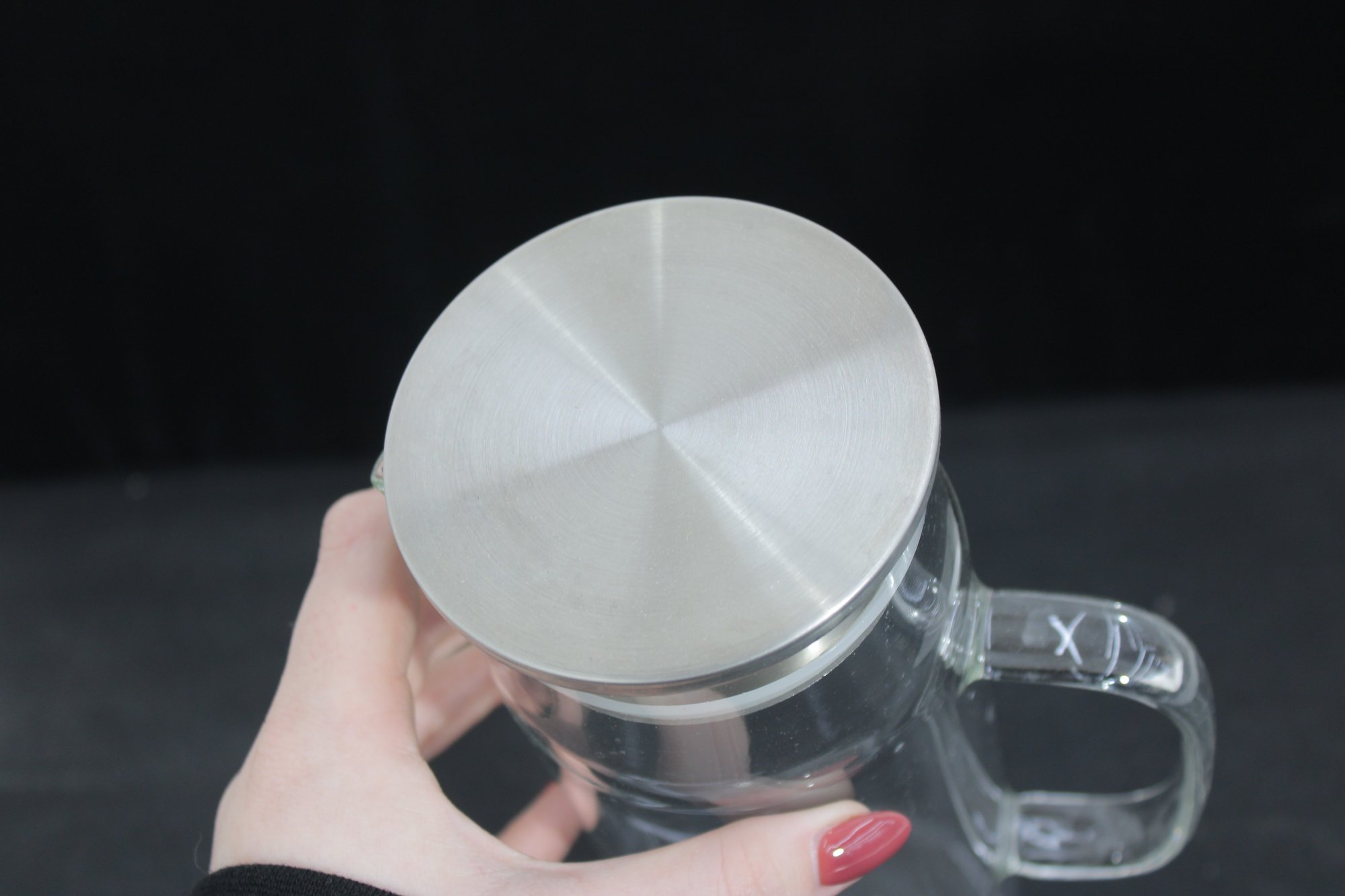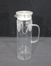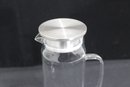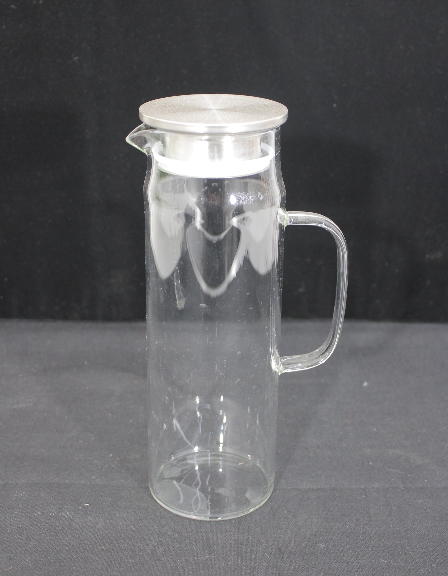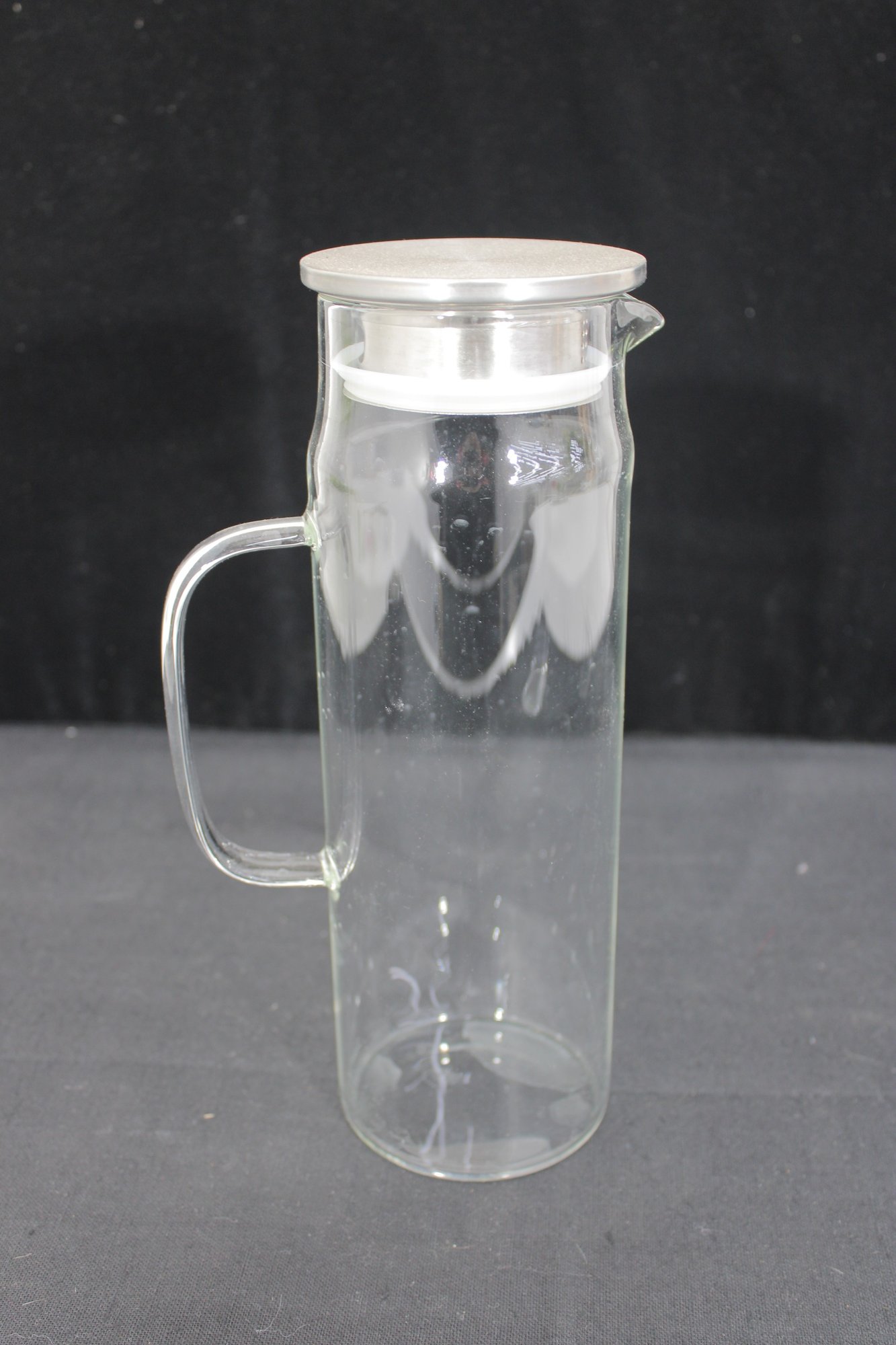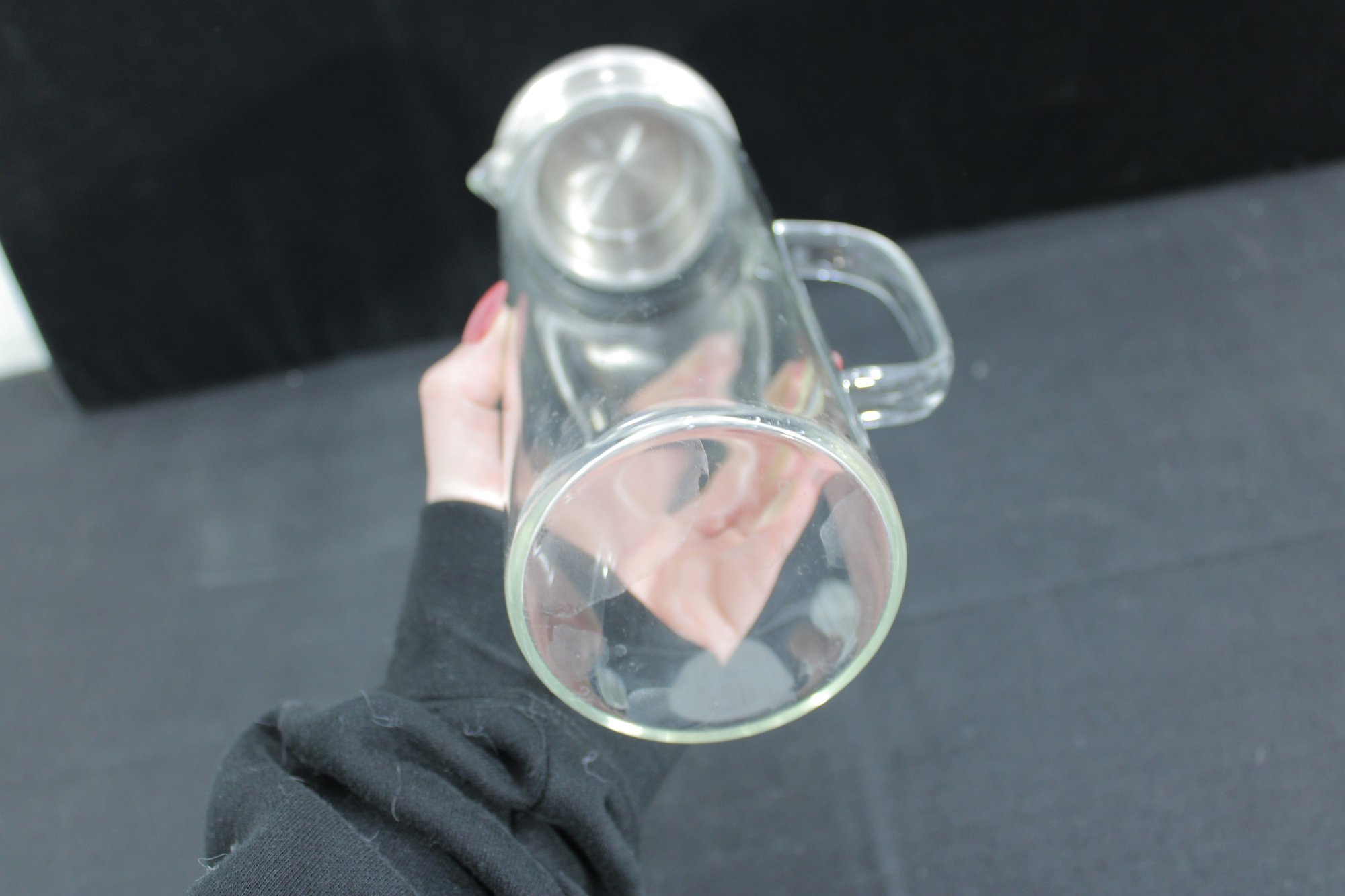 This clear glass pitcher features a comfortable handle, pour spout, and a stainless steel lid with built-in strainer insert. The lid design allows for easy pouring while keeping ice, fruit, or tea leaves contained.