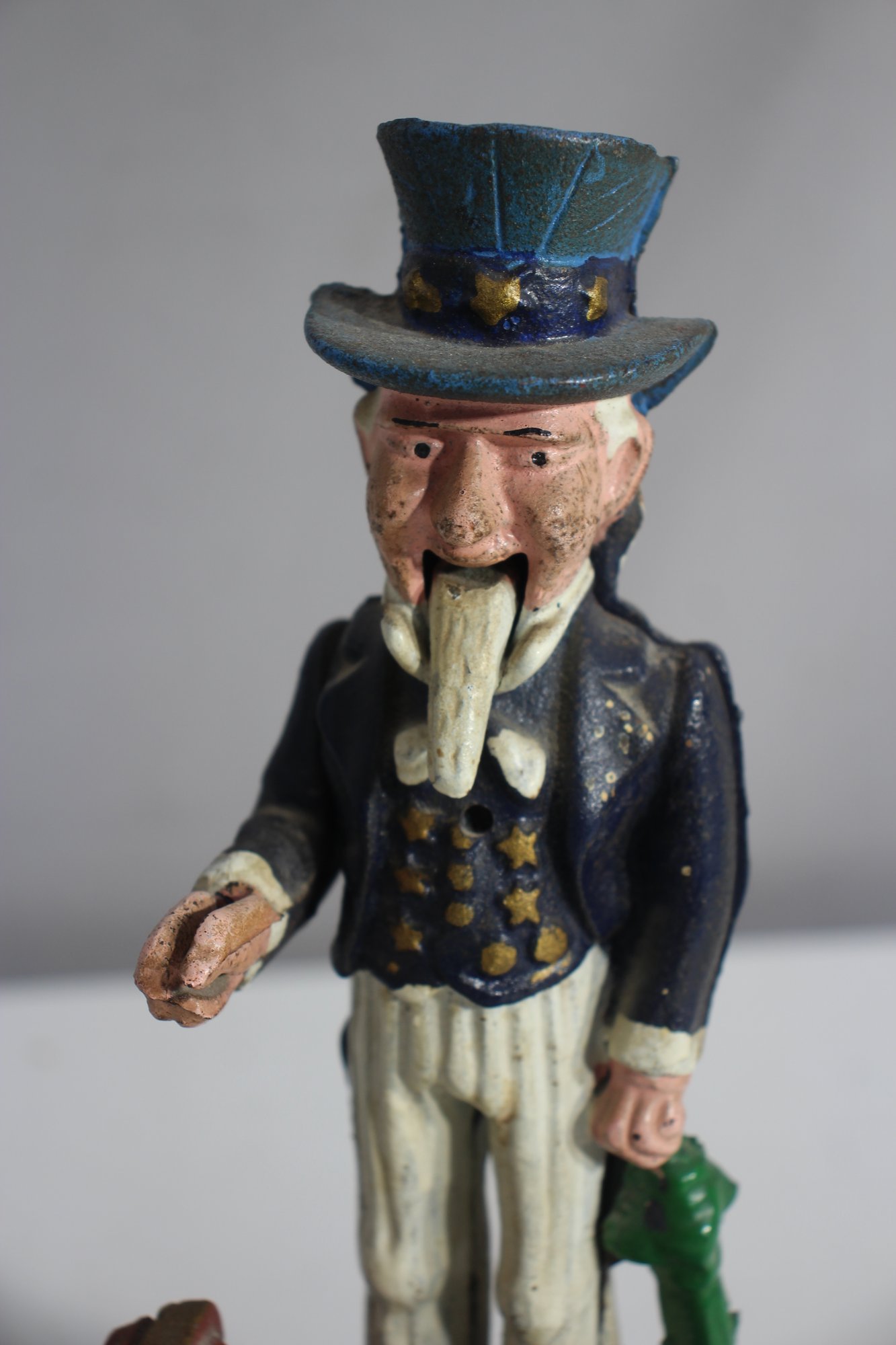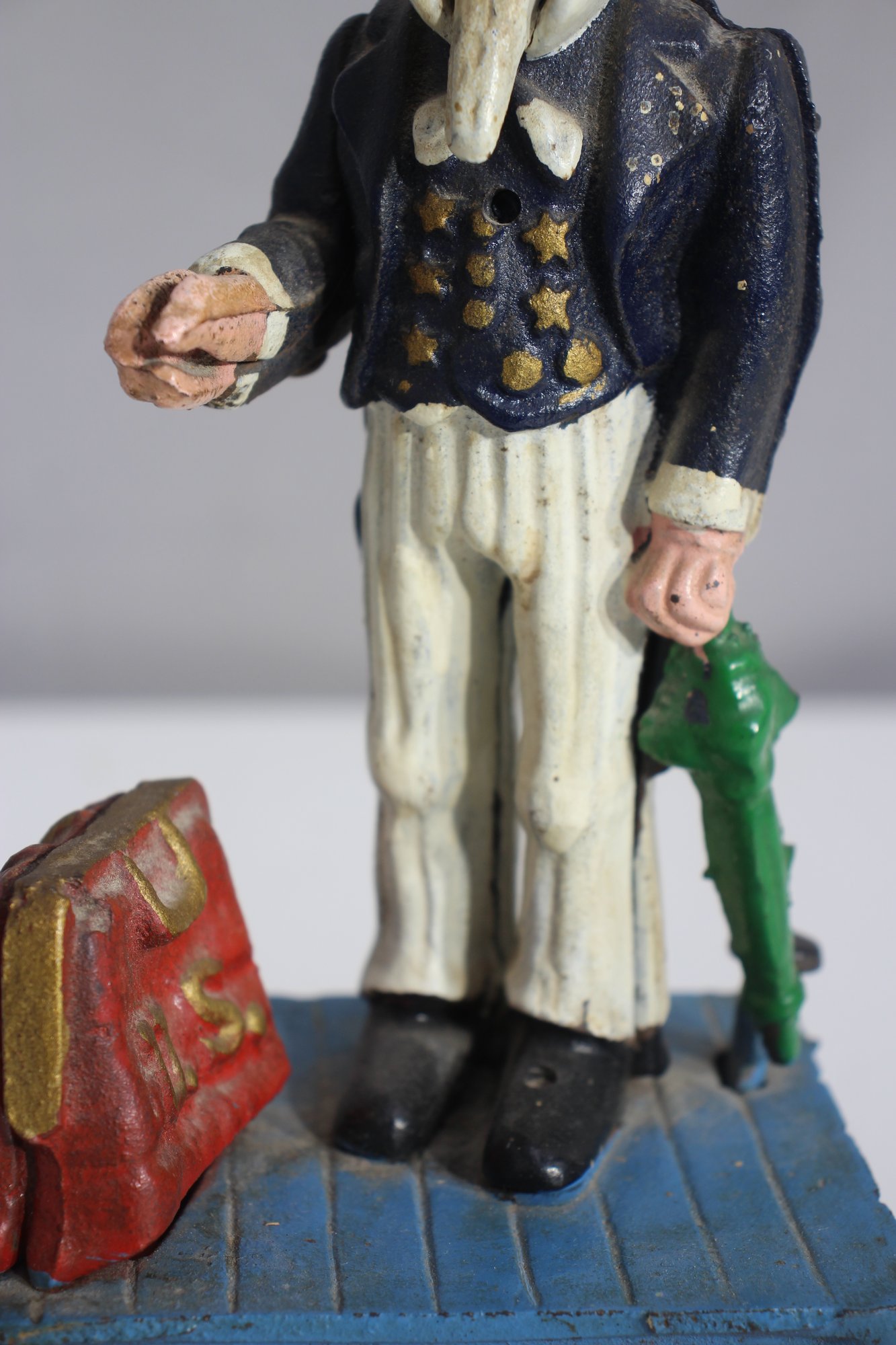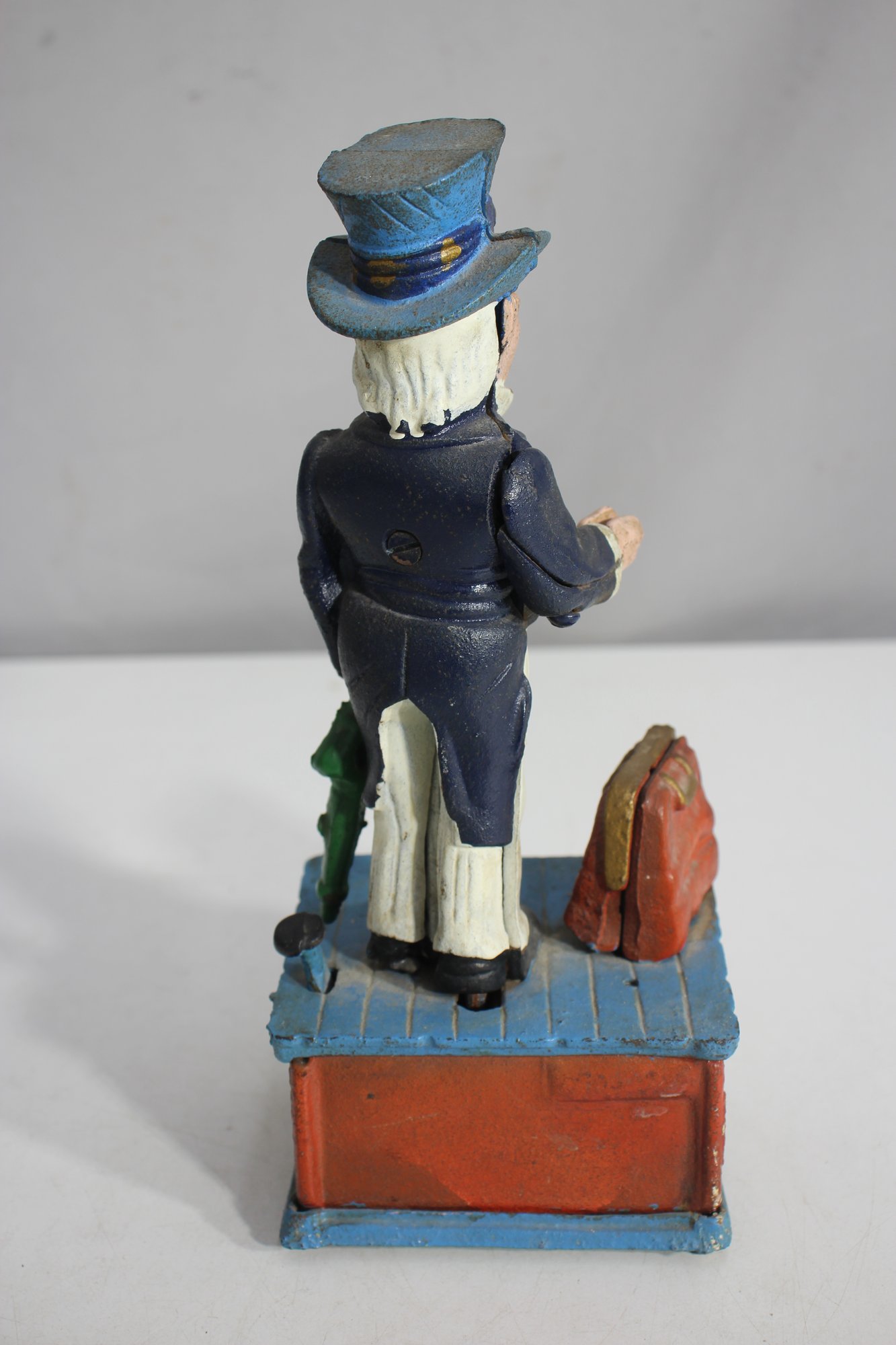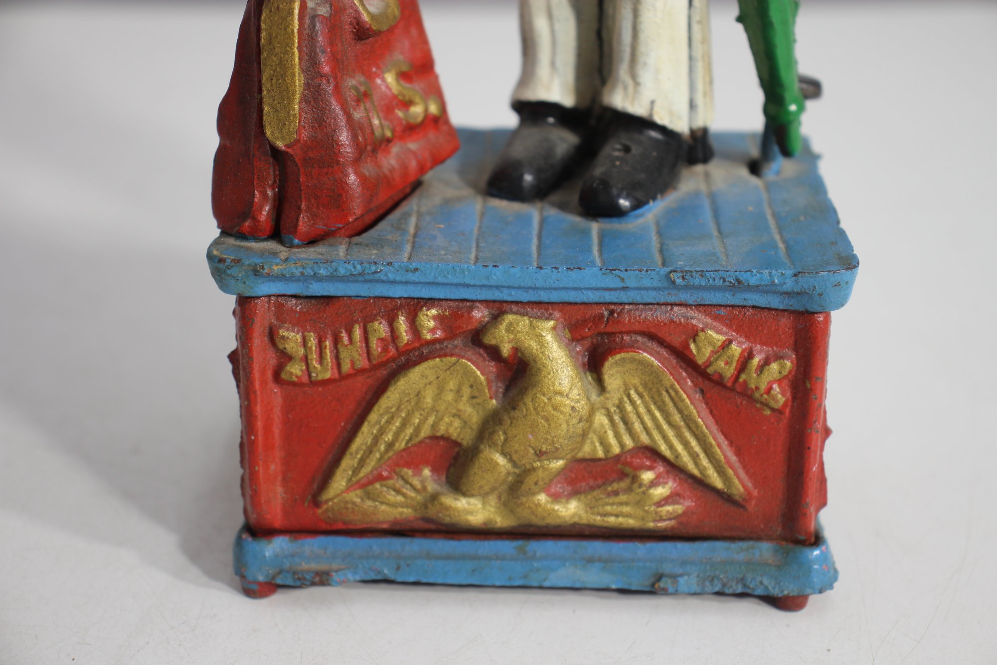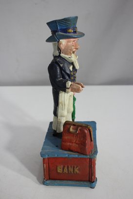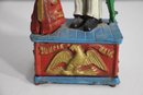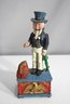 To operate, place a coin in Uncle Sam’s hand, push the lever, and watch as the coin drops into the bank.