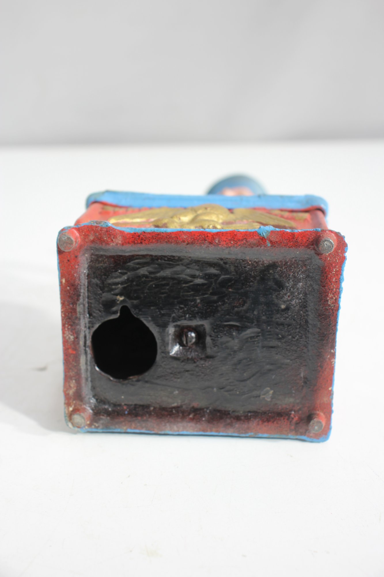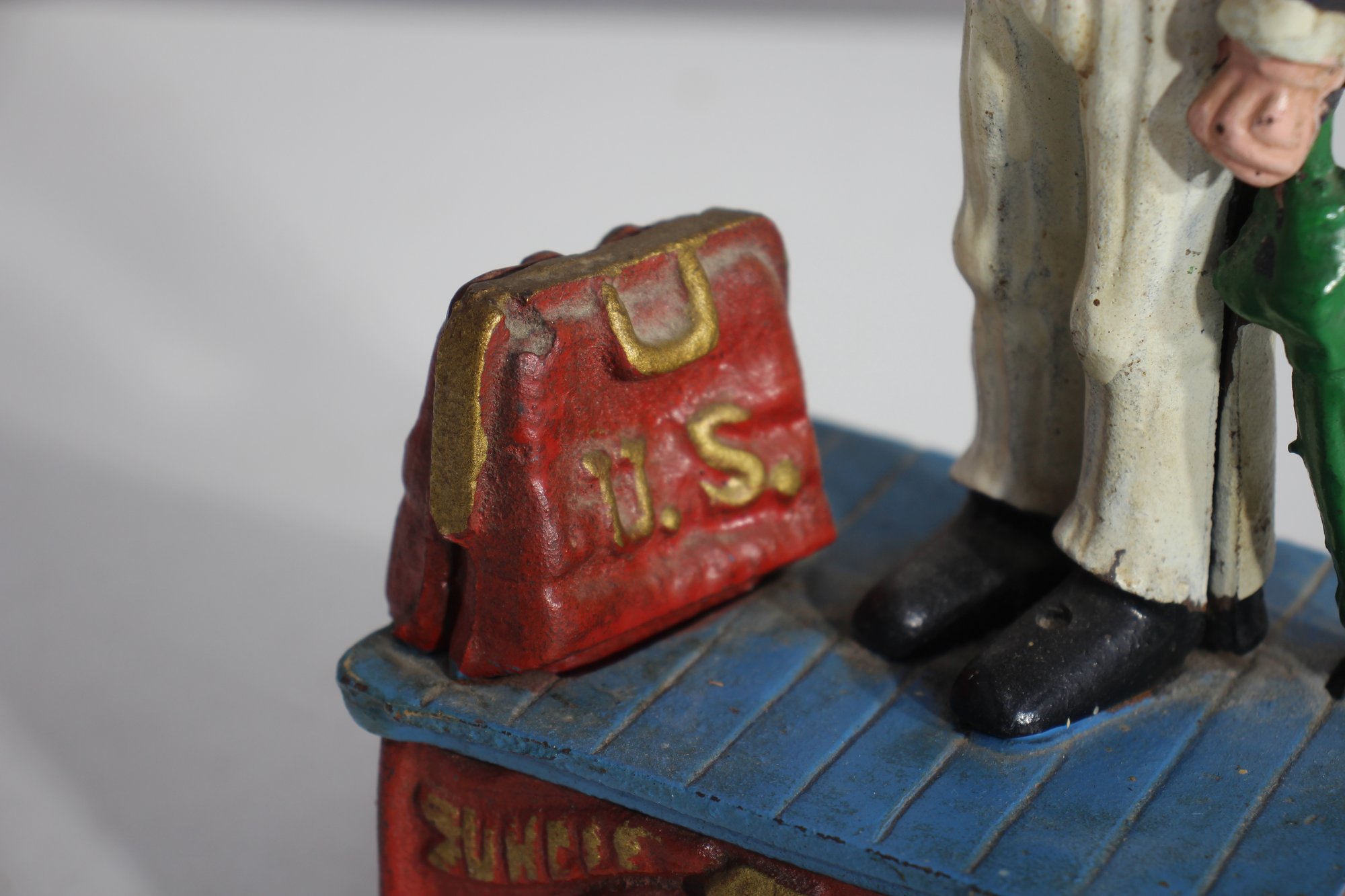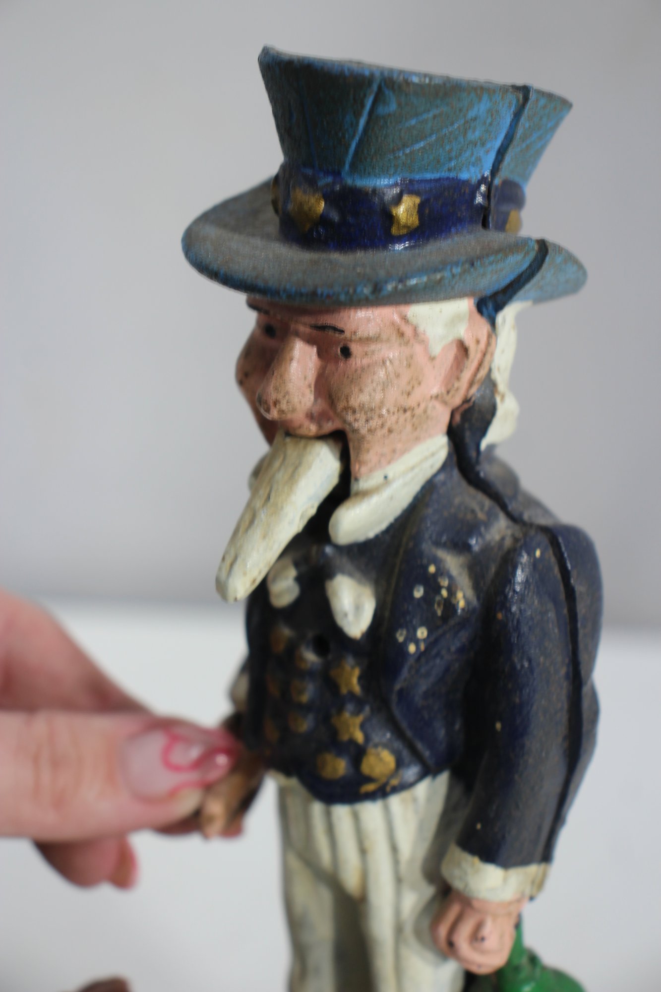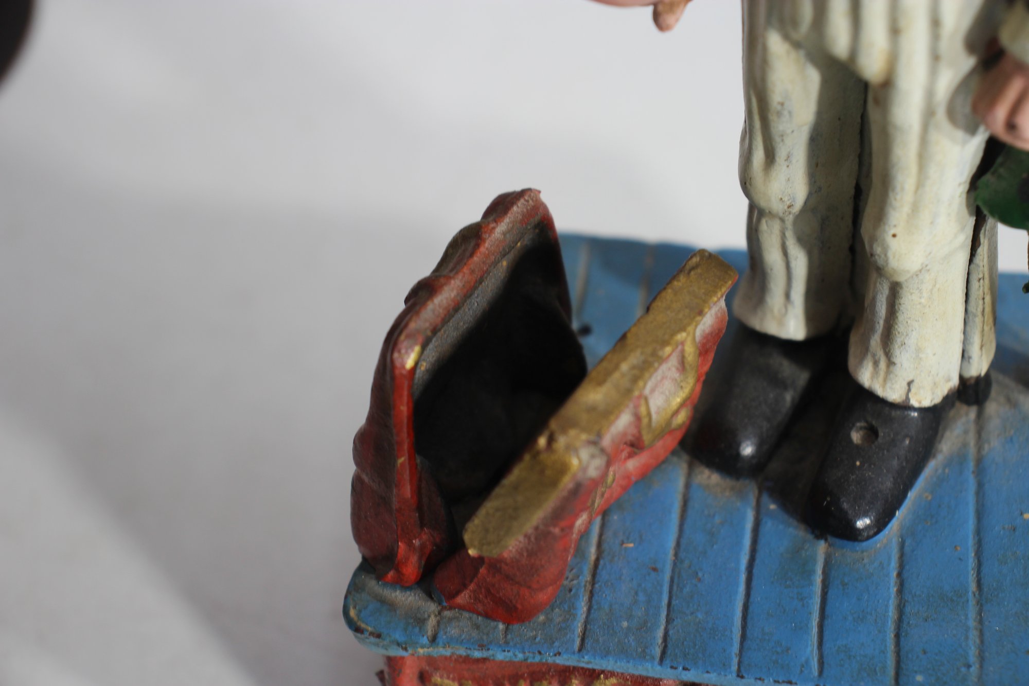 To operate, place a coin in Uncle Sam’s hand, push the lever, and watch as the coin drops into the bank.