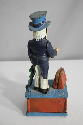This 11-inch tall cast iron mechanical Uncle Sam coin bank is a vintage-style reproduction of the classic 19th-century coin-operated bank. It features Uncle Sam in his traditional patriotic outfit, standing on a detailed base adorned with a golden eagle and a red bag marked "U.S.".