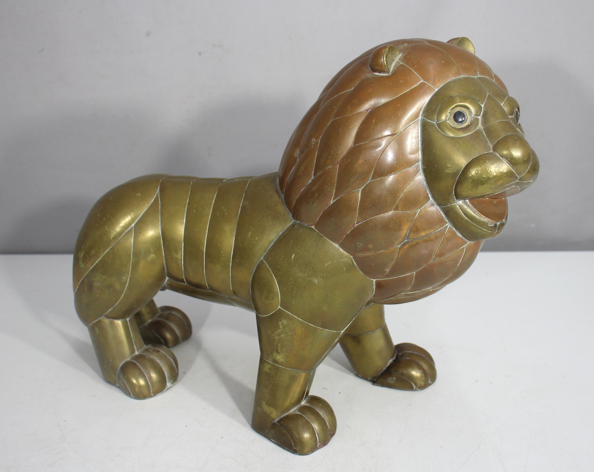 vintage brass and copper lion sculpture is a remarkable piece of handcrafted artistry. Measuring 12.5 inches tall and 18 inches long, this regal lion features an intricate patchwork design, combining brass and copper to create a bold and expressive look. The lion's detailed mane, expressive eyes, and strong stance make it a striking centerpiece for any collection.