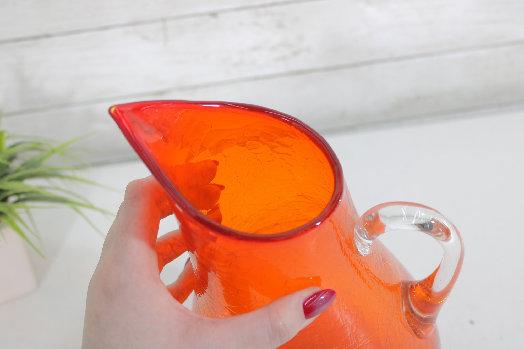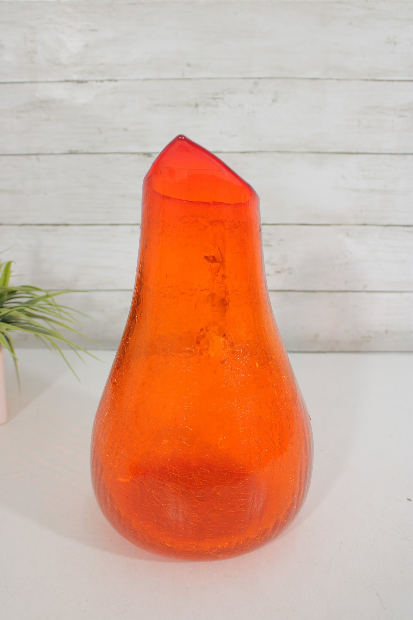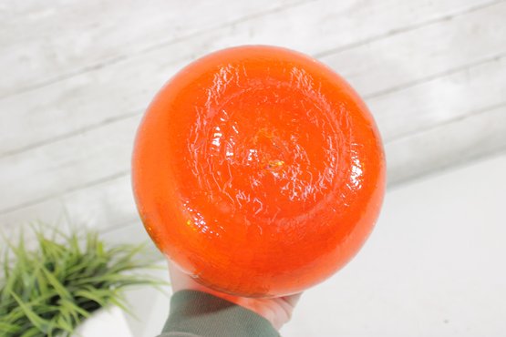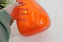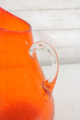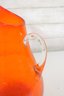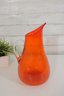 vintage hand blown art glass pitcher in a bold, vibrant orange hue. This eye-catching piece stands approximately 12 inches tall and features an elegant, elongated spout with a smooth, applied clear glass handle.