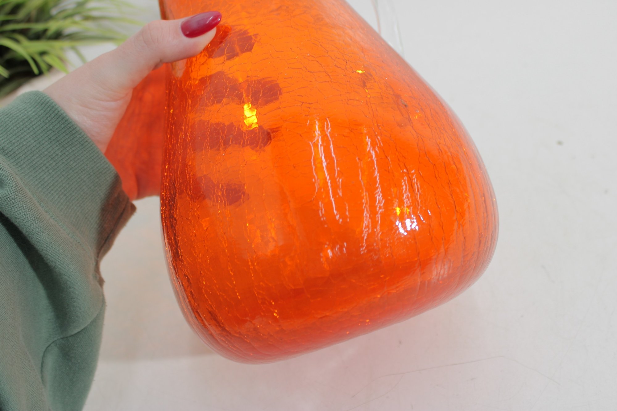 The body displays a beautiful textured appearance with subtle crackle-style patterning, giving it depth and character while enhancing how it reflects light. The organic form and handcrafted details make this a standout example of vintage studio art glass.