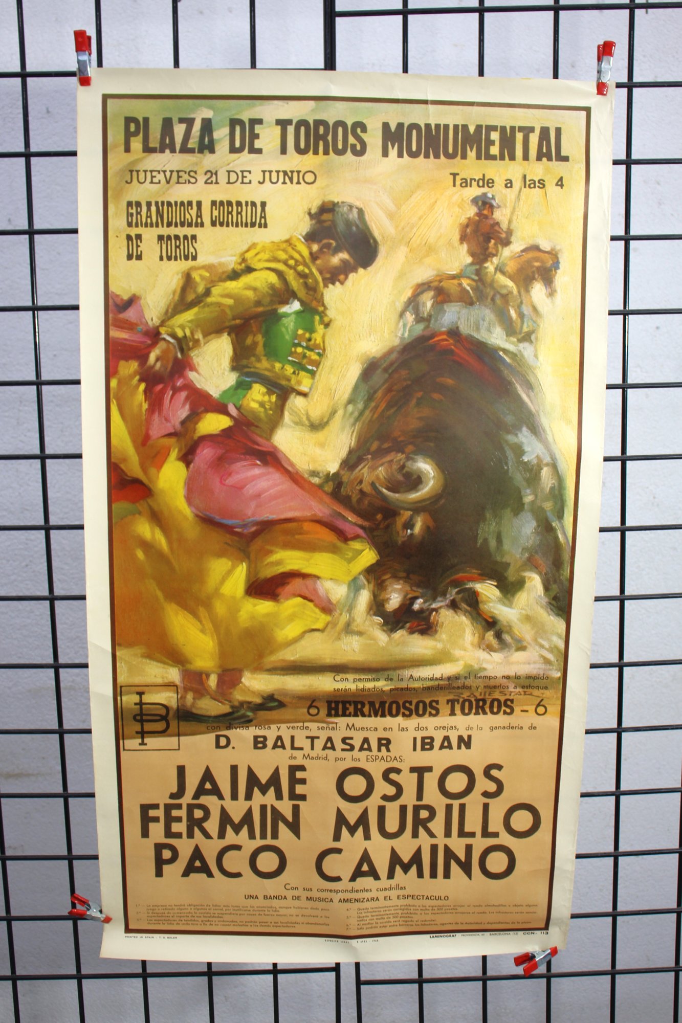 A vintage Plaza de Toros Monumental bullfighting poster dated June 21st, advertising a Grand Corrida de Toros. Featuring prominent bullfighters such as Jaime Ostos, Fermin Murillo, and Paco Camino. The dynamic imagery of the bullfight scene and traditional Spanish design make this a unique collectible. Poster shows light signs of aging, adding to its vintage charm.