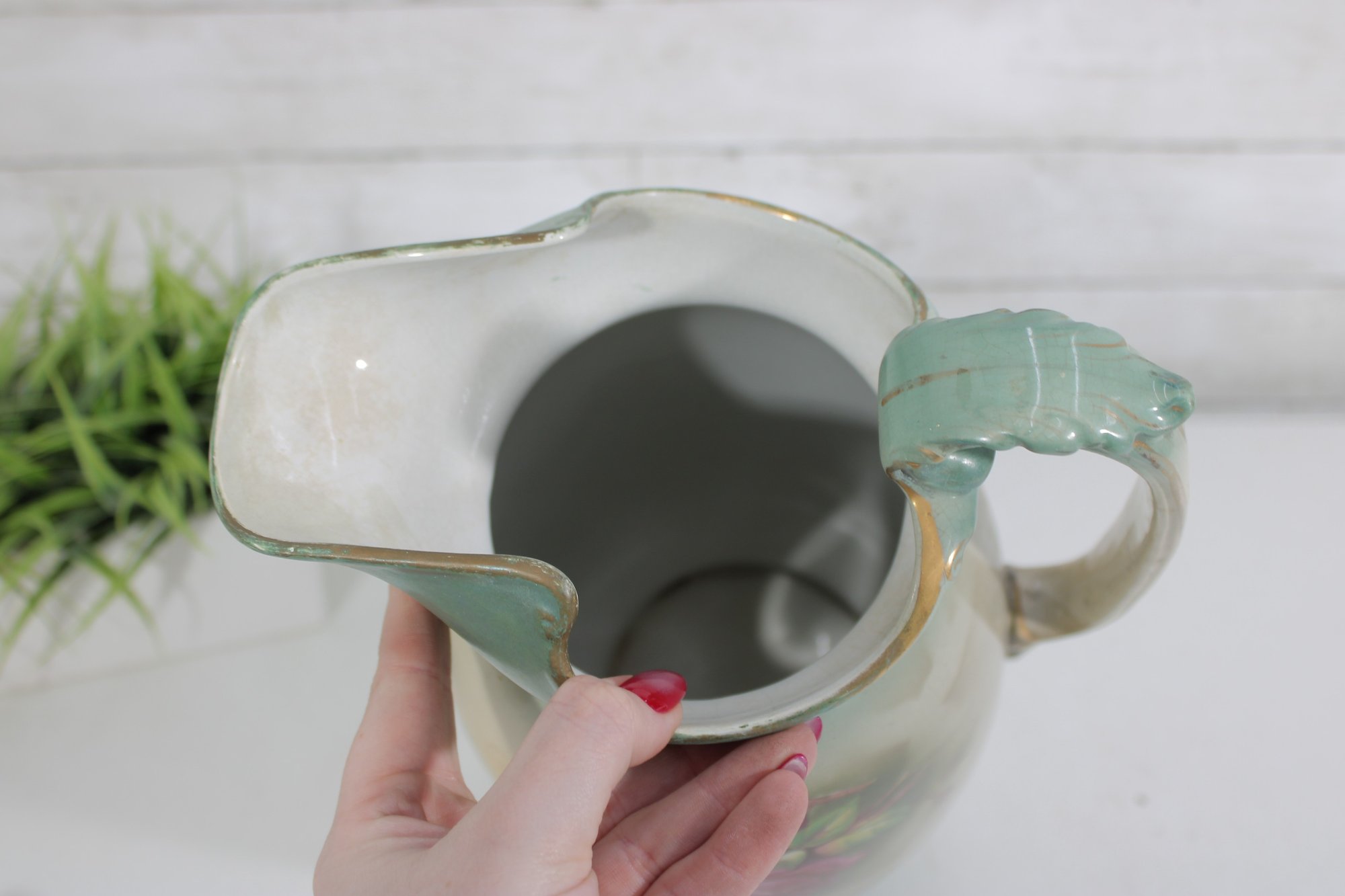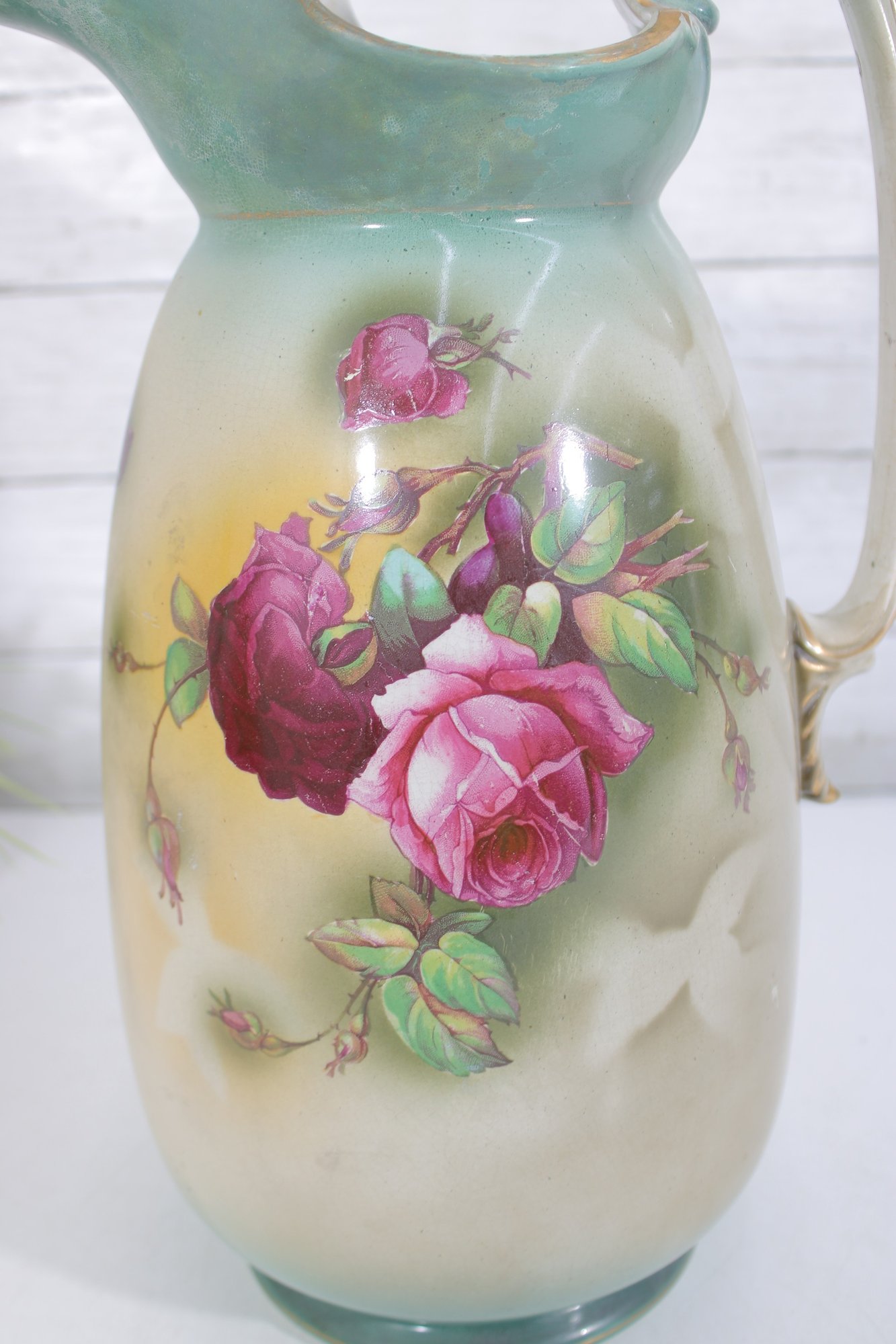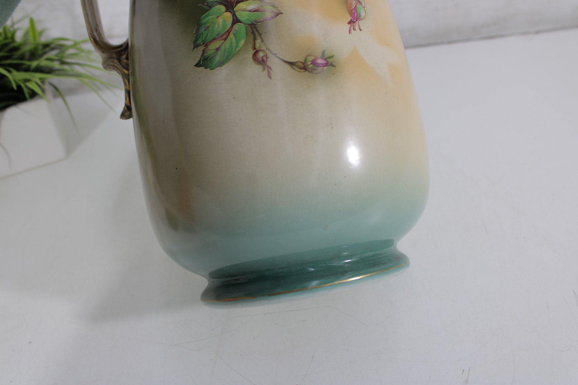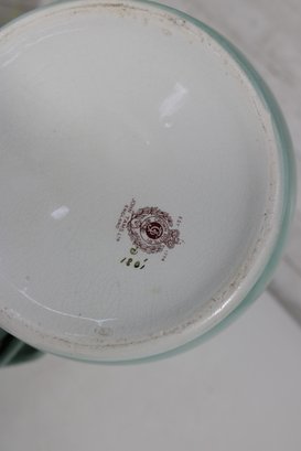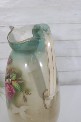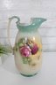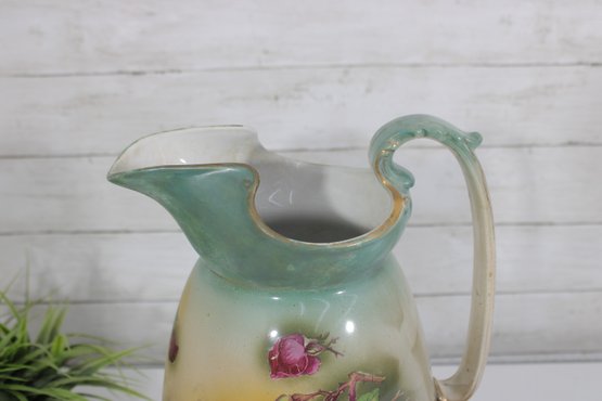 Beautiful vintage John Tams pottery pitcher, made in England, featuring an elegant hand-painted floral design. This large 14-inch pitcher showcases a soft cream body with a delicate green rim and handle, highlighted by a richly detailed bouquet of roses in warm pink and red tones.