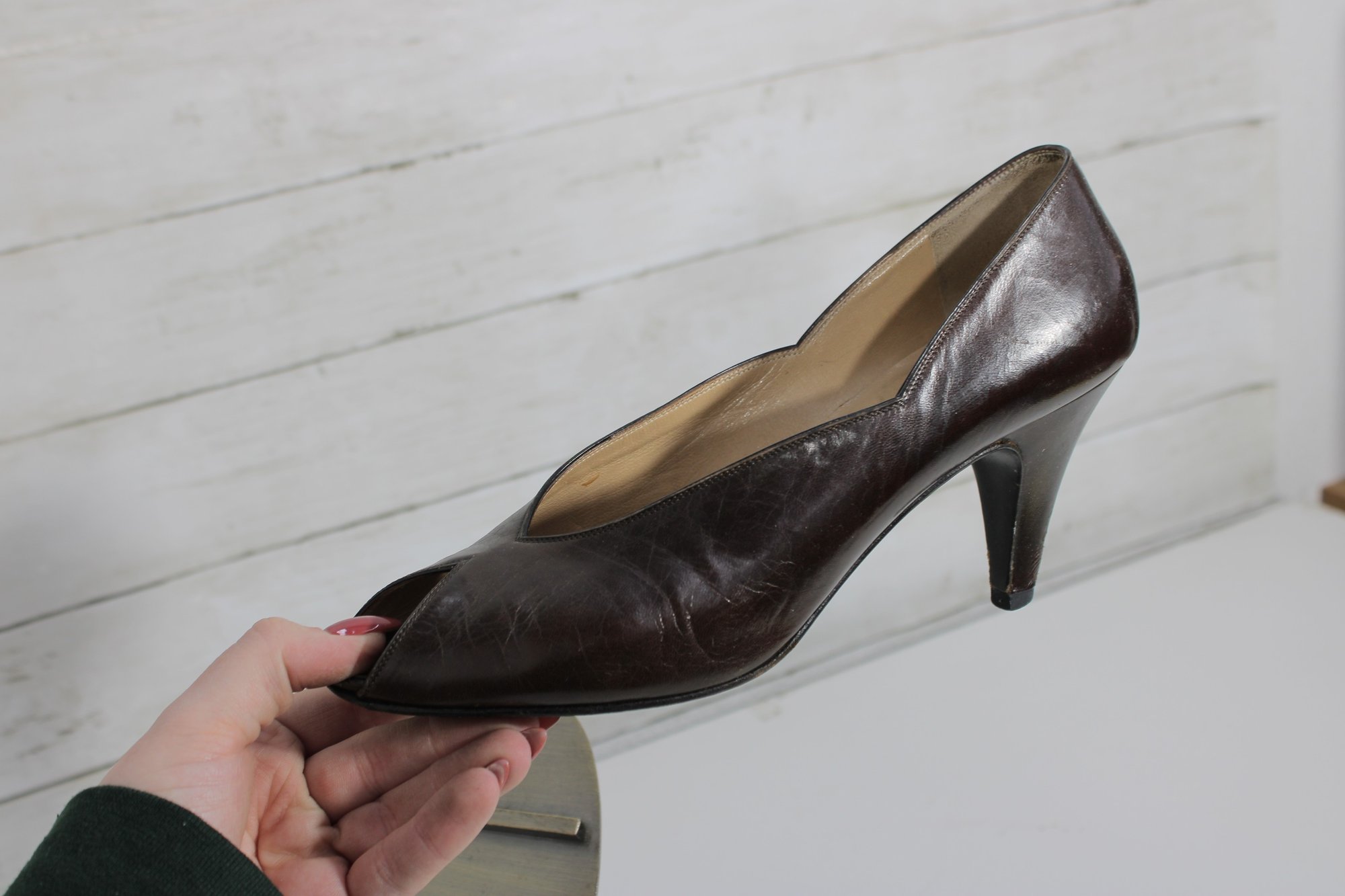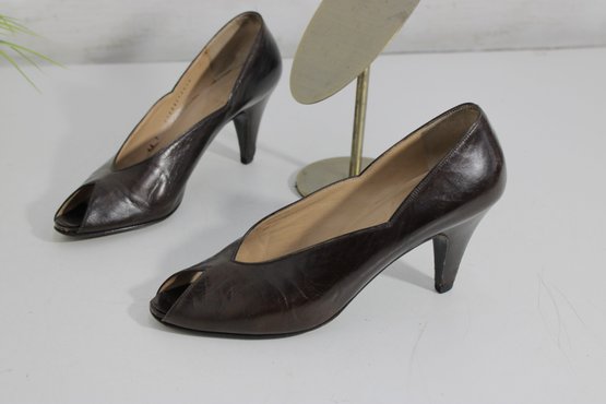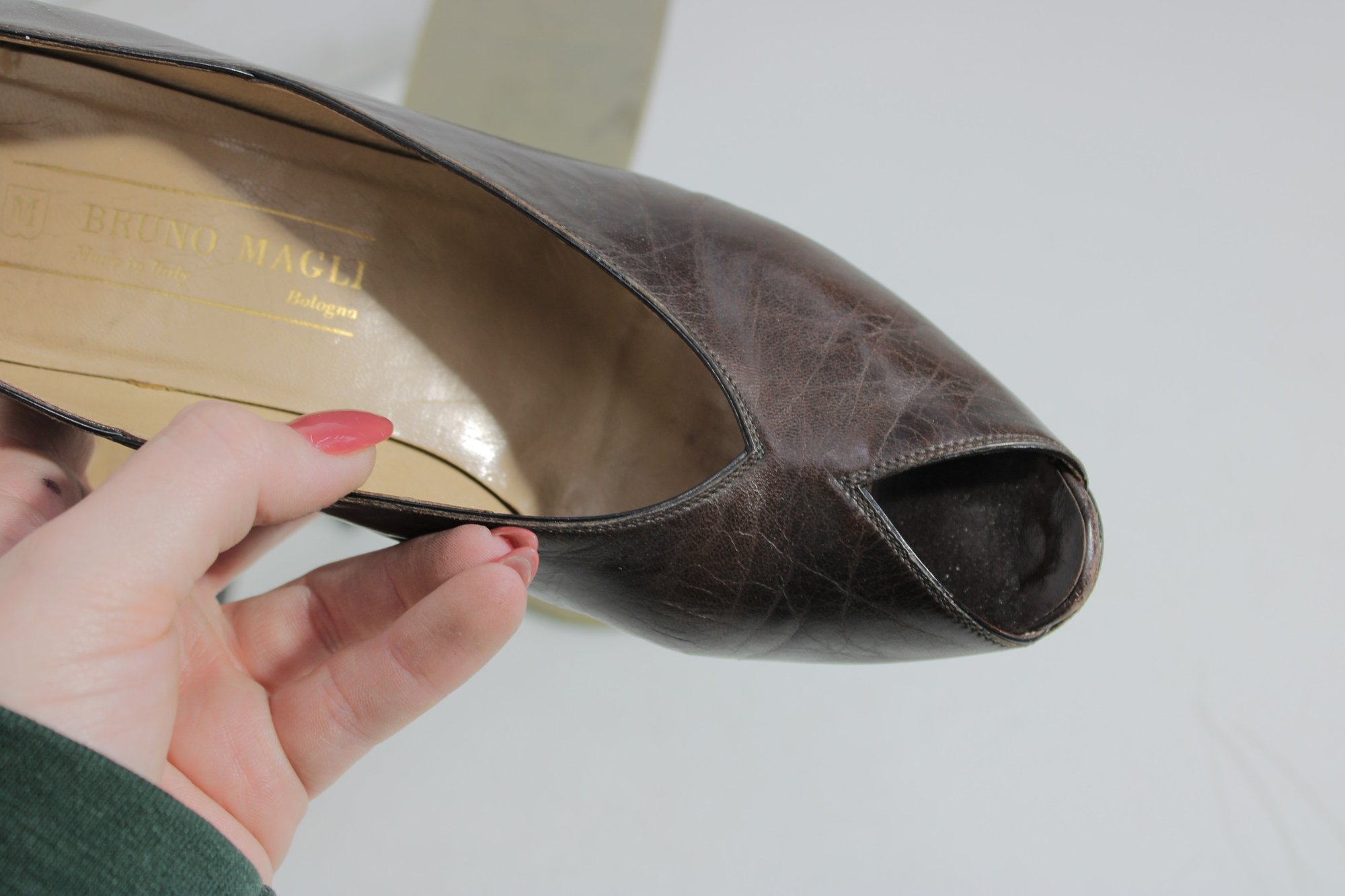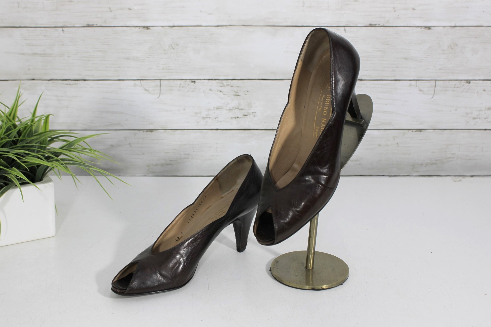 Bruno Magli peep-toe pumps crafted in Italy from rich brown leather. These classic heels feature a softly rounded peep-toe, graceful heel, and timeless silhouette—perfect for professional wear, special occasions, or refined everyday style.