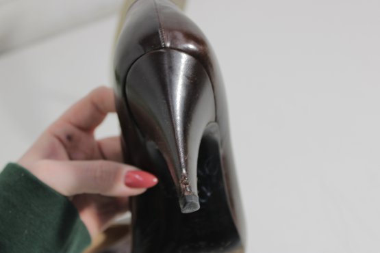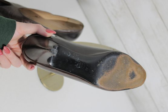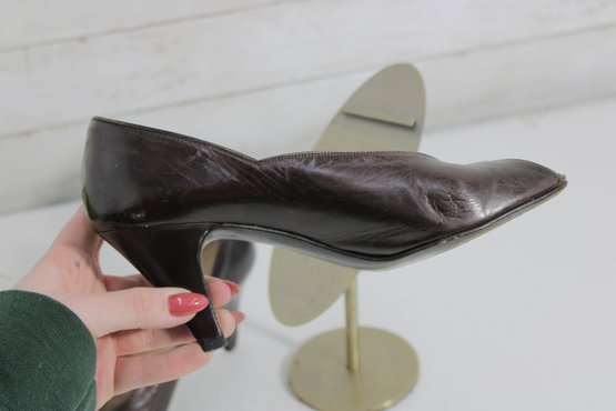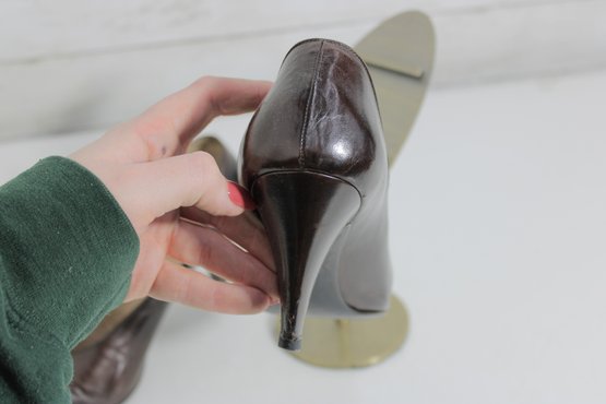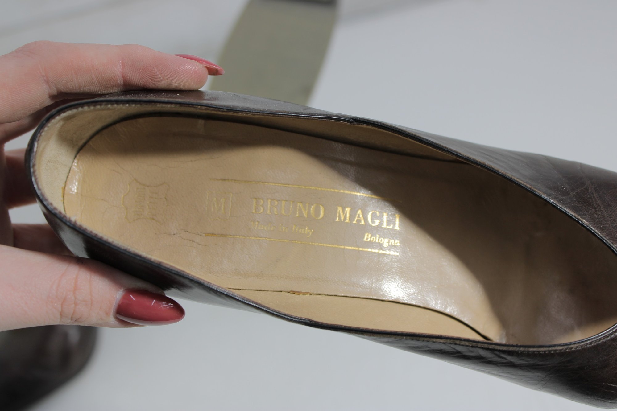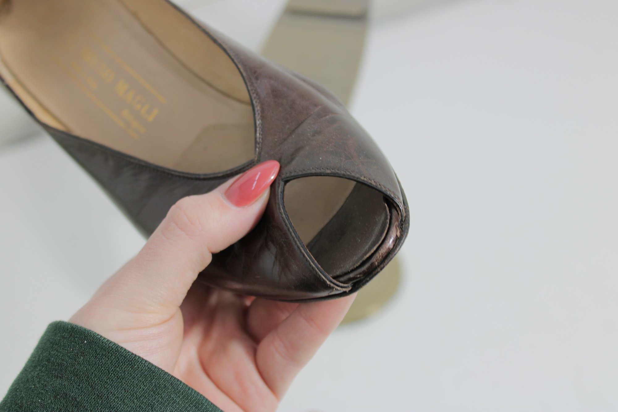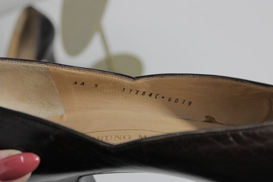 Bruno Magli peep-toe pumps crafted in Italy from rich brown leather. These classic heels feature a softly rounded peep-toe, graceful heel, and timeless silhouette—perfect for professional wear, special occasions, or refined everyday style.