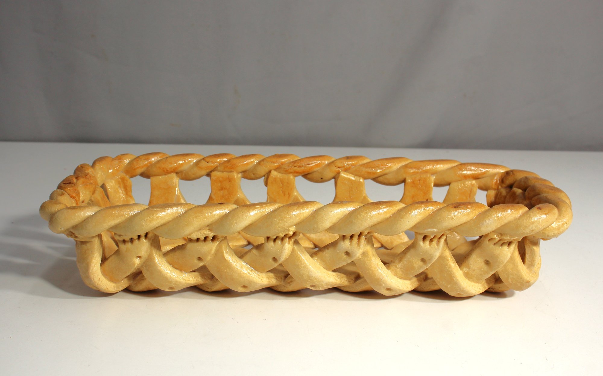 Bring a touch of rustic elegance to your home with this 15"x 6" handcrafted ceramic lattice bread basket. Perfect for serving bread, rolls, or as a decorative piece, this basket features: