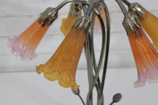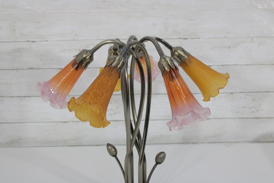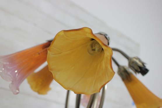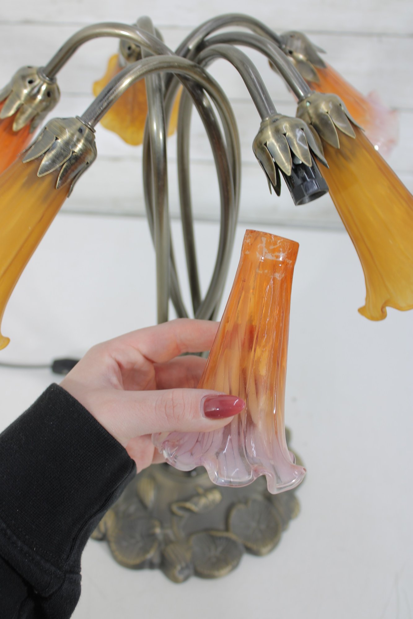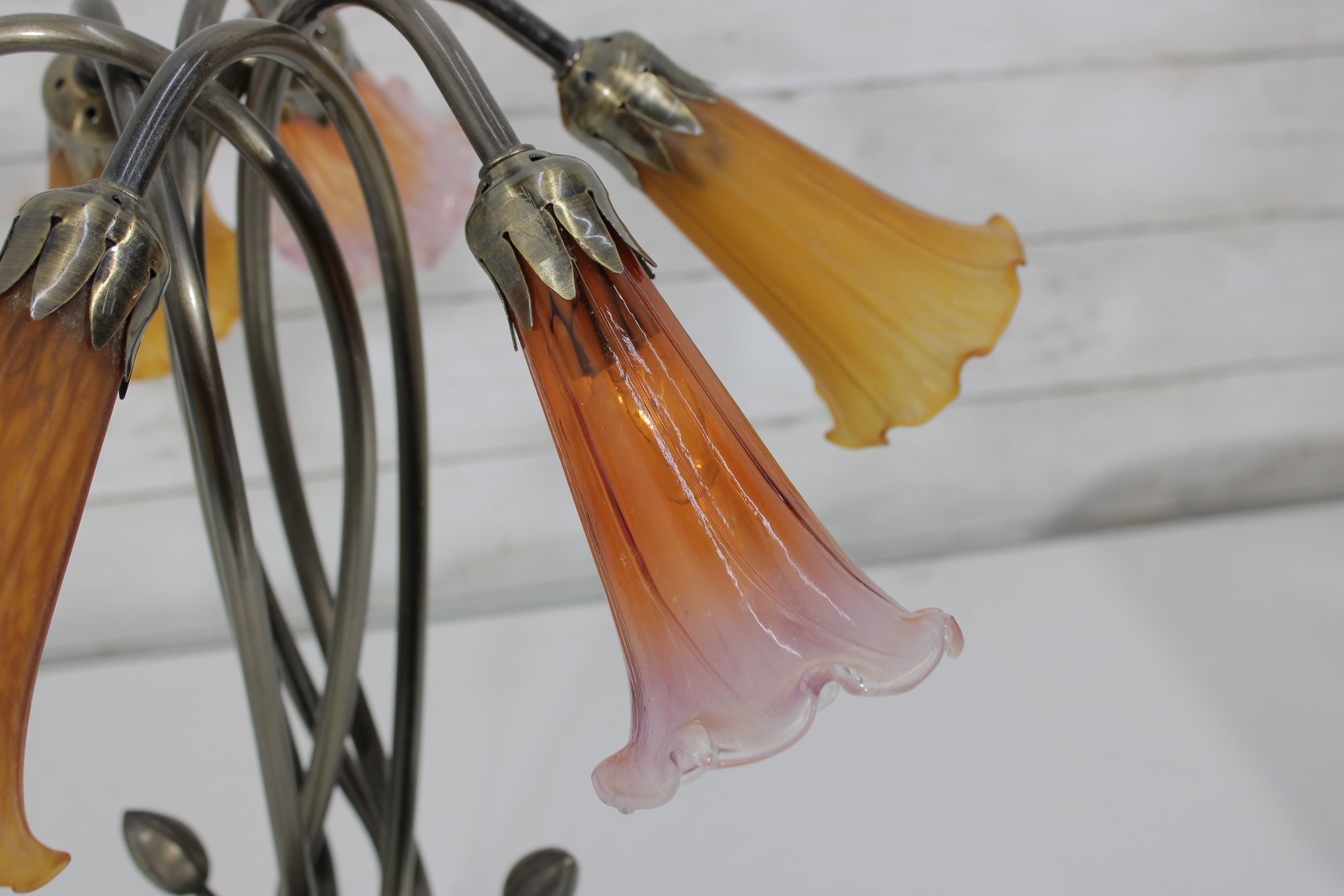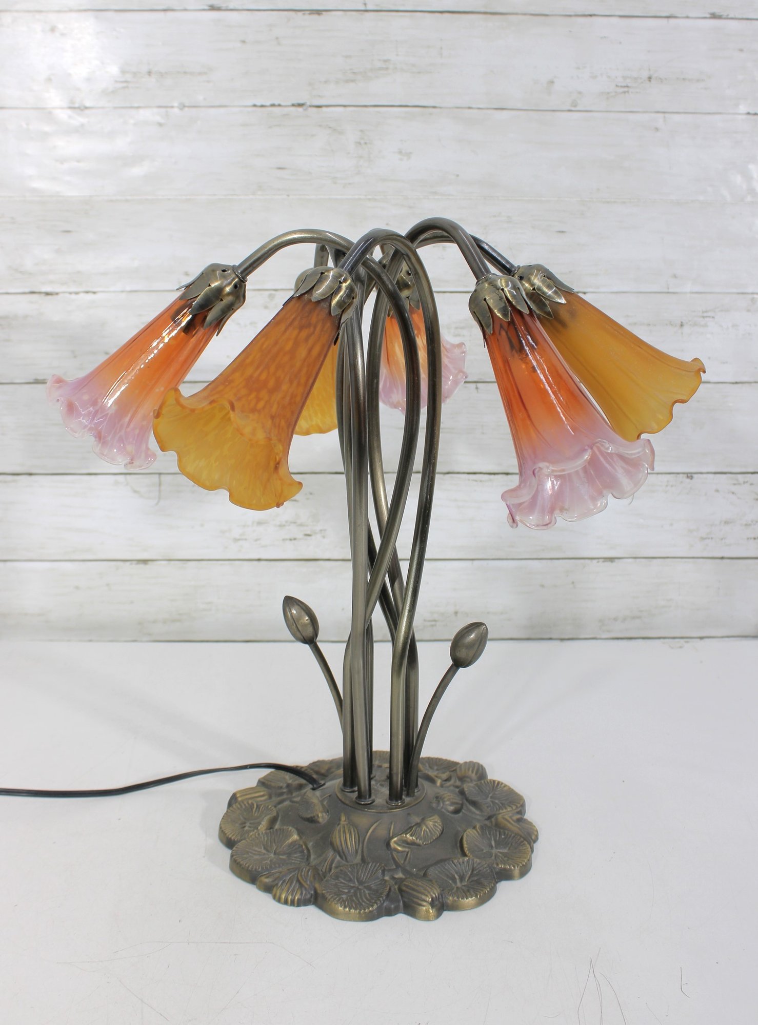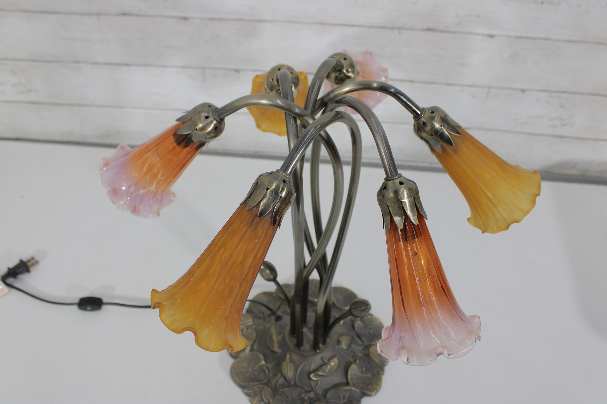 this Art Nouveau–style table lamp brings a soft floral glow to any space. Standing 16 inches tall, the lamp features gracefully arching metal stems topped with tulip-shaped glass shades in warm amber and blush pink tones. Each shade resembles a blooming flower, creating a beautiful bouquet effect when illuminated.