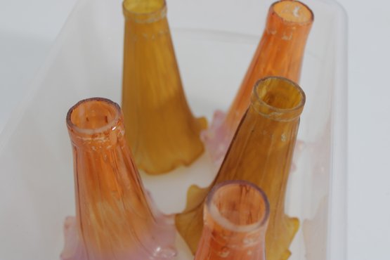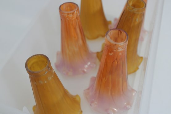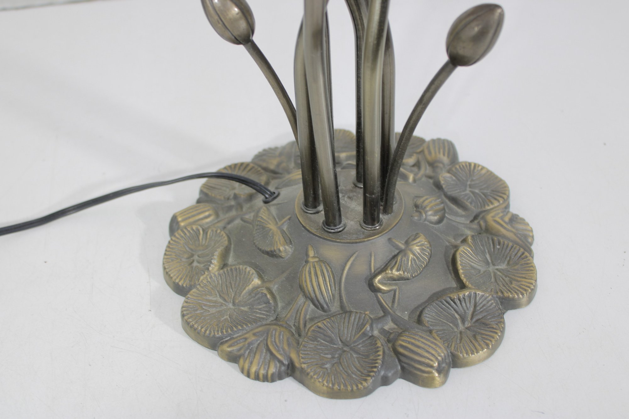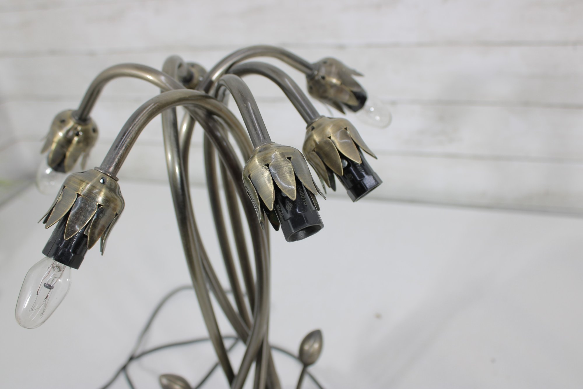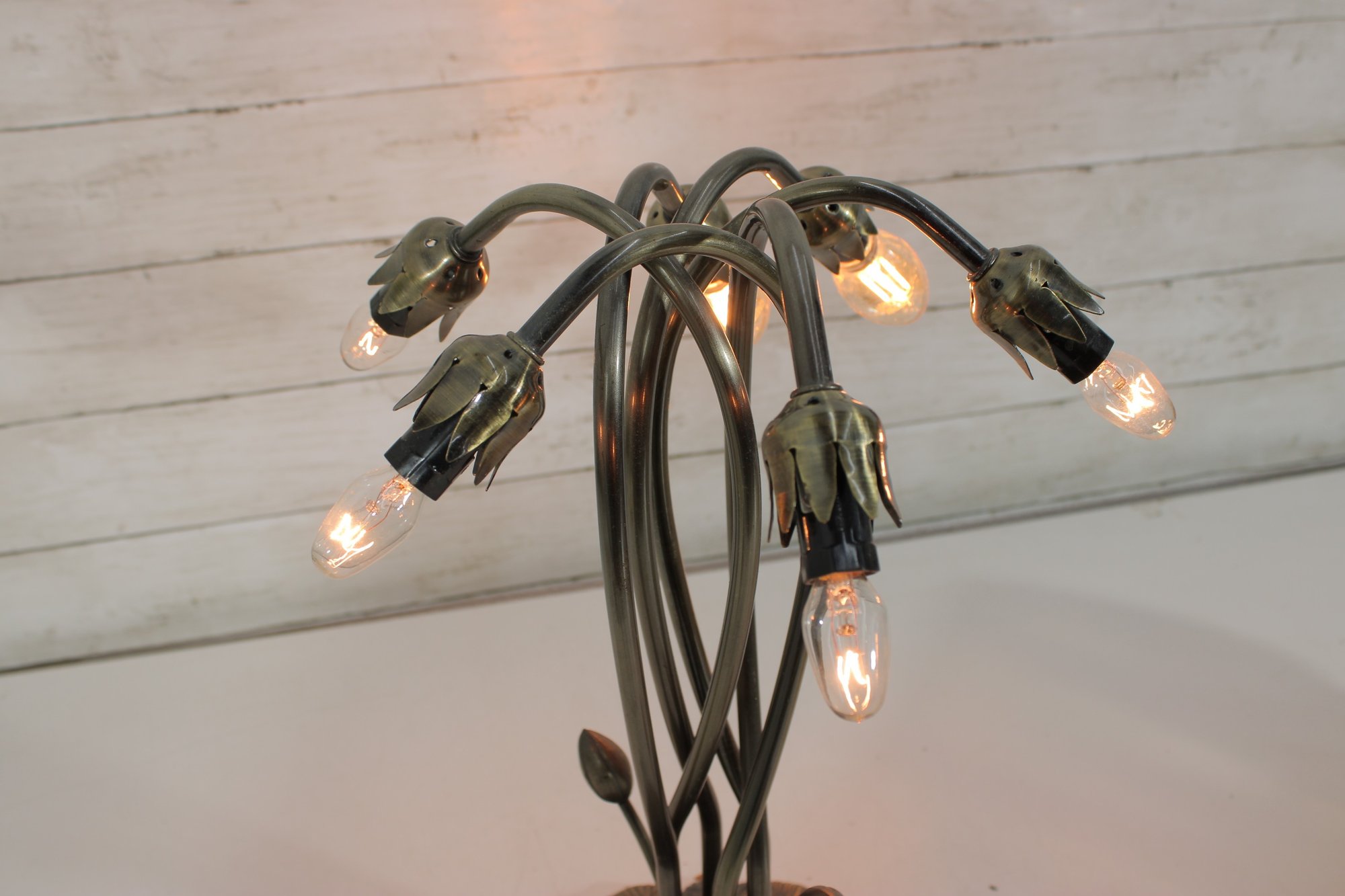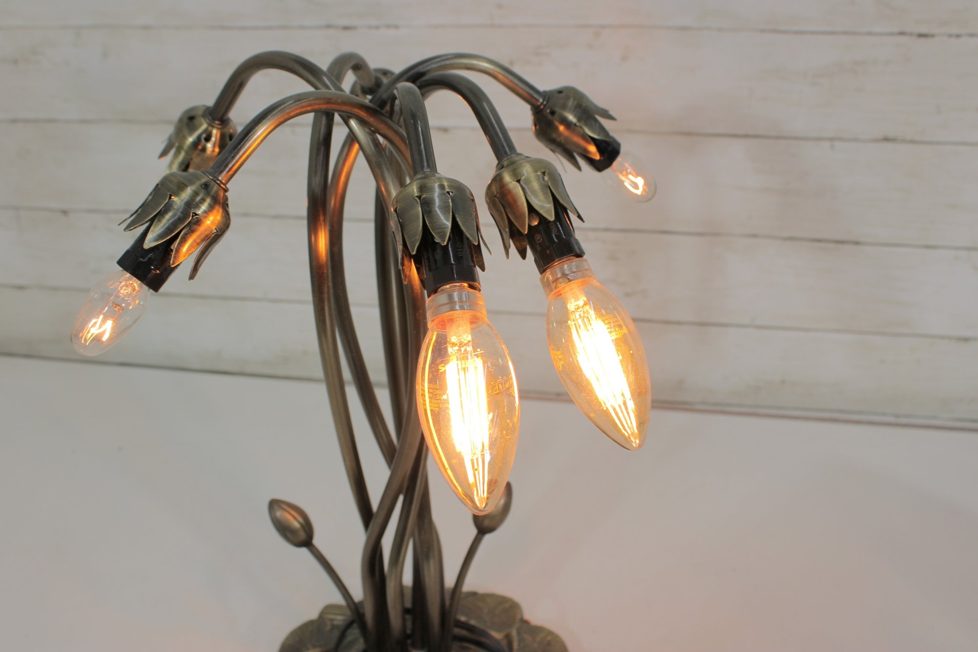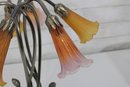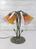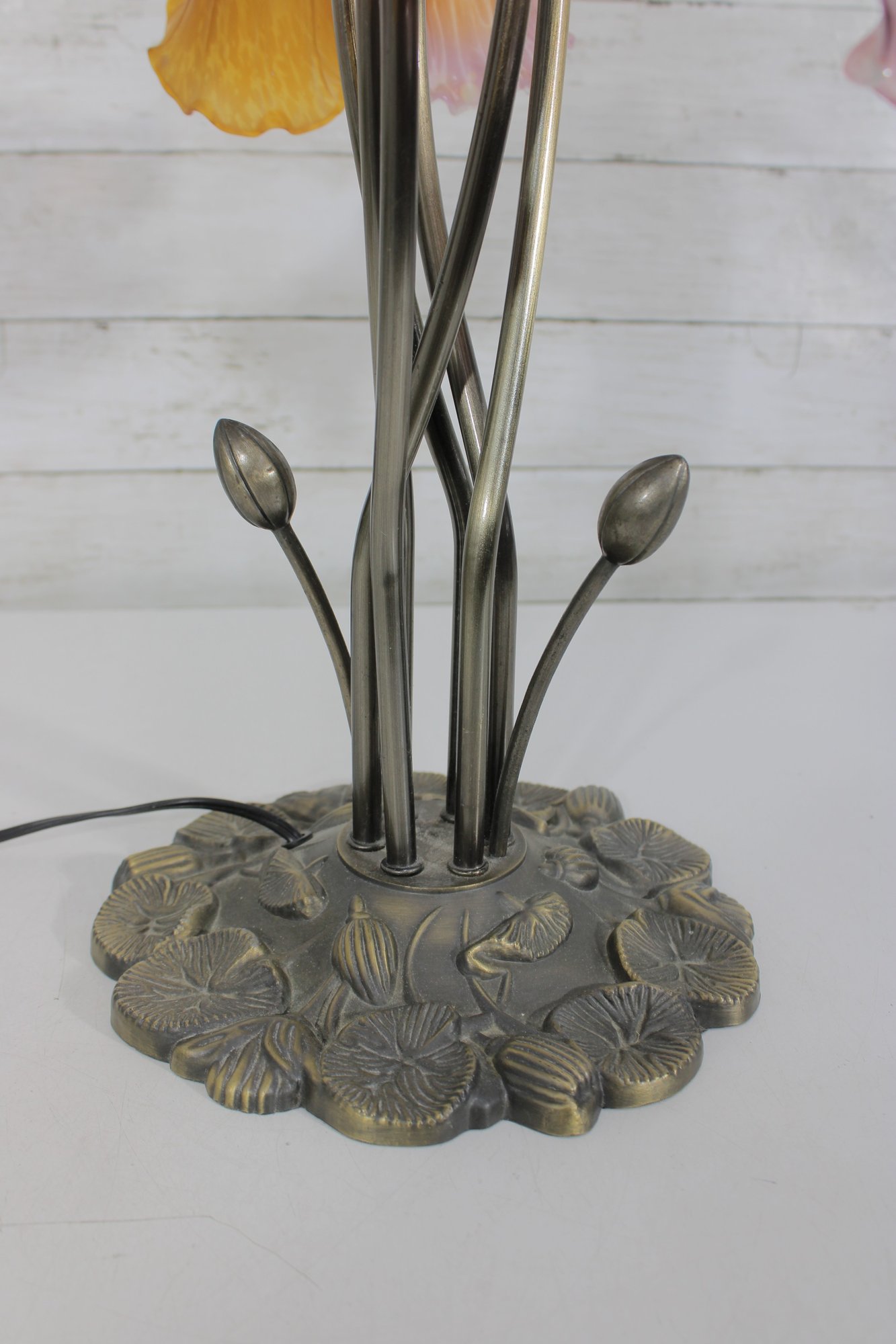 this Art Nouveau–style table lamp brings a soft floral glow to any space. Standing 16 inches tall, the lamp features gracefully arching metal stems topped with tulip-shaped glass shades in warm amber and blush pink tones. Each shade resembles a blooming flower, creating a beautiful bouquet effect when illuminated.