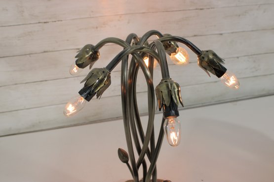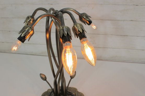 The sculptural base is adorned with flowing botanical details, perfectly complementing the organic form of the lamp. When lit, the shades emit a warm, romantic glow that makes this piece ideal for a bedroom, vanity, side table, or cozy reading nook.