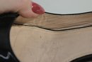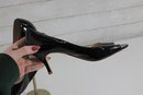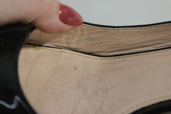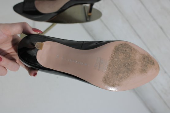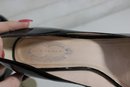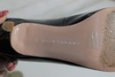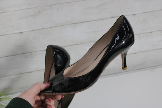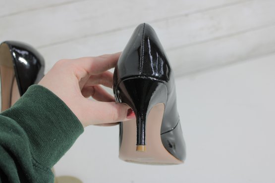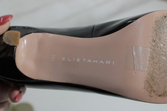 Sophisticated Elie Tahari pumps crafted in glossy black patent leather, featuring a sleek pointed toe and elegant slim heel. These timeless heels offer a polished, professional look that transitions effortlessly from office wear to evening events.