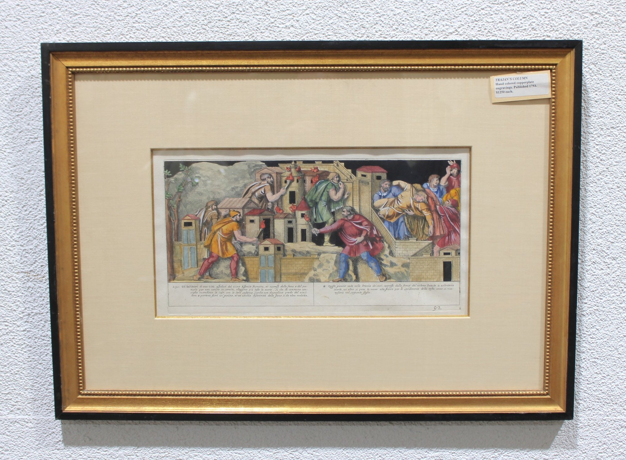an impressive hand-colored copperplate engraving of Trajan’s Column, published in 1793, depicting the famous Roman monument and its detailed narrative reliefs. The engraving illustrates scenes from the Dacian Wars, rendered with fine linework and period hand coloring typical of late 18th-century classical engravings.