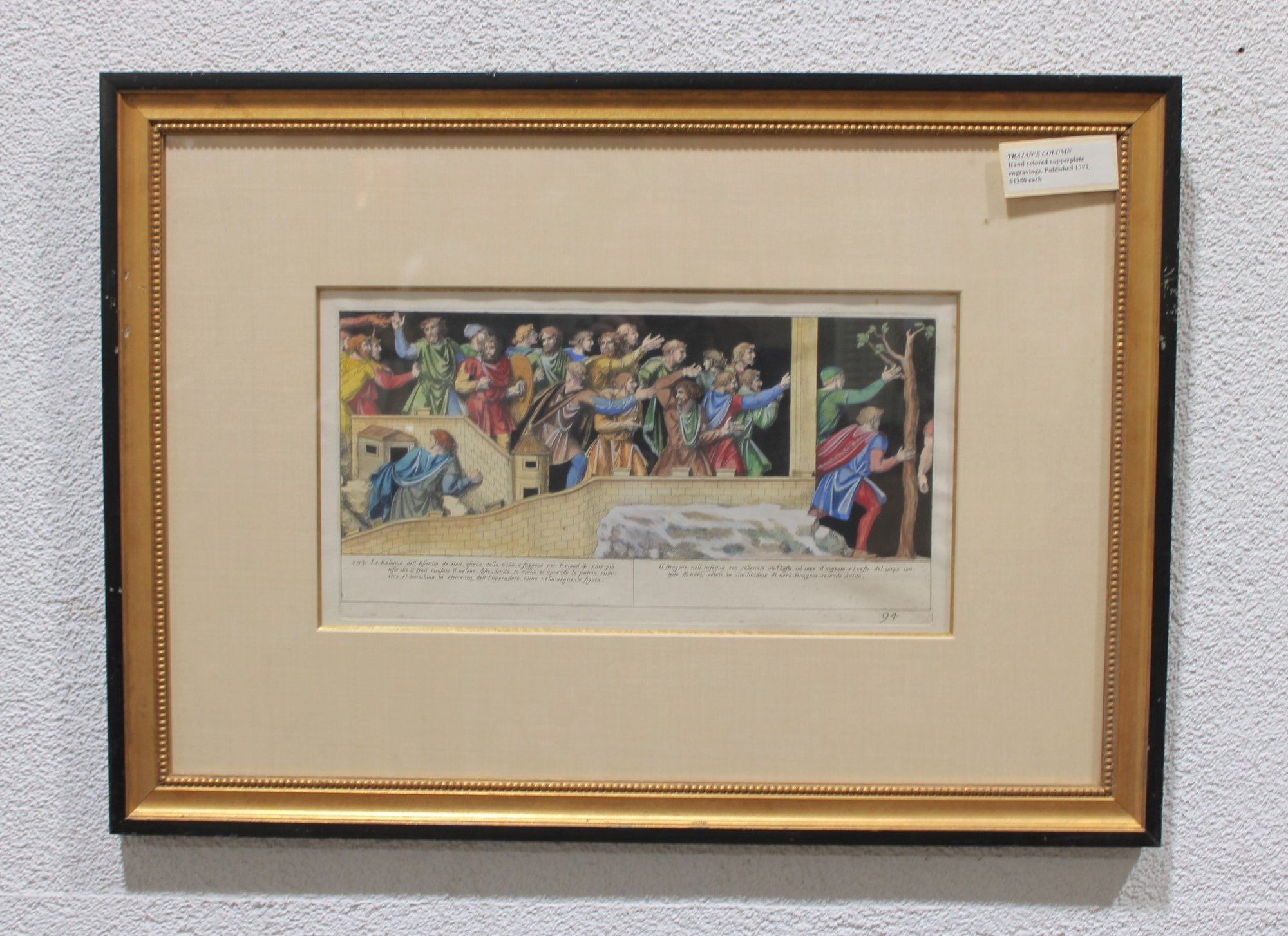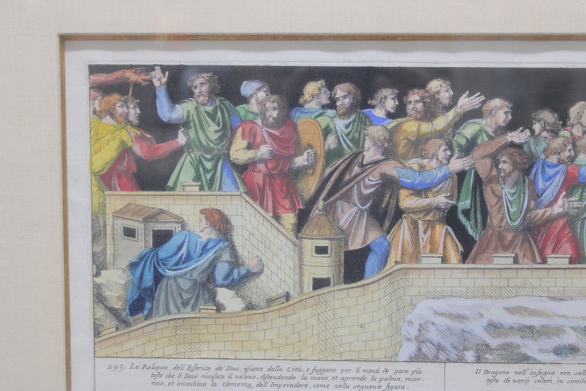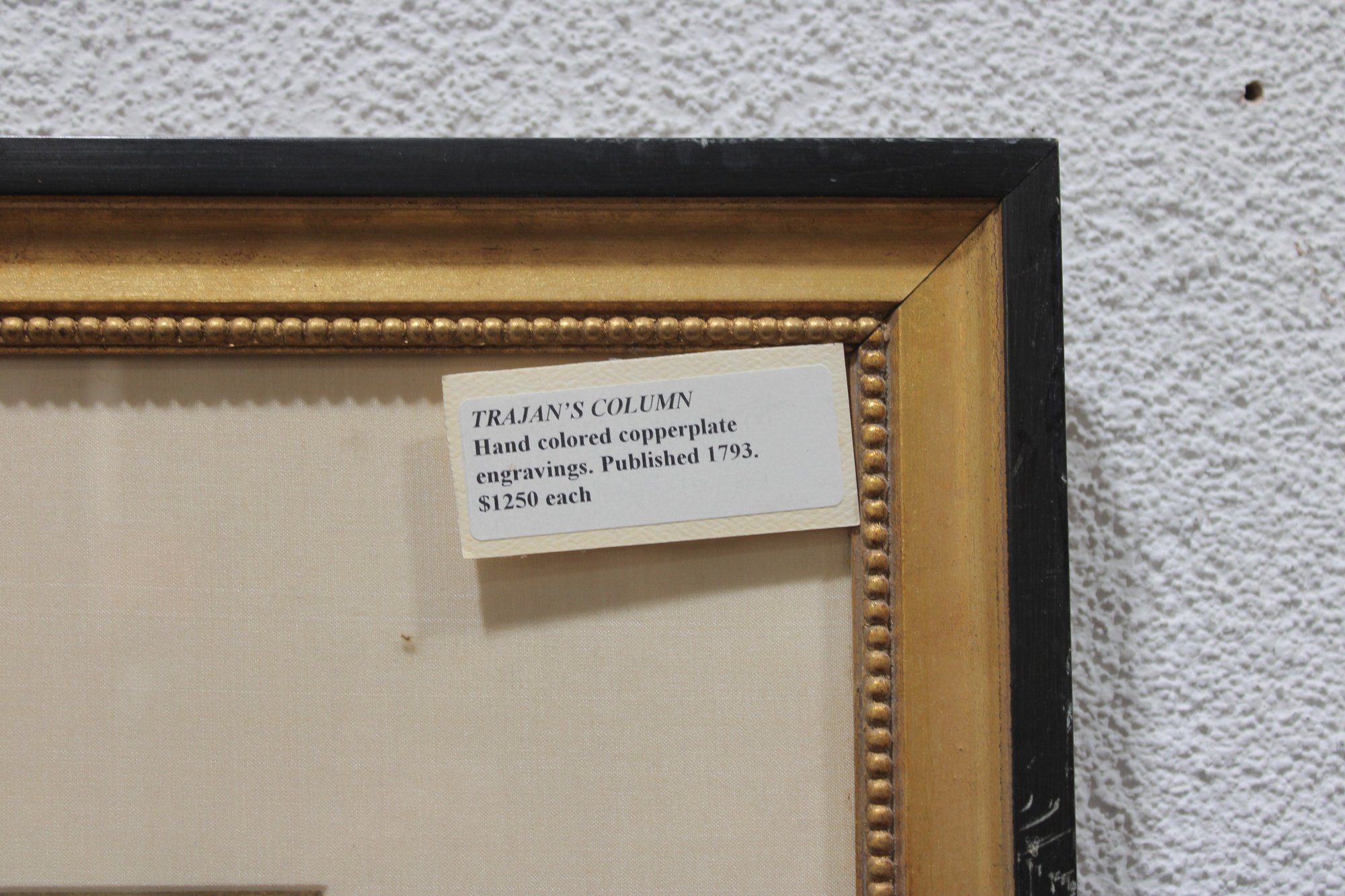 hand-colored copperplate engraving of Trajan’s Column, published in 1793, featuring a detailed narrative scene from the celebrated Roman monument. The engraving captures figures in dynamic motion with finely executed linework and period hand coloring, illustrating the storytelling reliefs that chronicle events from the Dacian Wars.