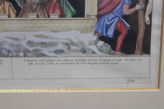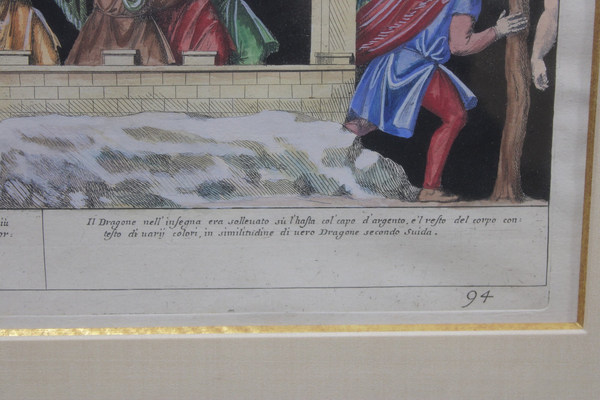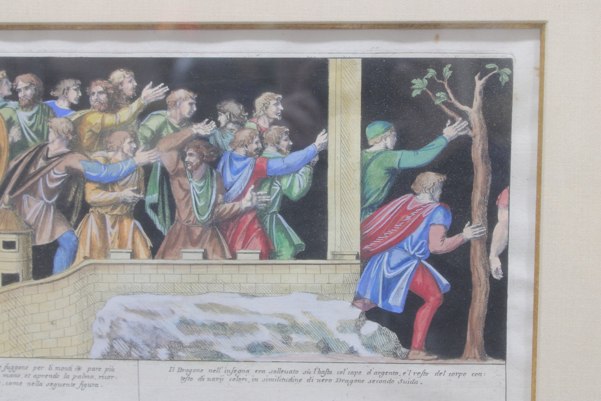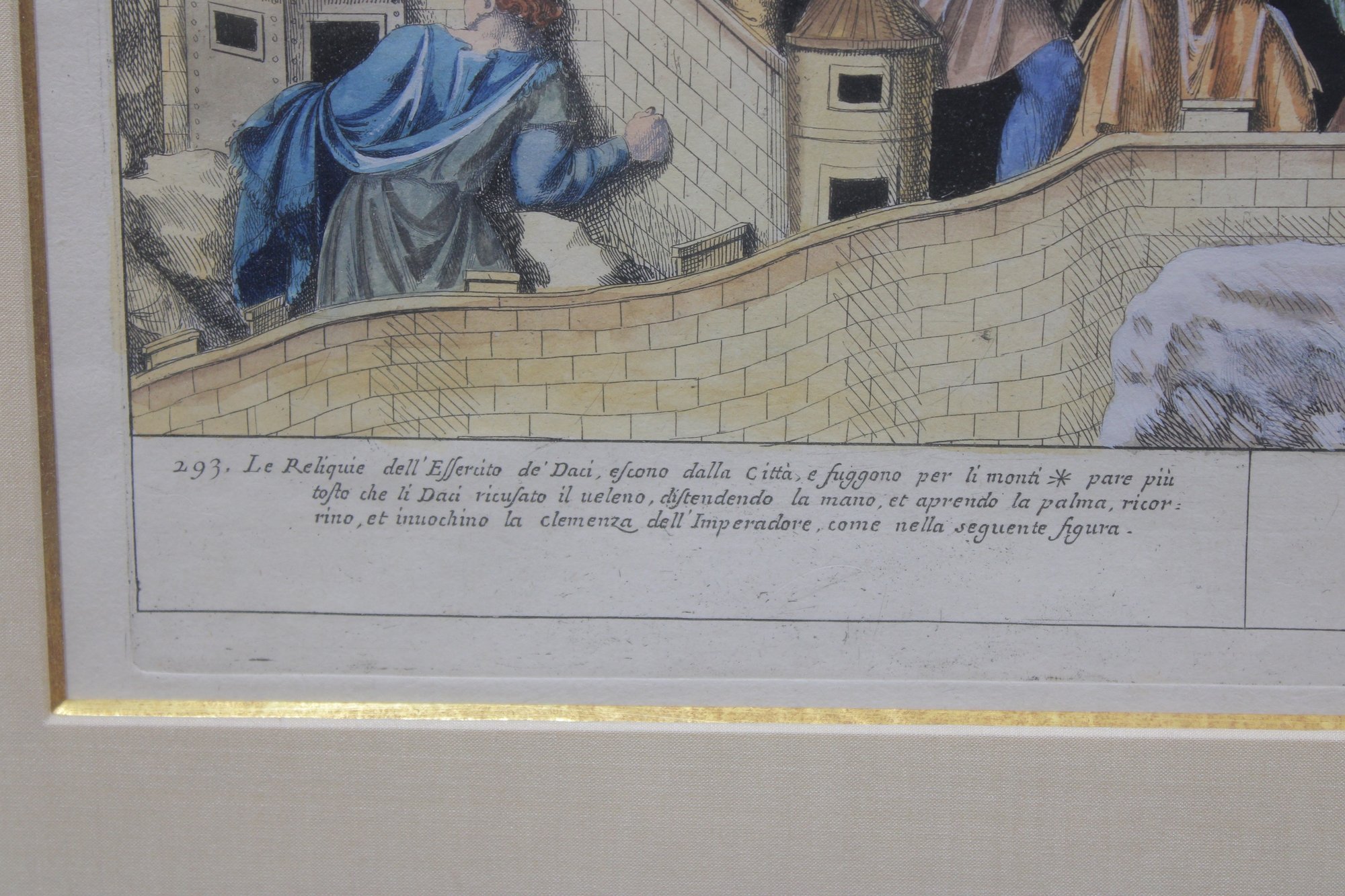 hand-colored copperplate engraving of Trajan’s Column, published in 1793, featuring a detailed narrative scene from the celebrated Roman monument. The engraving captures figures in dynamic motion with finely executed linework and period hand coloring, illustrating the storytelling reliefs that chronicle events from the Dacian Wars.