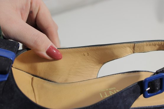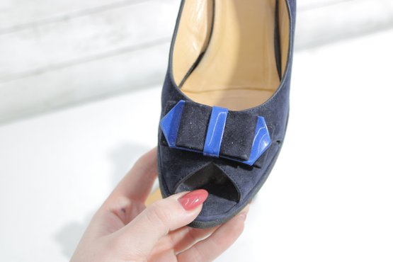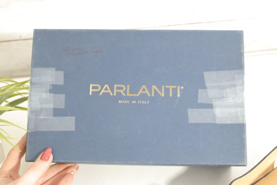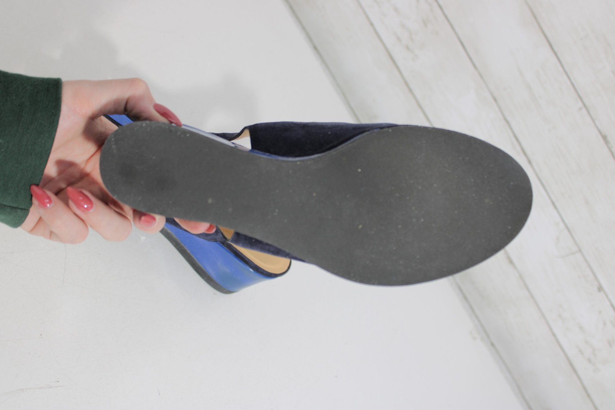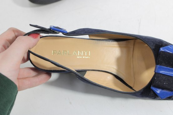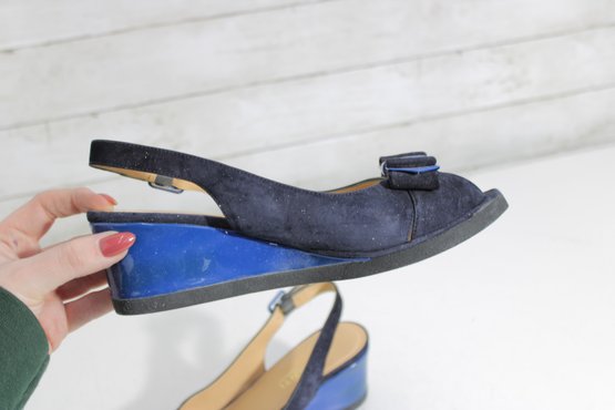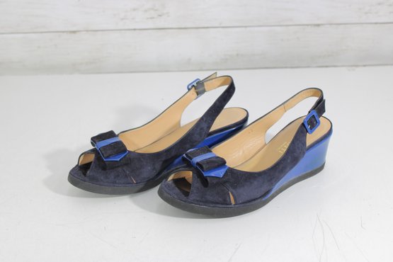 Beautiful Parlanti wedge sandals crafted in Italy, featuring rich blue suede uppers with matching blue wedge heels and elegant buckle accents at the toe and ankle strap. These slingback sandals offer a stylish blend of comfort and sophistication, perfect for spring and summer wear.