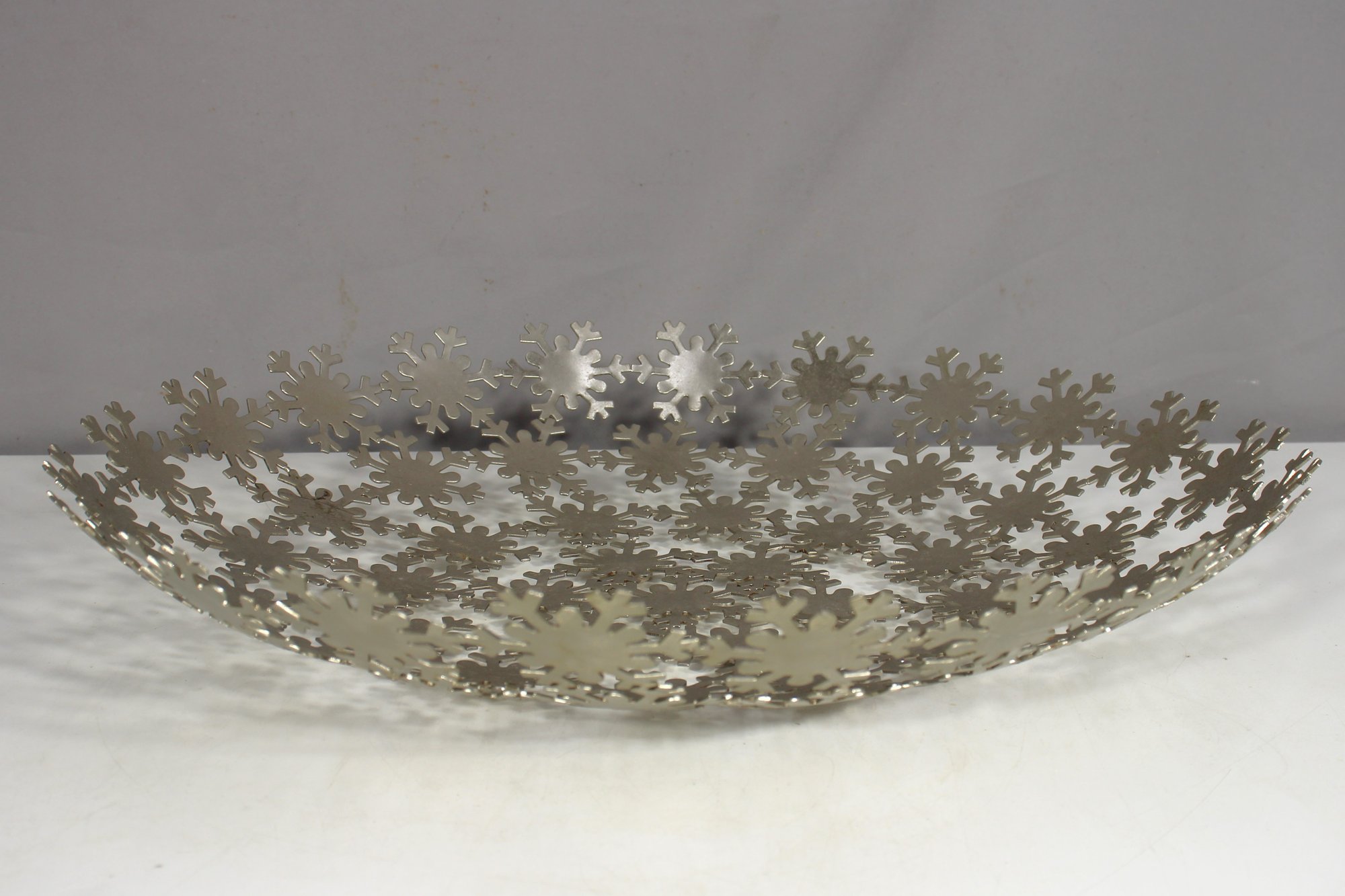 a stunning 18-inch diameter metal bowl featuring an intricate snowflake pattern design. This modern and artistic centerpiece is crafted from cut-out stainless steel, creating a visually striking openwork design that adds elegance to any table setting.