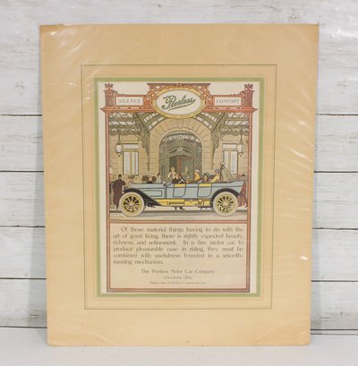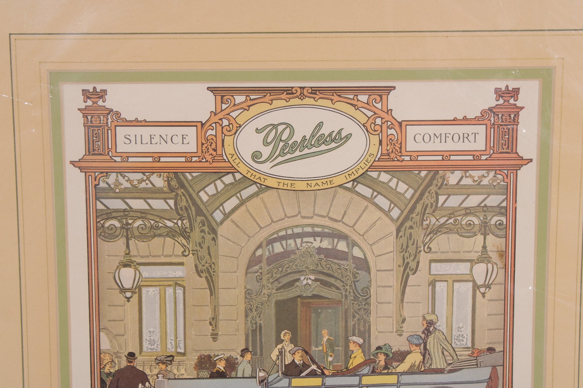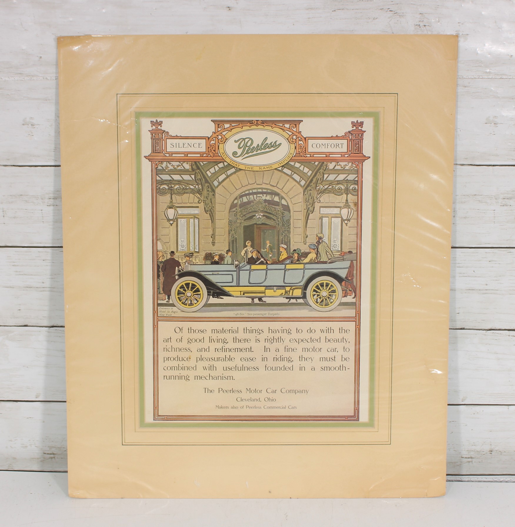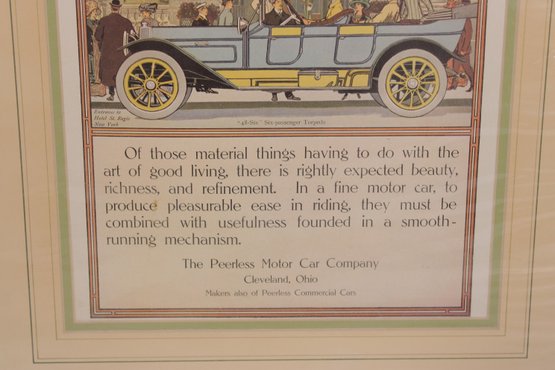 The lower portion of the print contains original advertising text describing the refinement and engineering of the Peerless motor car, along with company identification: Peerless Motor Car Company, Cleveland, Ohio.