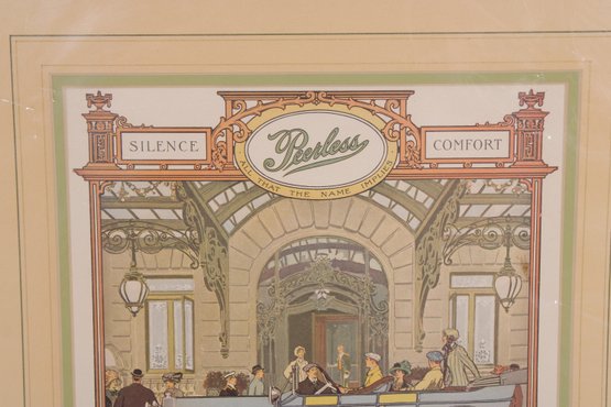 This richly illustrated piece captures the elegance and sophistication of early American automotive history, with a finely dressed crowd and a classic open touring car prominently displayed. The artwork includes period typography and slogans such as “Silence” and “Comfort,” reinforcing the luxury branding of Peerless automobiles.