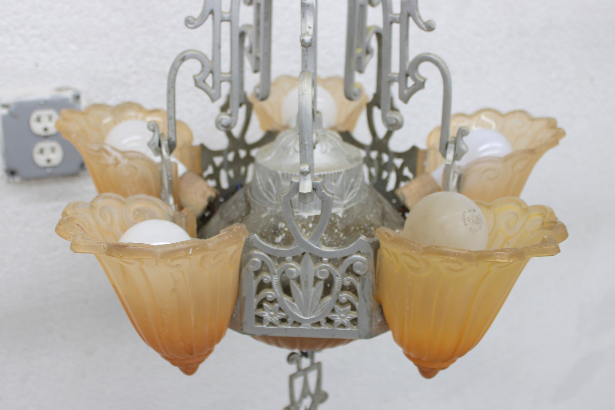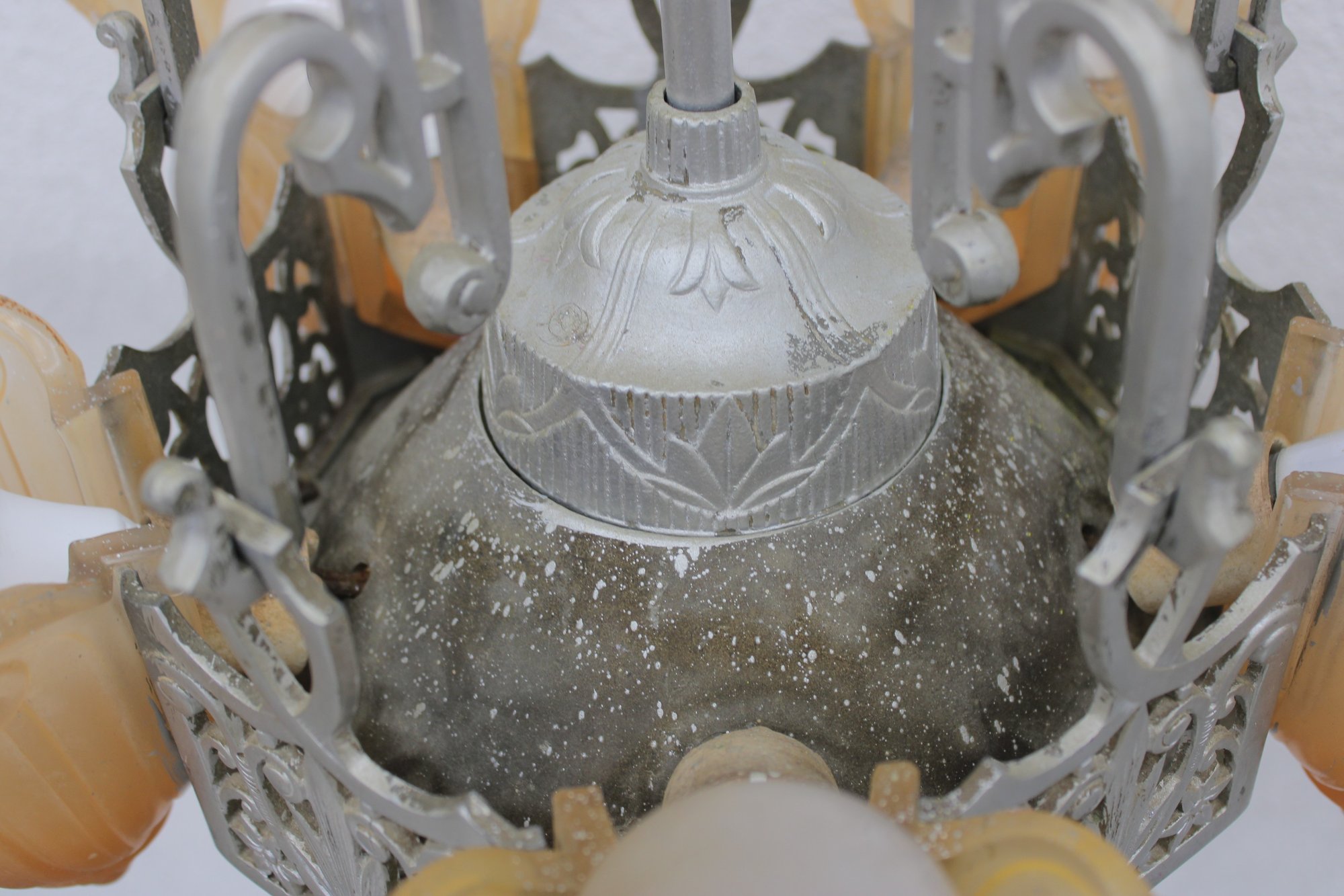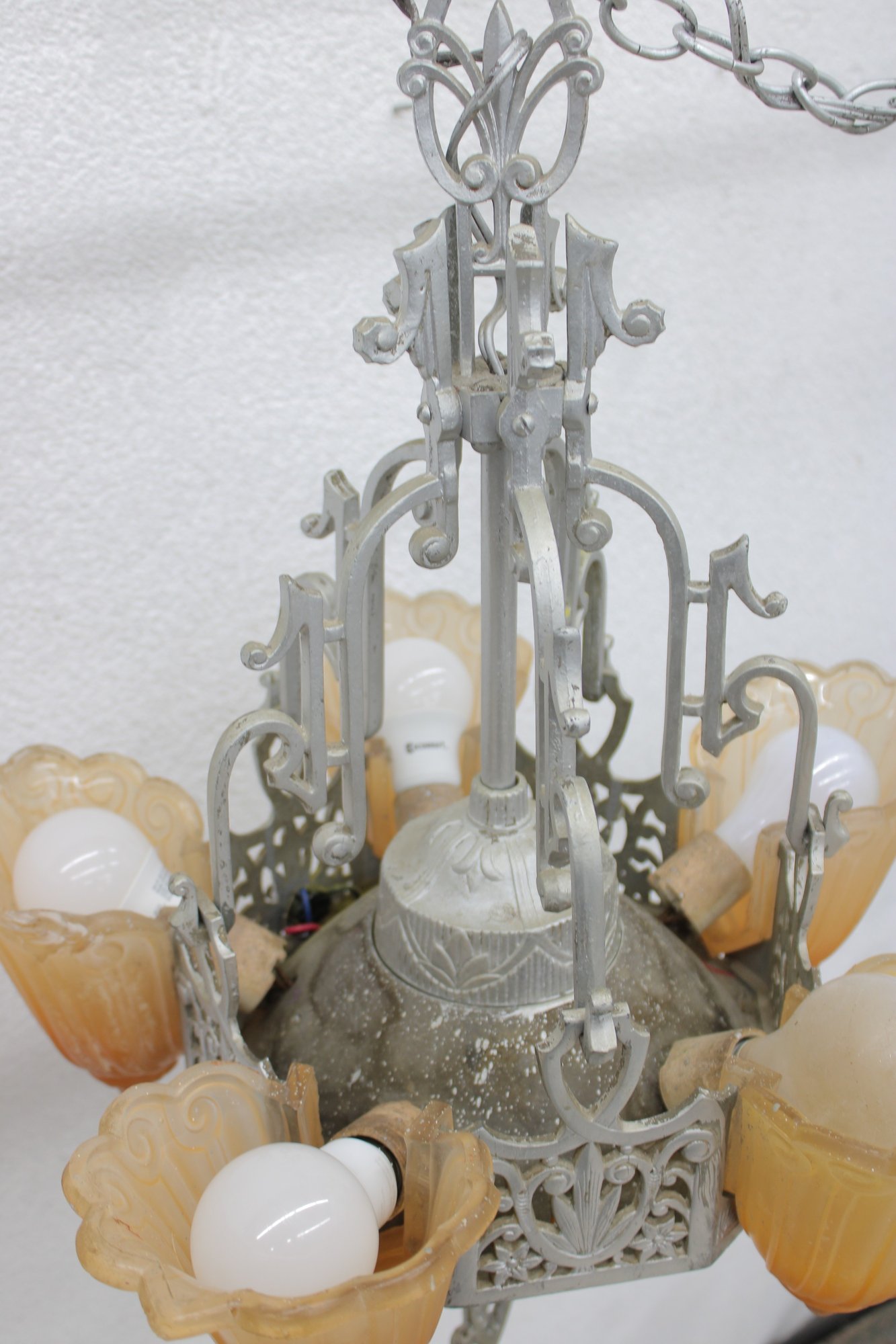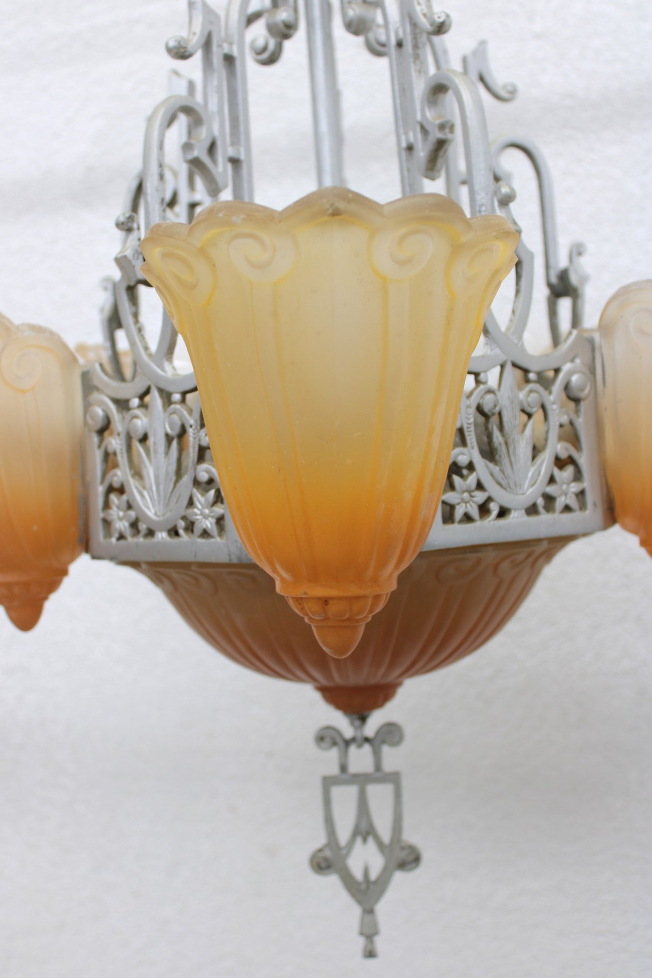 The chandelier is fitted with five original-style slip shades in a warm amber tone, each with a scalloped edge that diffuses light beautifully. The decorative framework incorporates intricate motifs and graceful curves, perfectly capturing the refined aesthetic of the Art Deco era.