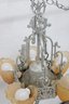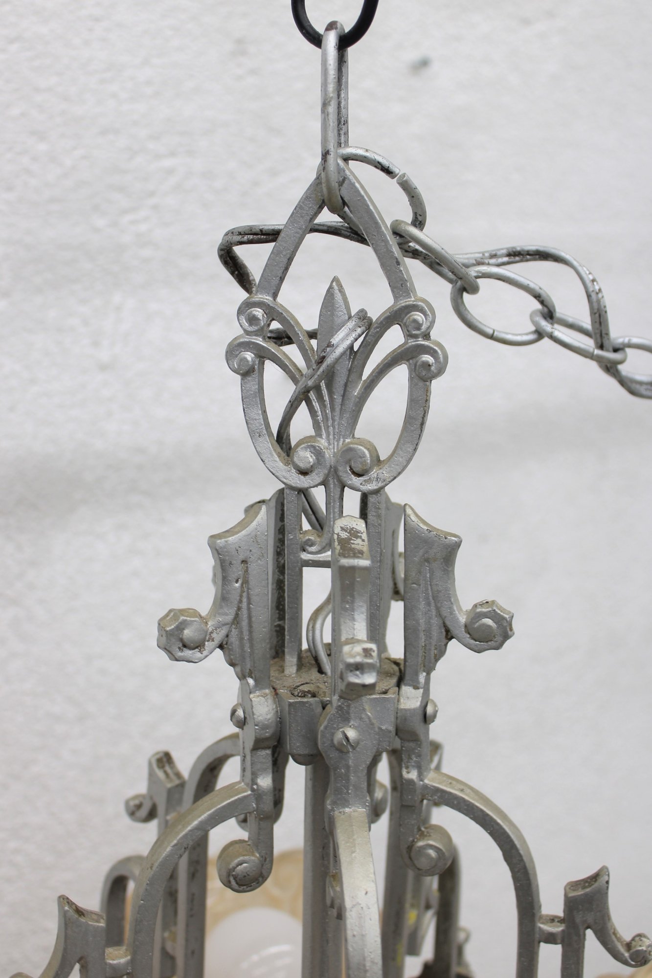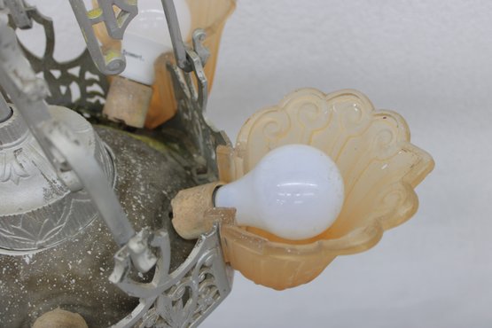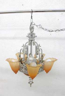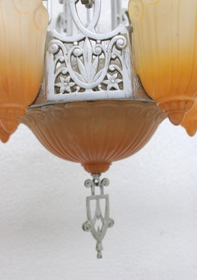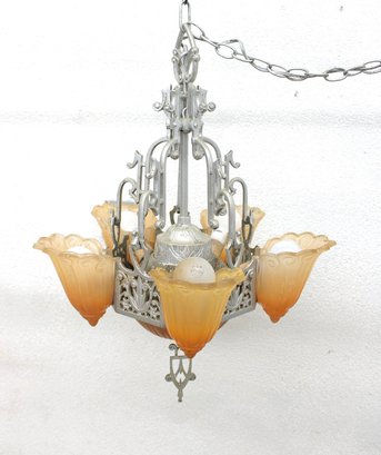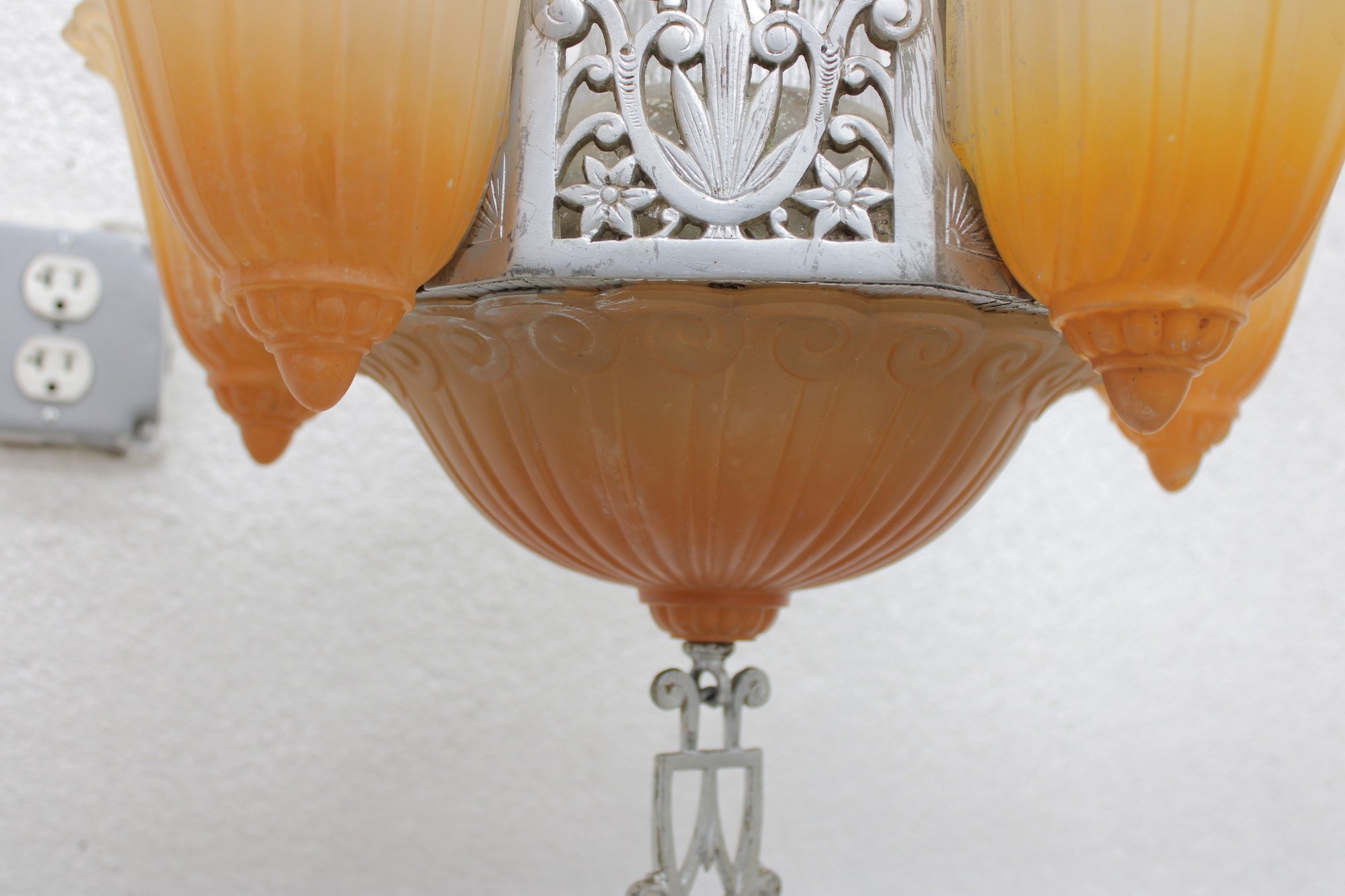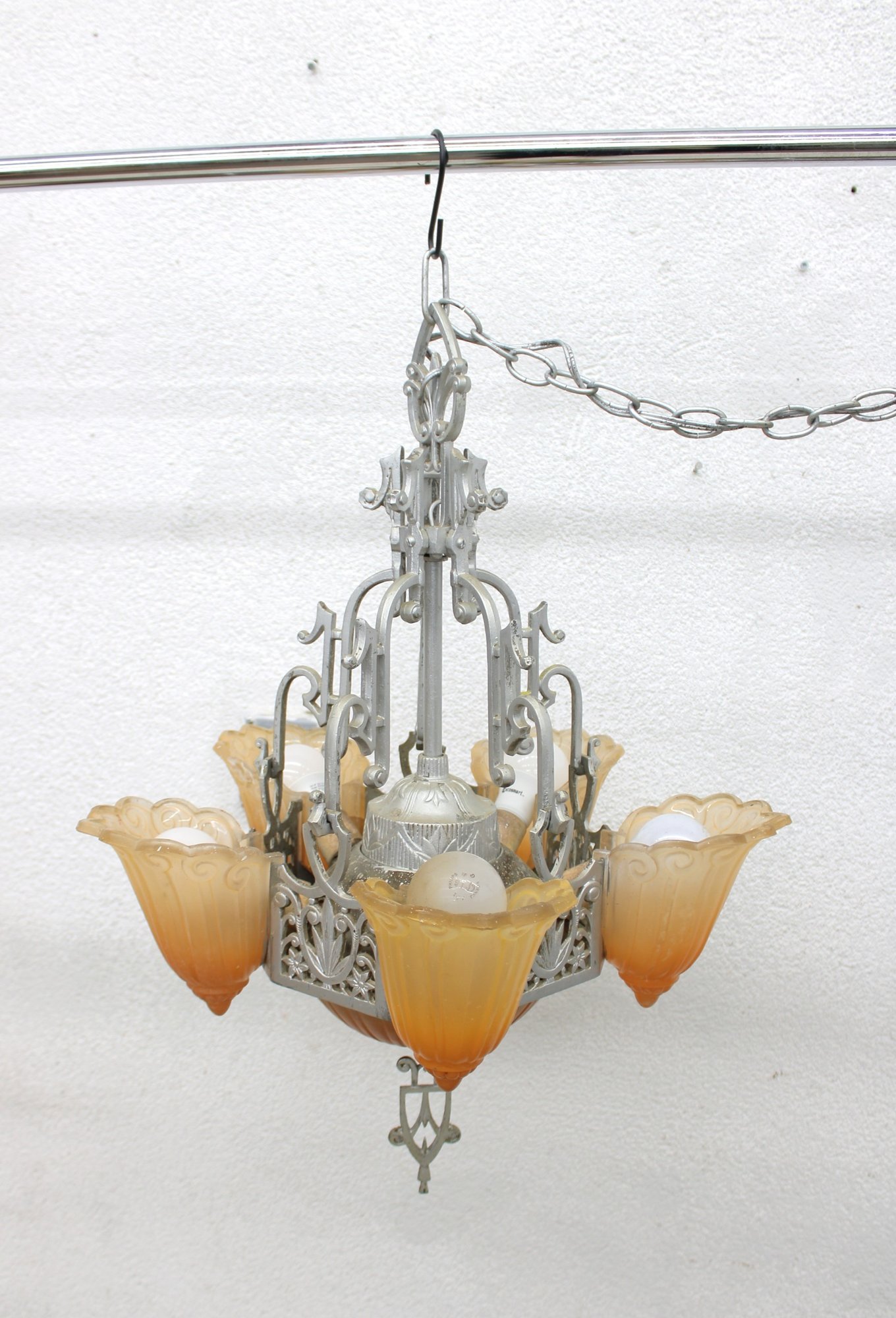 The chandelier is fitted with five original-style slip shades in a warm amber tone, each with a scalloped edge that diffuses light beautifully. The decorative framework incorporates intricate motifs and graceful curves, perfectly capturing the refined aesthetic of the Art Deco era.
