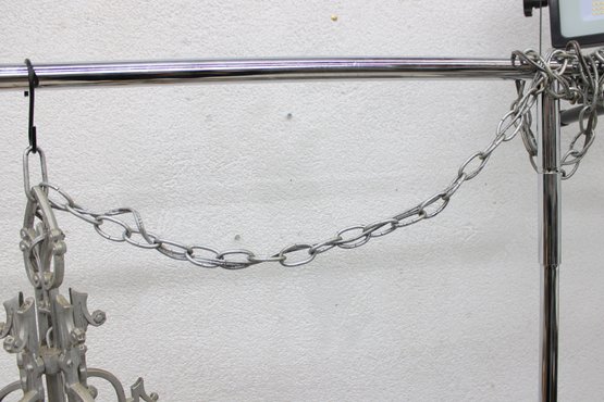 Beautiful and authentic 1930s Art Deco chandelier by Lincoln, featuring the highly sought-after “Fleur-De-Lis” design. This elegant 5-light fixture showcases classic period craftsmanship with ornate cast metal detailing and a striking central globe.