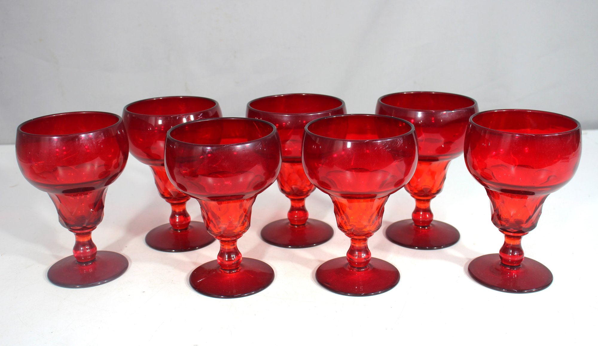 Rare set of 7 vintage 1930s Fenton Georgian Ruby Agua Caliente goblets. These deep ruby-red glasses feature a bold color with a classic stemmed design, ideal for serving champagne, wine, or dessert. A perfect addition to any Depression glass or vintage Fenton collection.