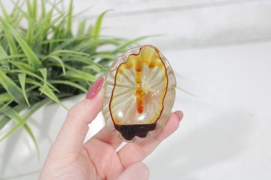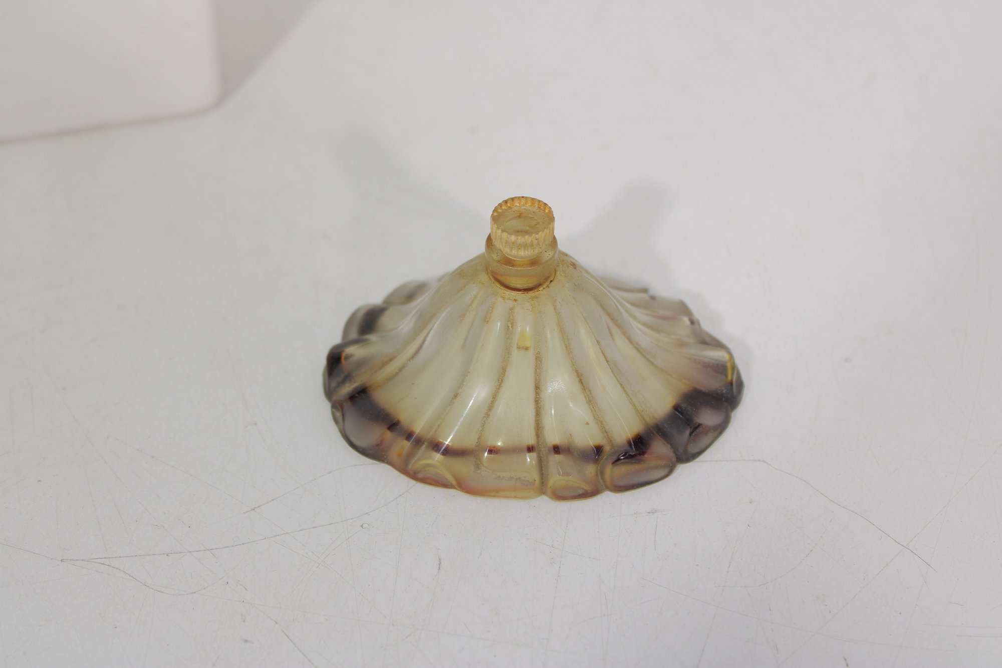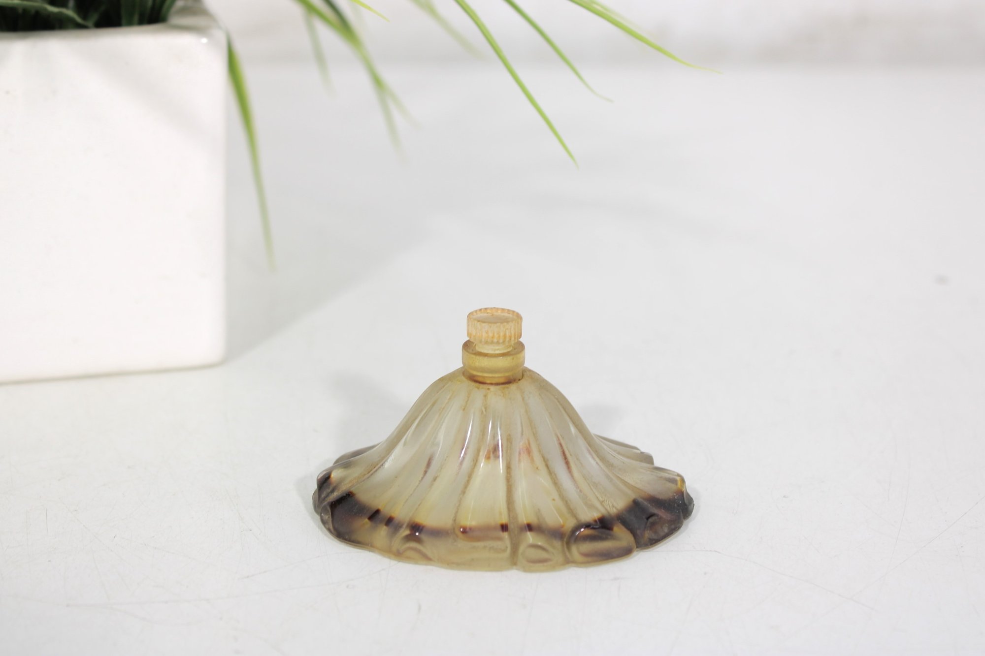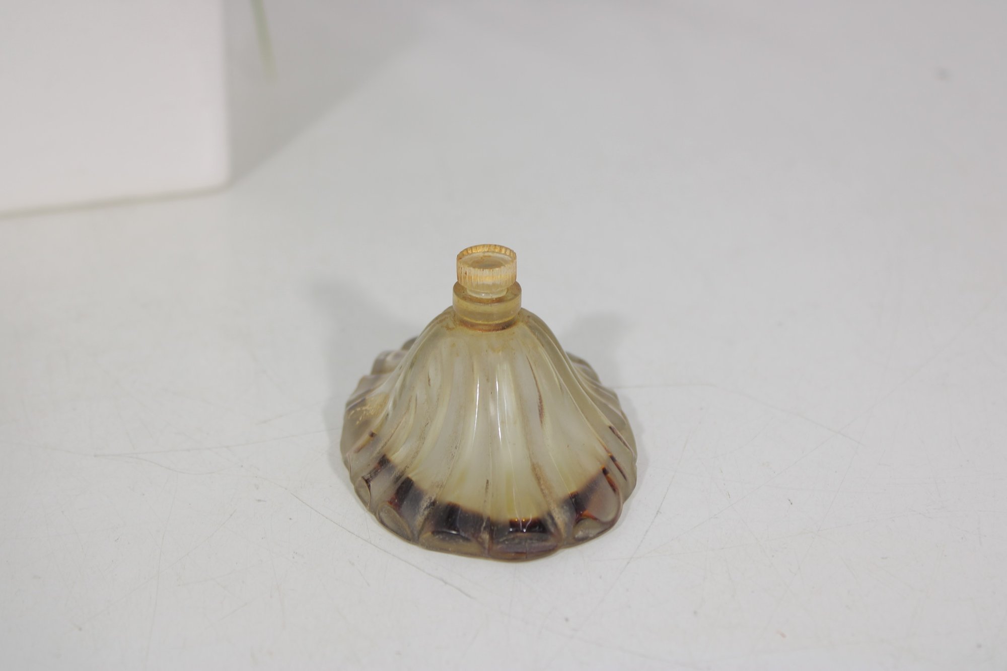 This elegant Art Deco–era bottle features a beautiful fan-shaped, scalloped design with warm amber tones and darker edging. The sculptural form reflects the sophisticated styling of late 1930s French perfumery. A wonderful example of classic Lucien Lelong presentation.