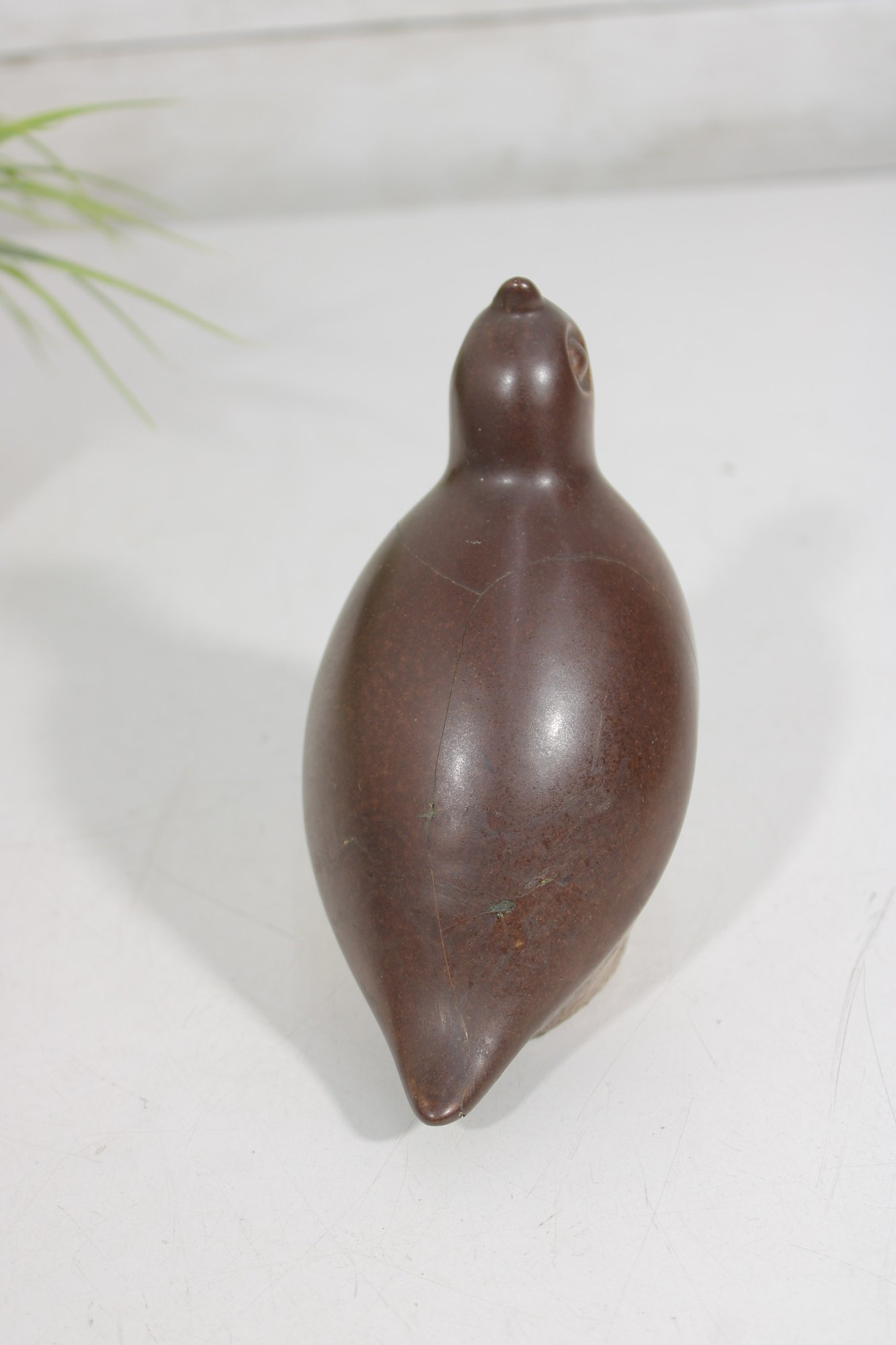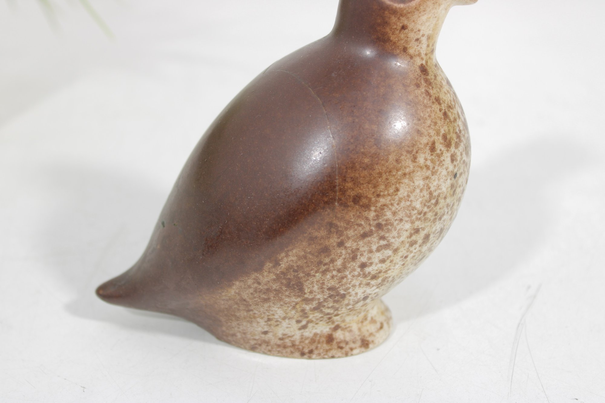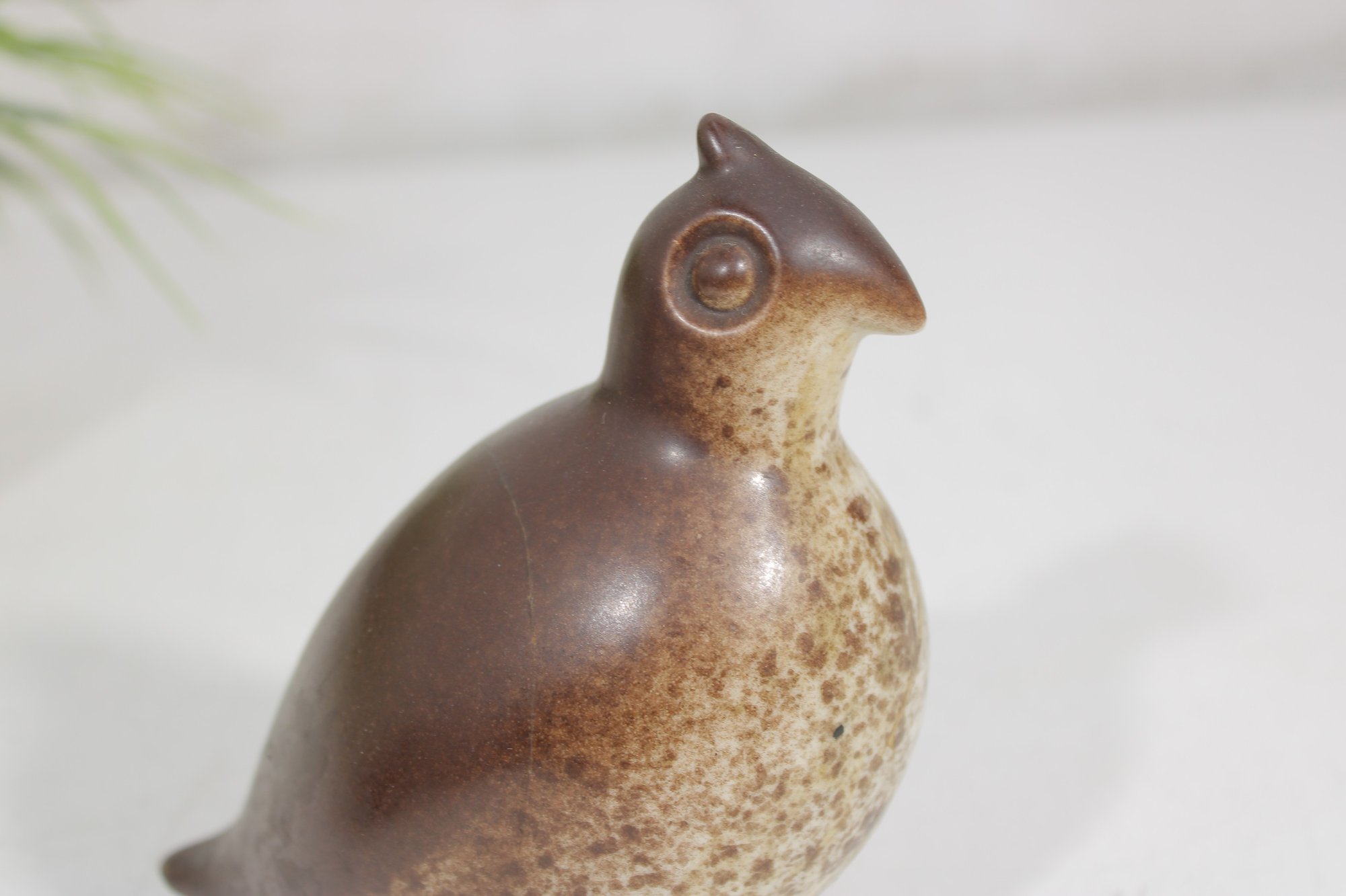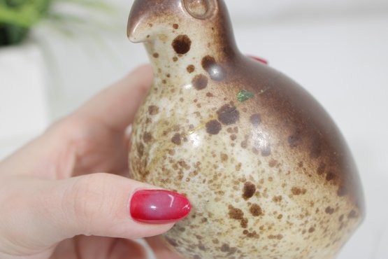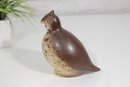 Vintage 1950s ceramic quail bird sculpture by Howard Pierce, known for his distinctive mid-century animal forms and earthy glaze finishes. This piece features a beautifully rounded body with a stylized head and subtle detailing, finished in warm brown and speckled tan tones.