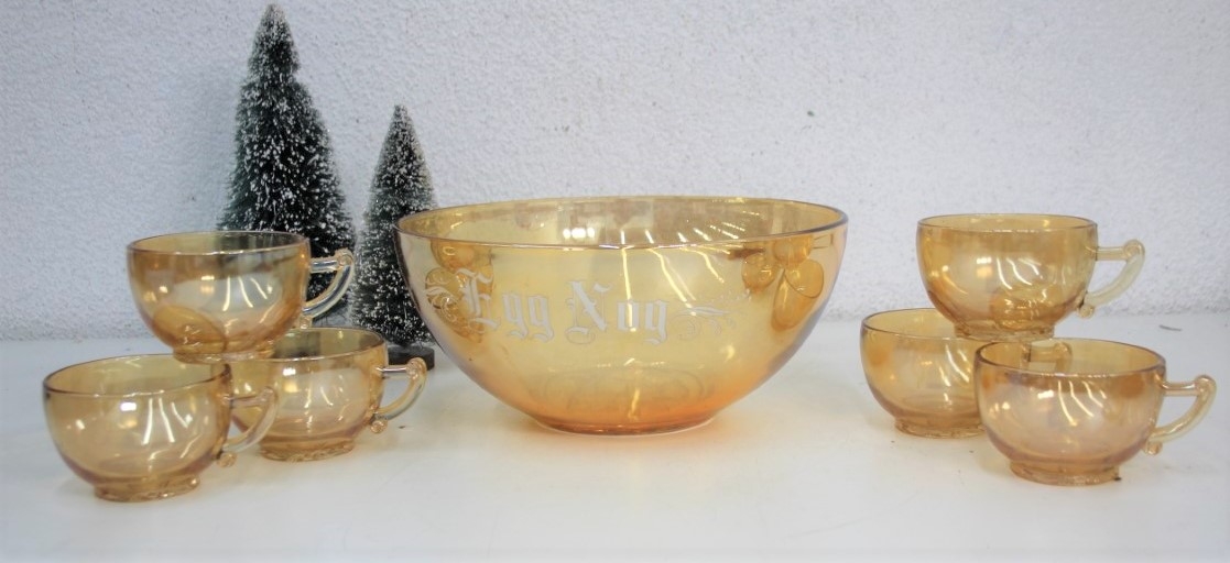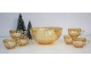 1950s Marigold Carnival Glass "Egg Nog" Punch Bowl And Six Cups - Jeanette Glass