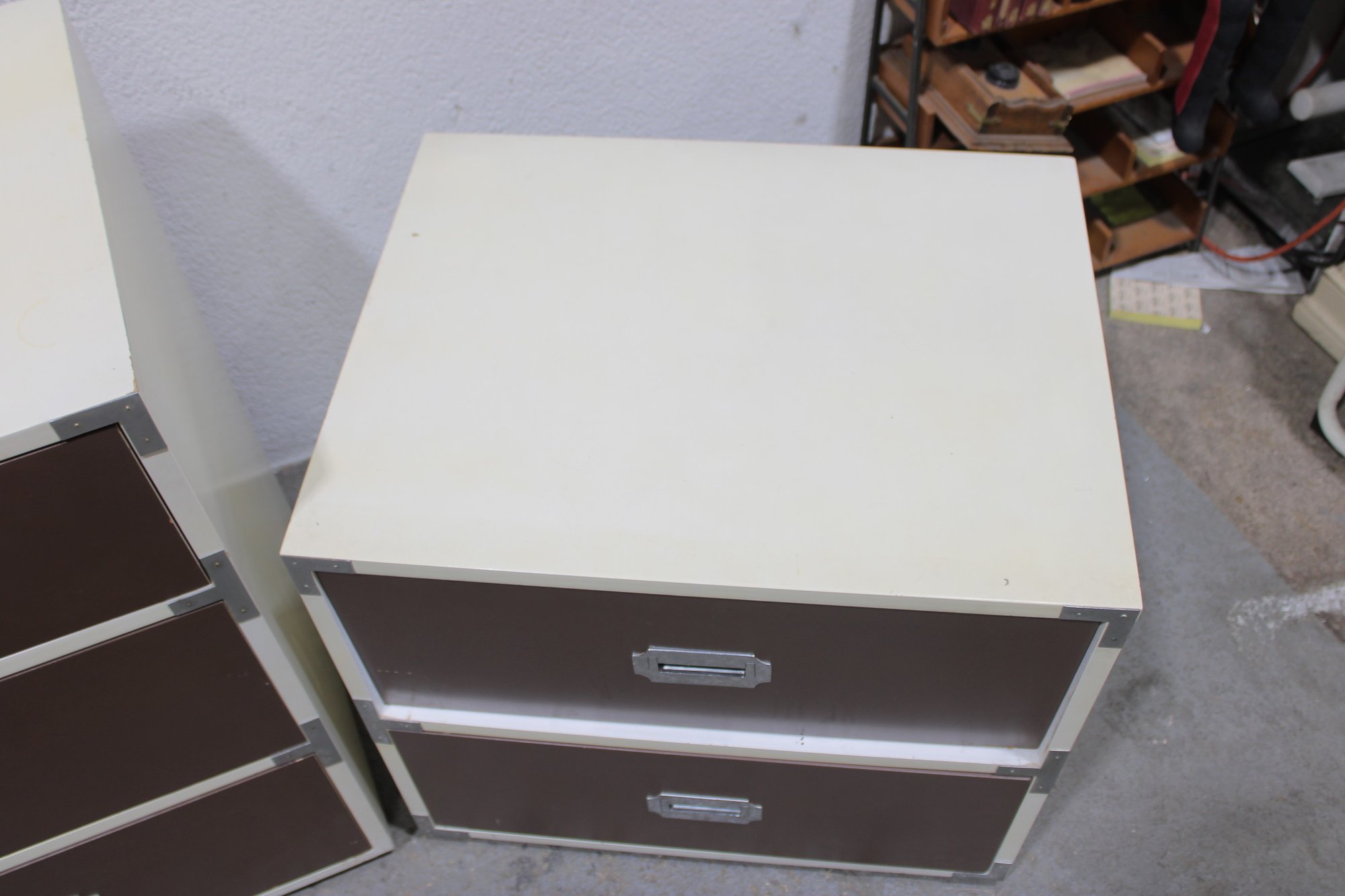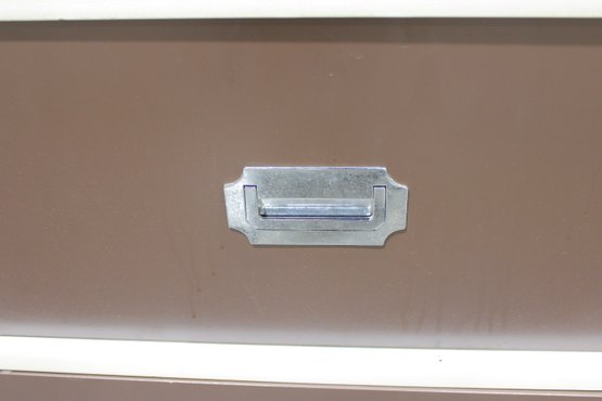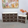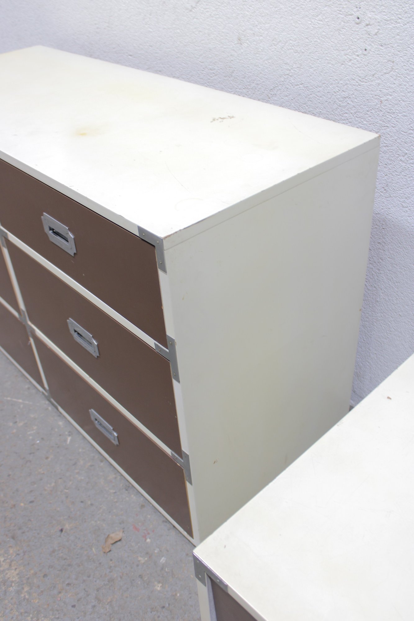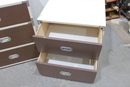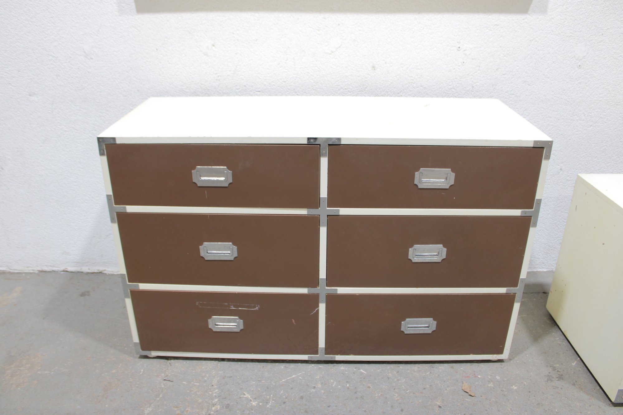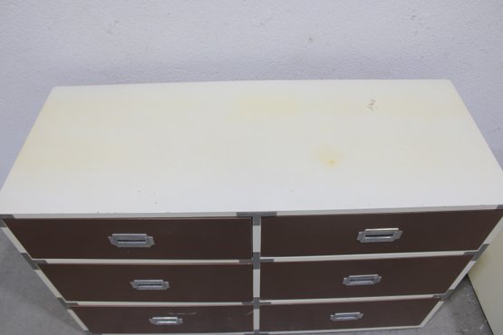 Classic 1960s Mid-Century Modern “Colormates” campaign-style bedroom set featuring a striking two-tone design in warm brown and crisp white. This set includes a 6-drawer dresser and matching 2-drawer nightstand, both accented with sleek inset metal pulls for a clean, functional look.