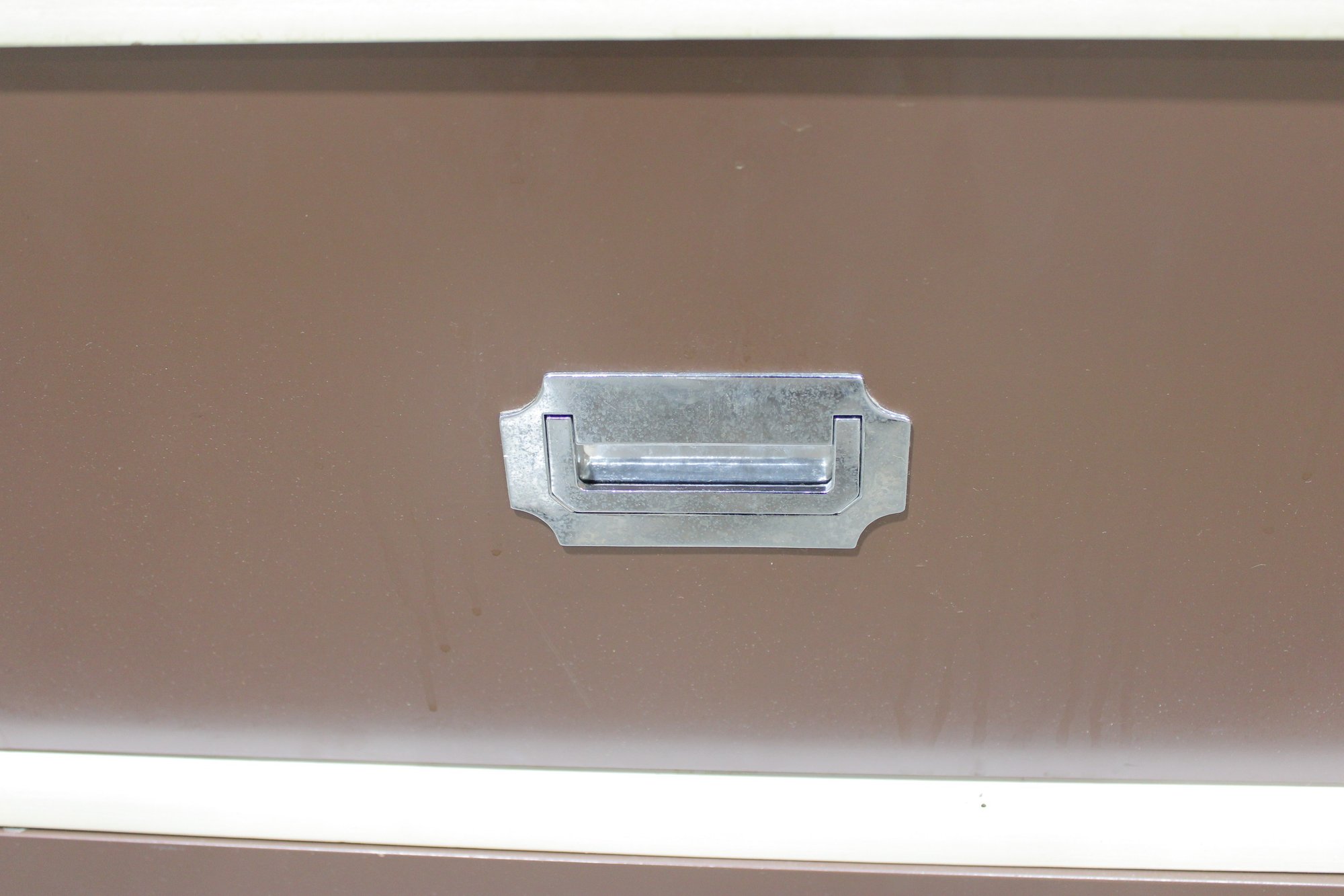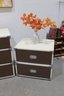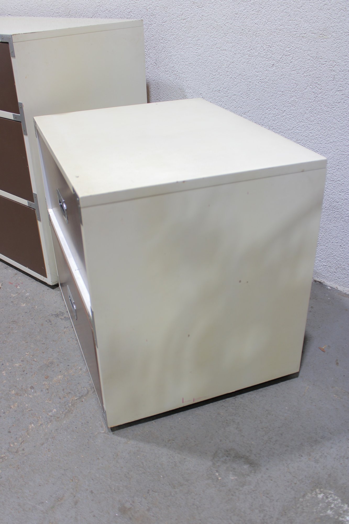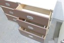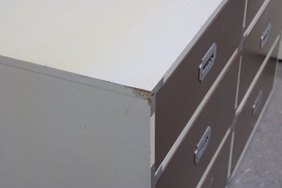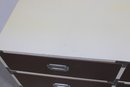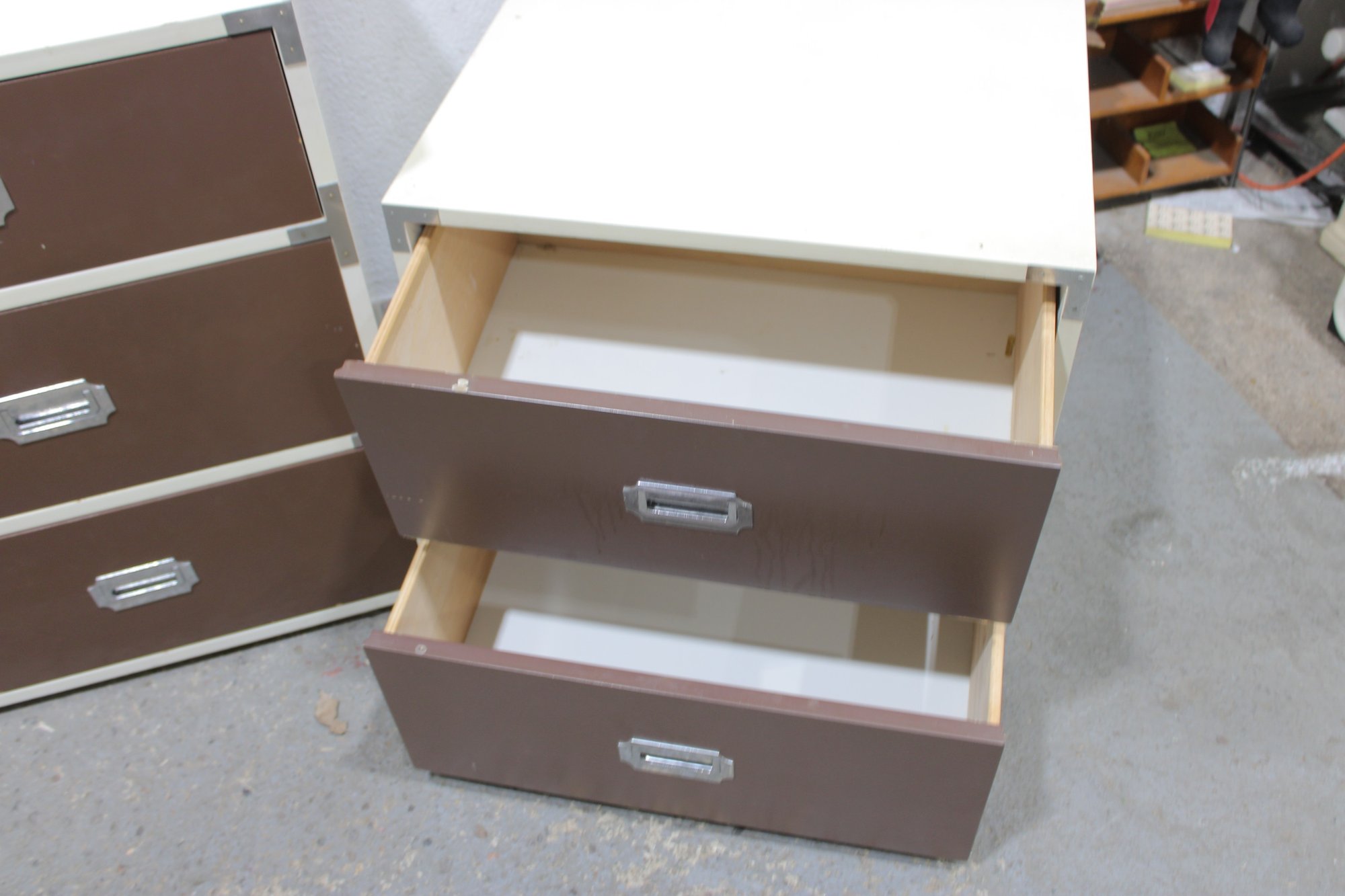 Classic 1960s Mid-Century Modern “Colormates” campaign-style bedroom set featuring a striking two-tone design in warm brown and crisp white. This set includes a 6-drawer dresser and matching 2-drawer nightstand, both accented with sleek inset metal pulls for a clean, functional look.