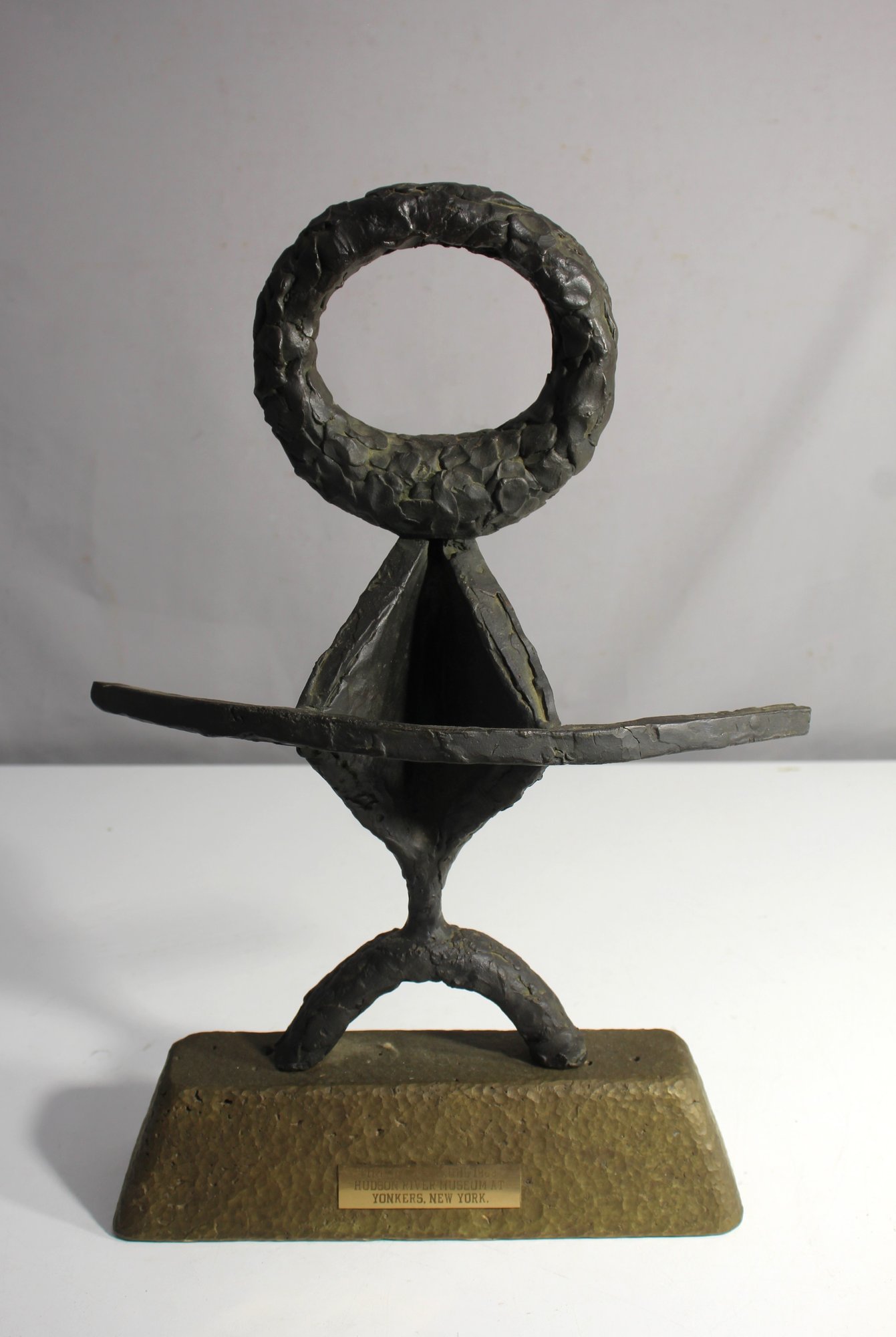 This auction features a unique abstract bronze sculpture titled "INF", created by Ms. E. Uhl in 1969. This notable piece was displayed at the Hudson River Museum in Yonkers, New York. The sculpture has a textured, rough-hewn design, embodying a striking modernist aesthetic with an emphasis on form and balance. Mounted on a sturdy base with a brass plaque, this artwork is a beautiful representation of mid-20th-century abstract sculpture.
