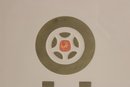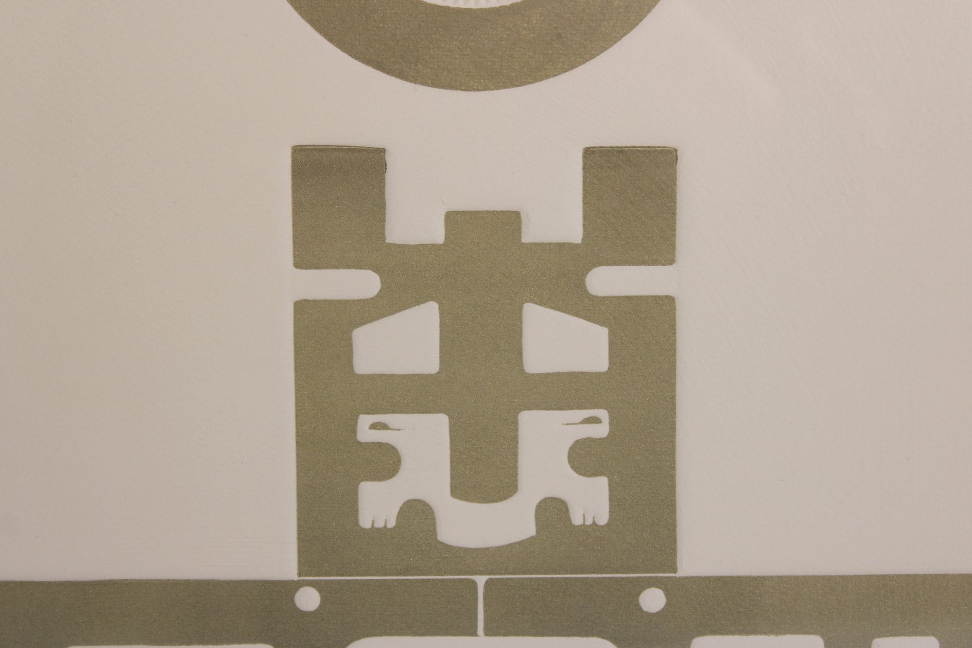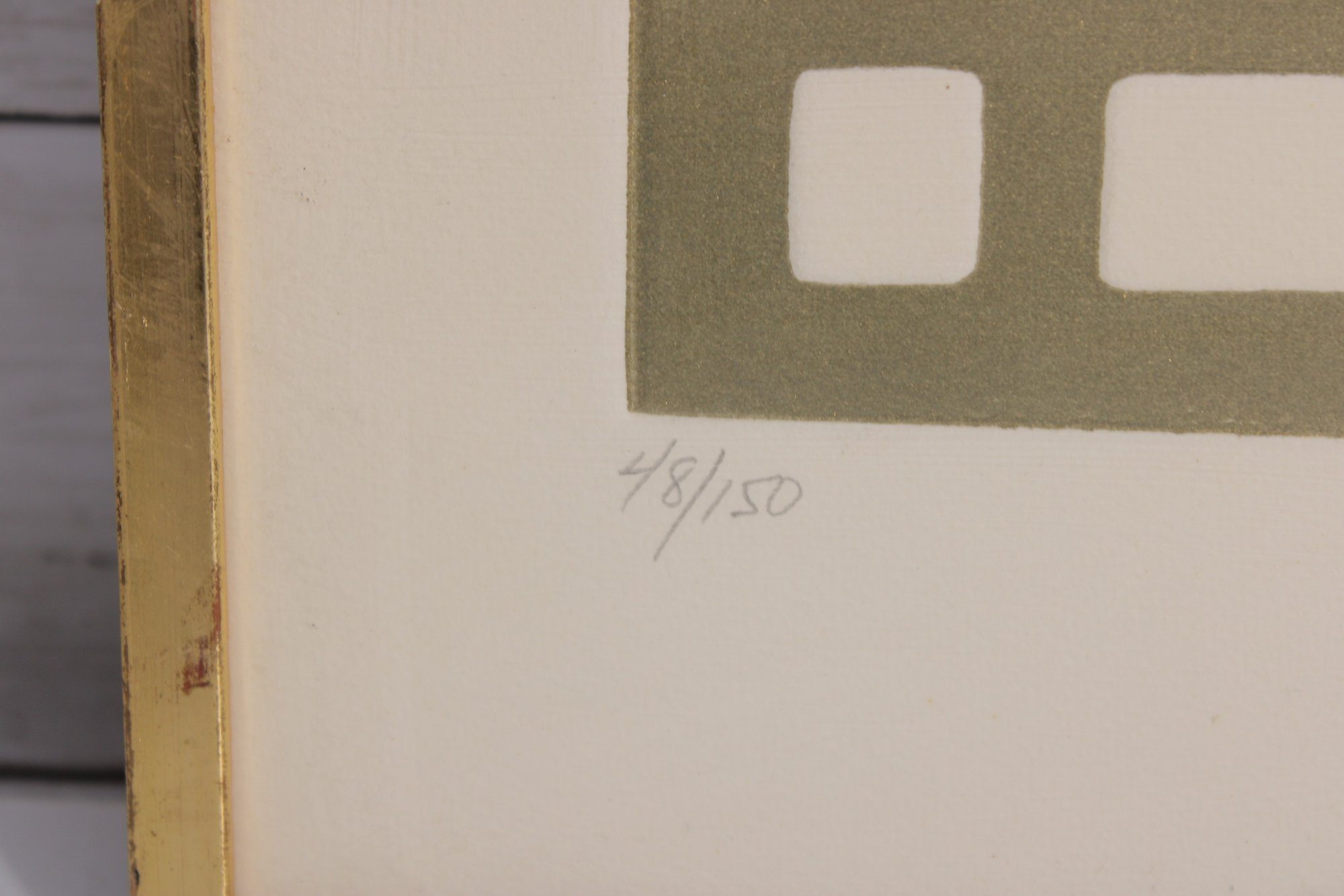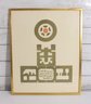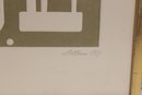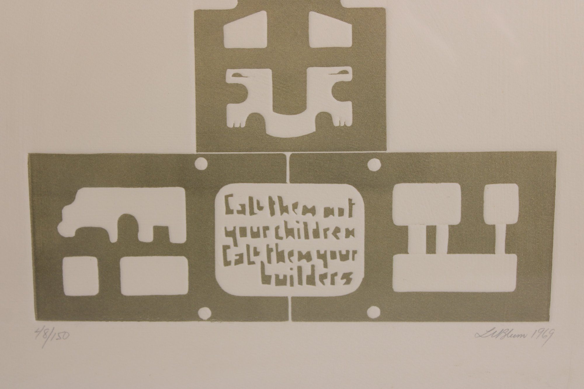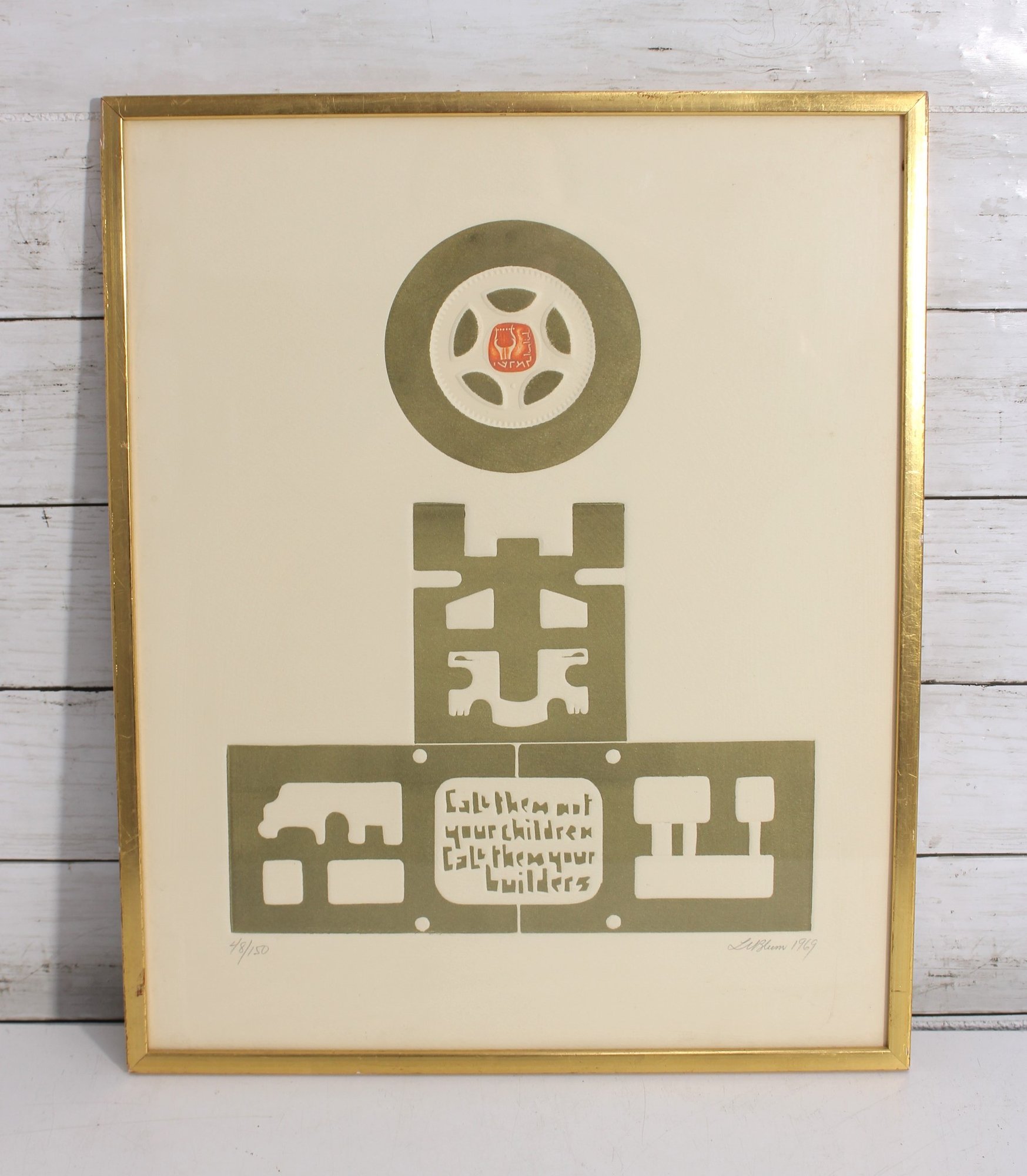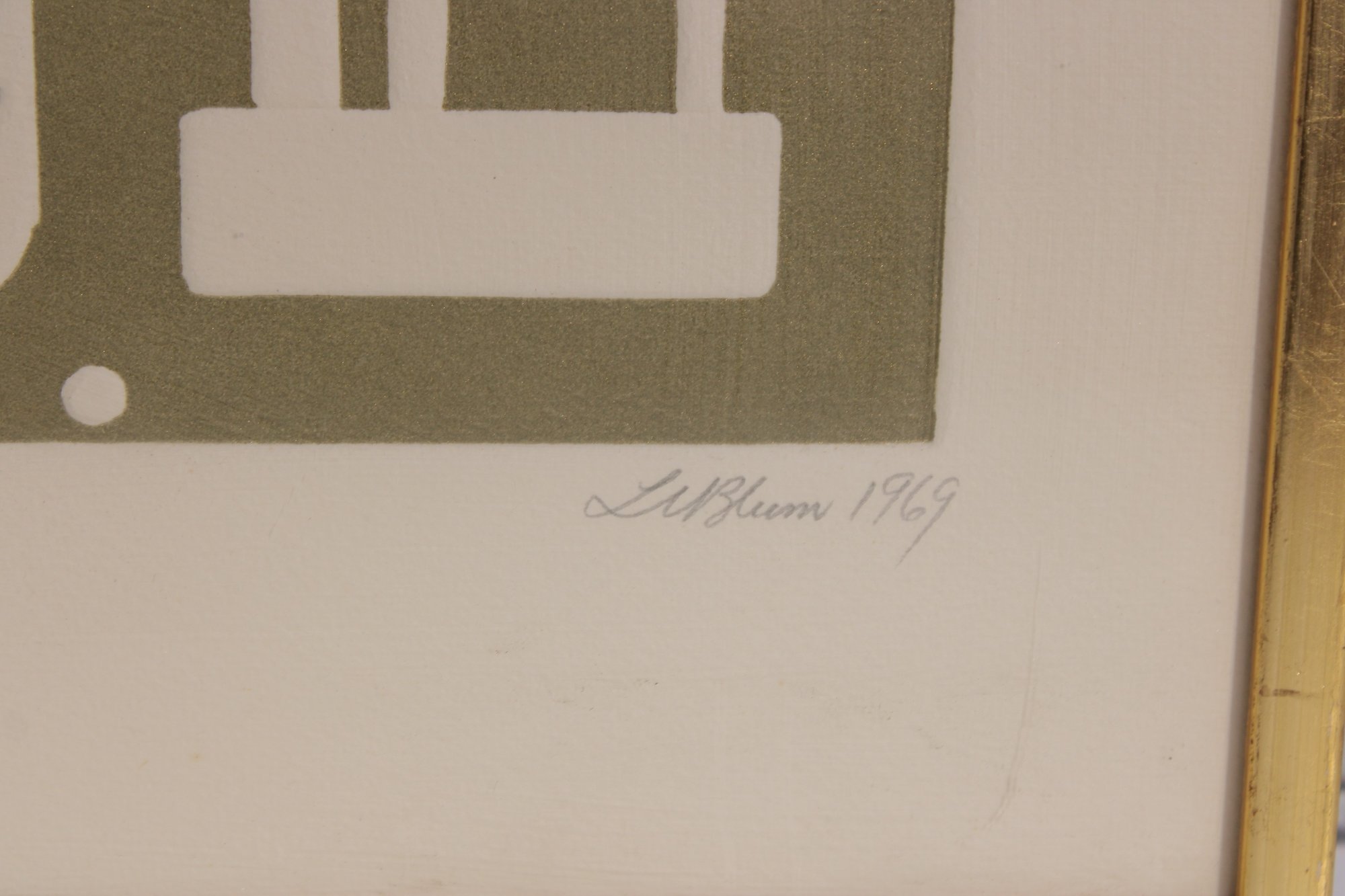 vintage modernist print by L.M. Blum, dated 1969 and hand-signed by the artist. This limited edition piece is numbered 48/150 and features a bold, graphic composition with geometric and symbolic forms rendered in an earthy olive tone.