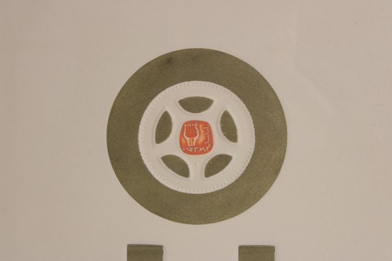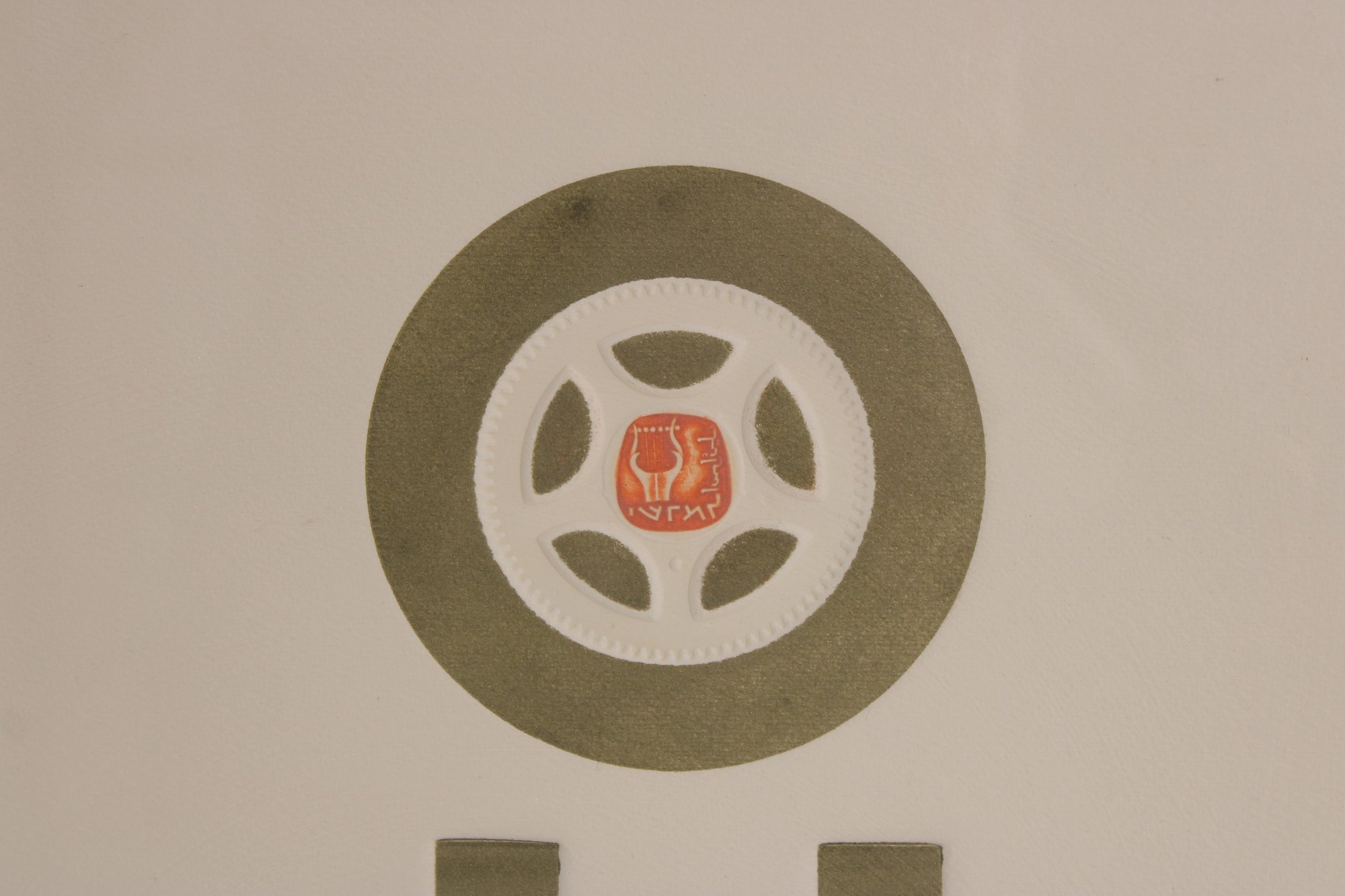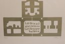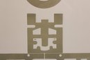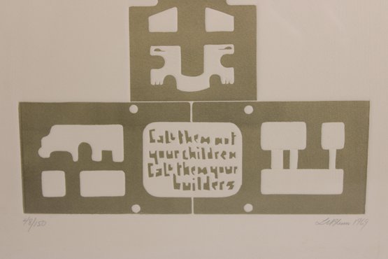 The design has a strong mid-century modern aesthetic, combining abstract shapes with a central motif and stylized elements that evoke architectural or cultural symbolism. The lower section includes an inscription that appears to read: “Call them not your children, call them your builders,” adding a thoughtful and philosophical dimension to the artwork.