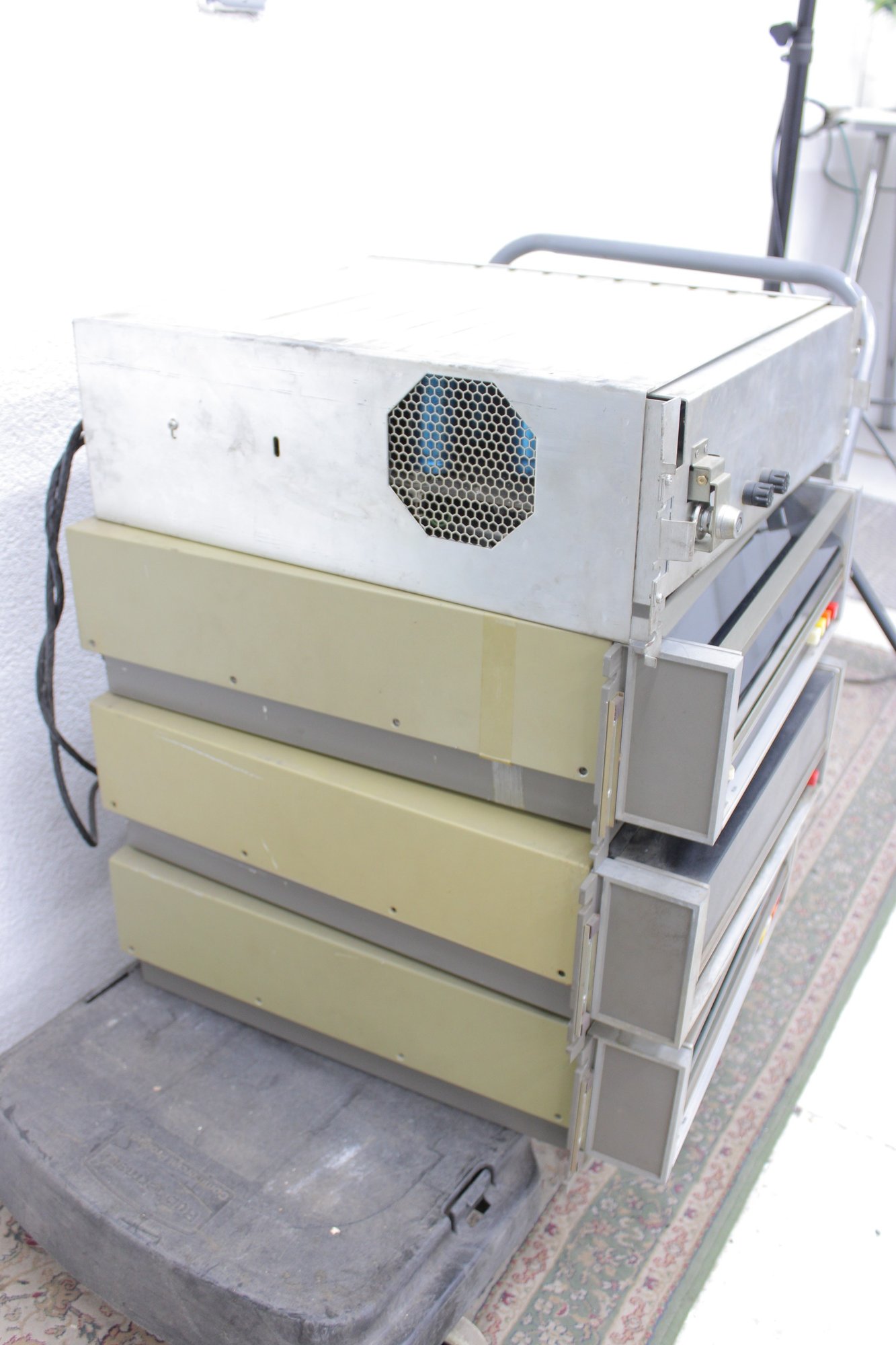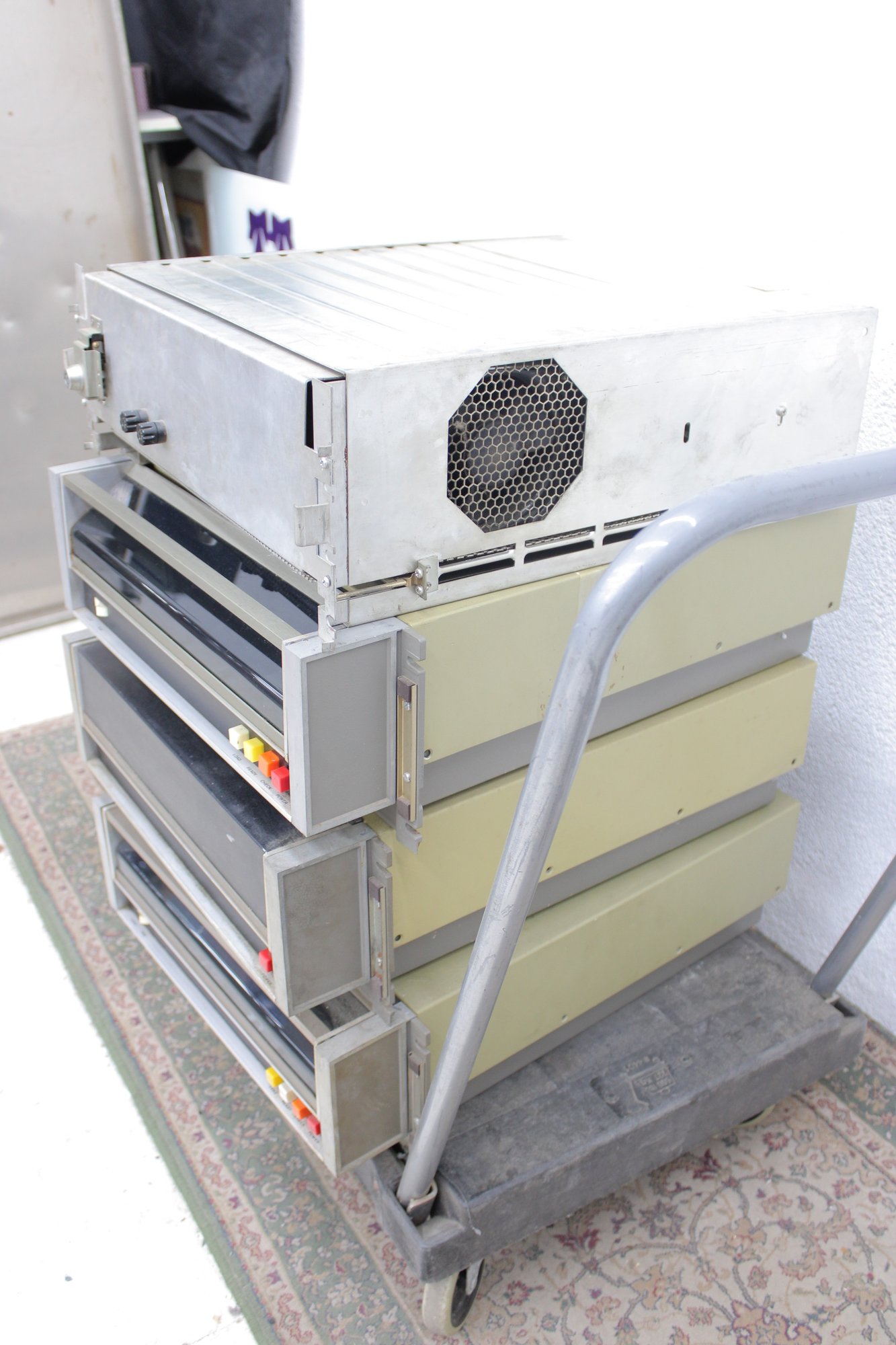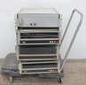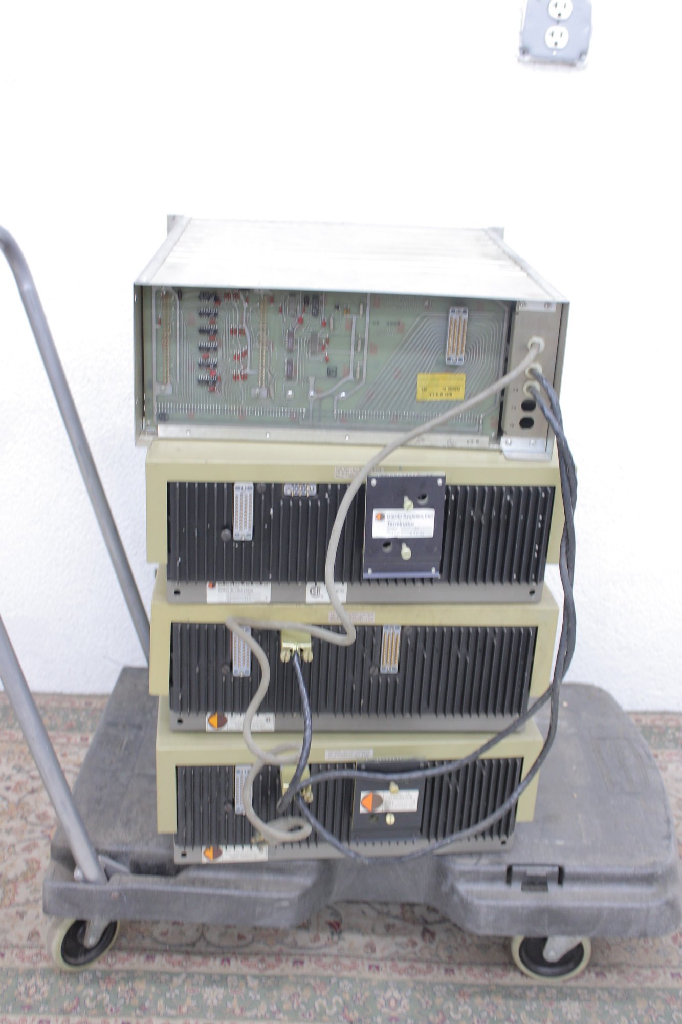 This impressive multi-unit stack includes multiple drive modules mounted on a rolling industrial cart, complete with original control panels, indicator buttons, rear cabling, and visible Diablo labeling. A true piece of computing history from the dawn of commercial disk storage.