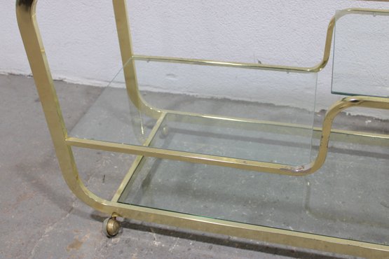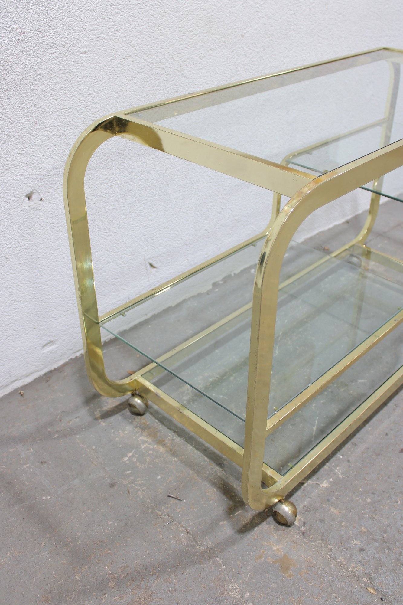 Striking 1970s brass and glass bar cart featuring a sleek, architectural etagere-style design, attributed to Milo Baughman. The clean lines, rounded corners, and minimalist frame embody the sophisticated modernism of the era.
