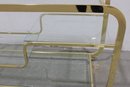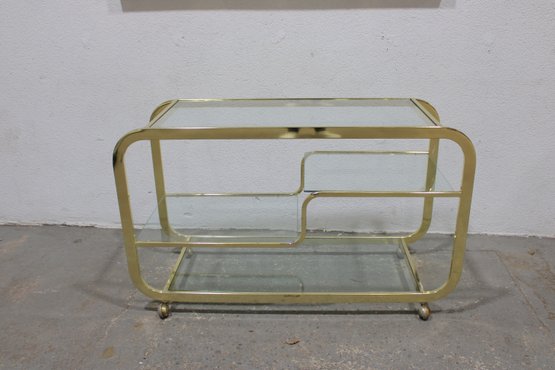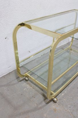 This two-tier piece is crafted with a polished brass-tone frame and inset glass shelves, offering both style and functionality. The open, airy structure makes it perfect for use as a bar cart, serving trolley, or display piece. Smooth-rolling casters allow for easy mobility, ideal for entertaining.