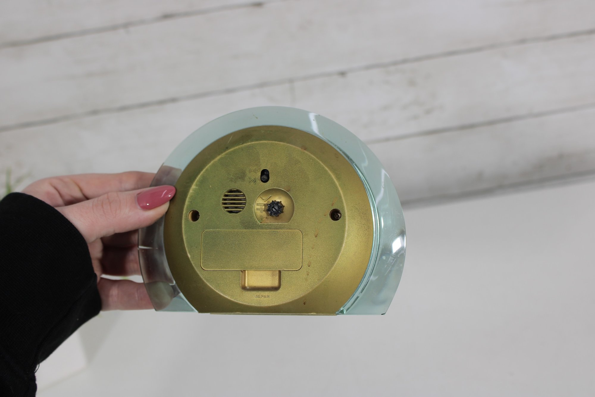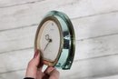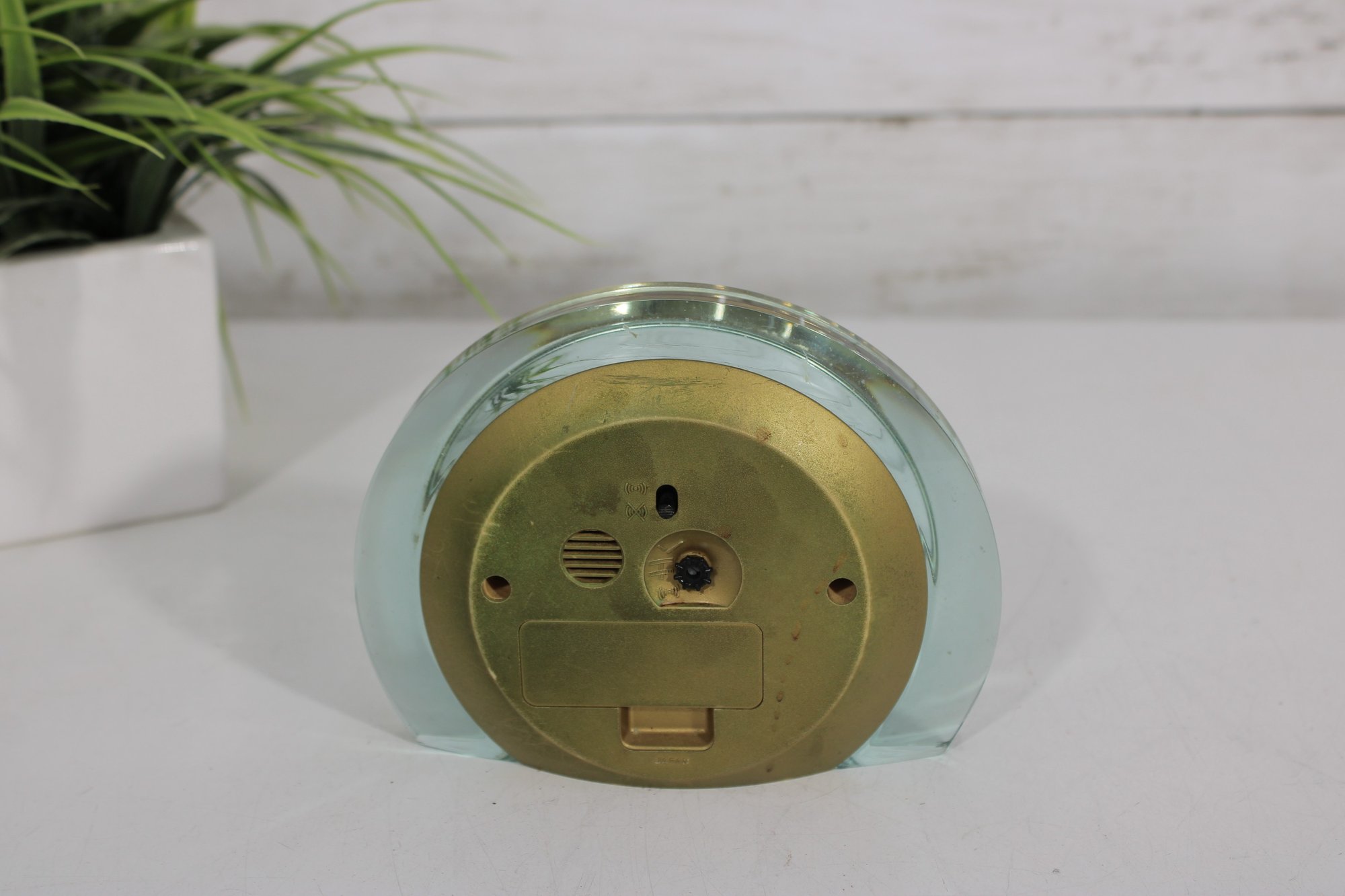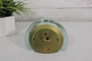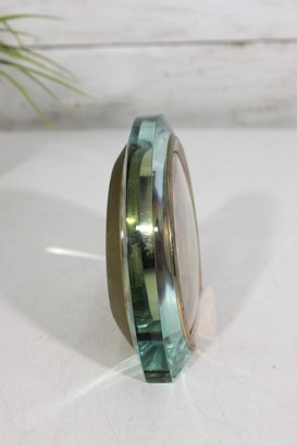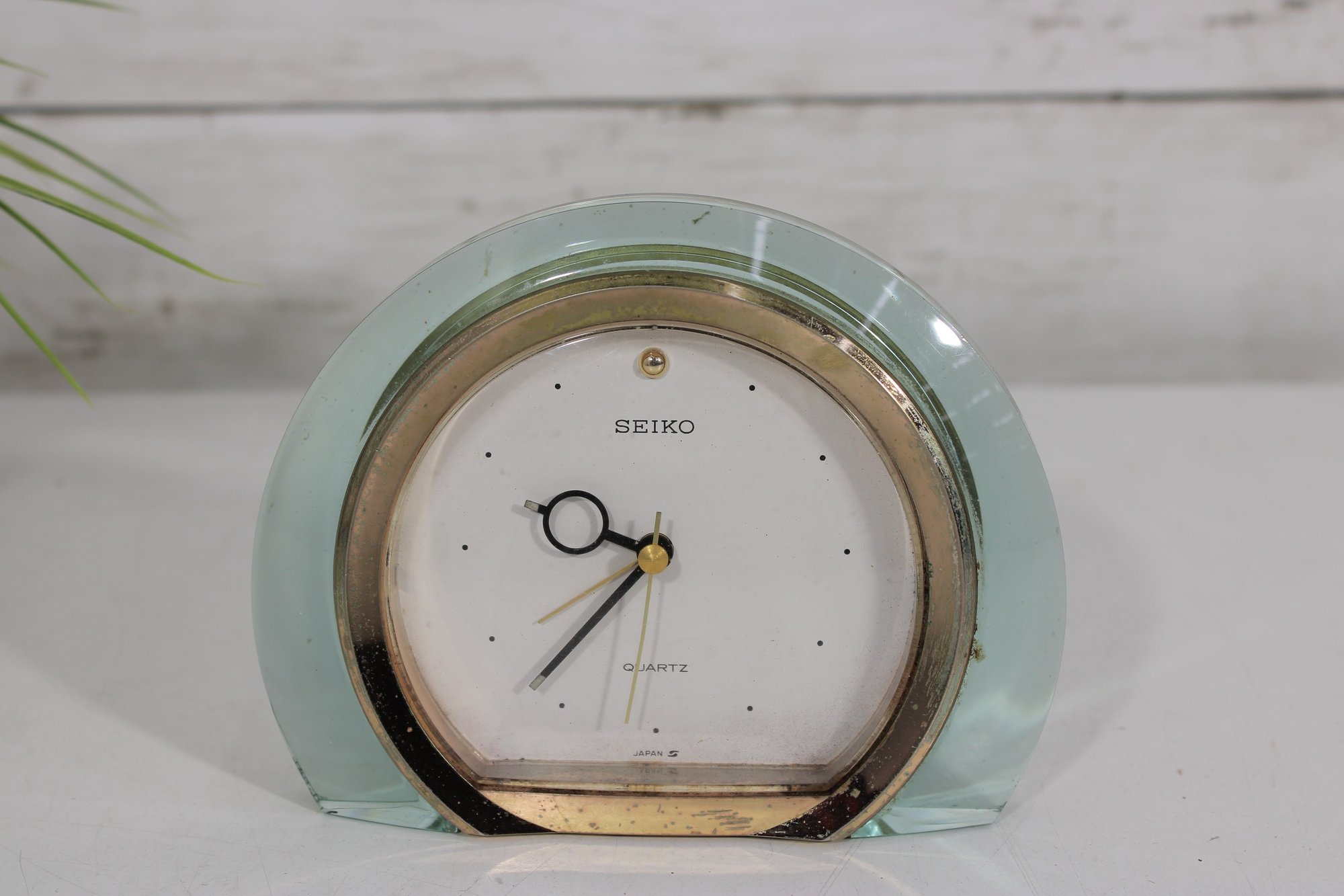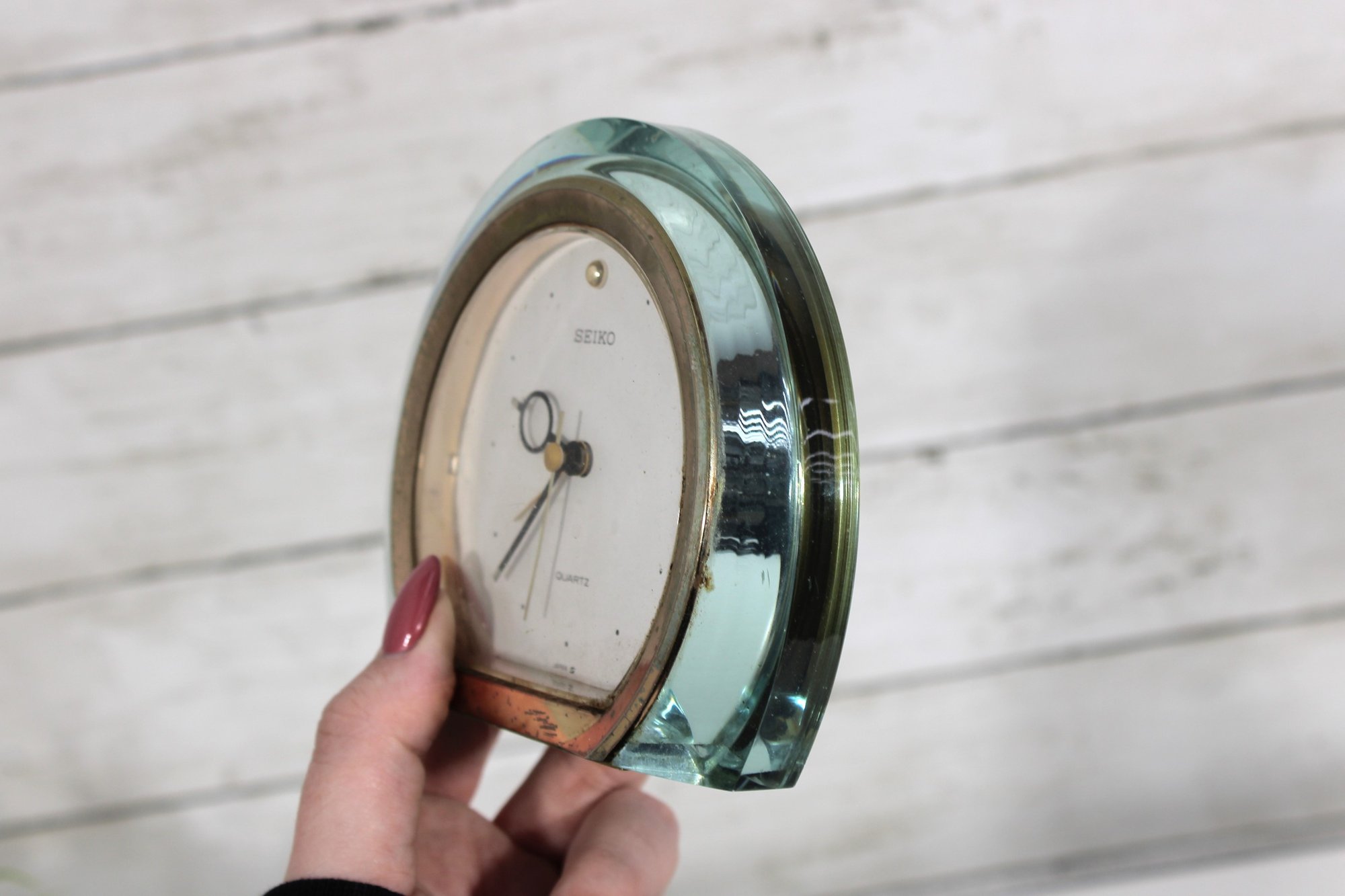 Stylish 1970s vintage Seiko desk clock featuring a sleek lucite (acrylic) case with a soft green tint and a minimalist mid-century modern design.