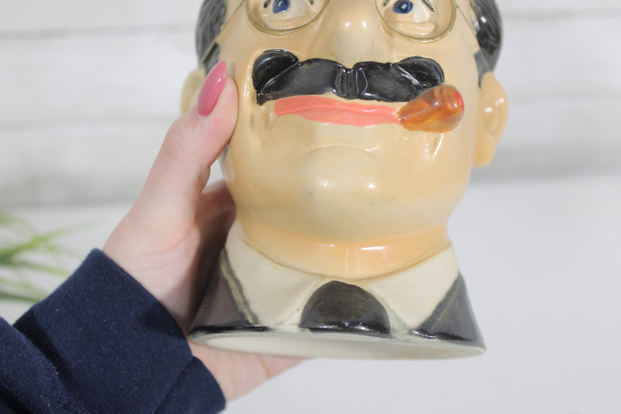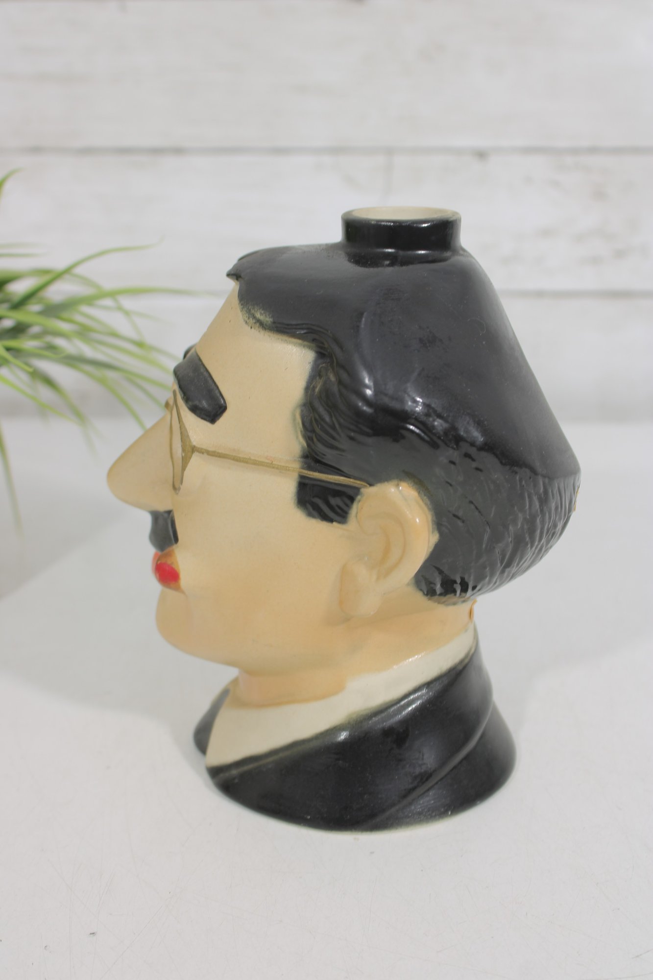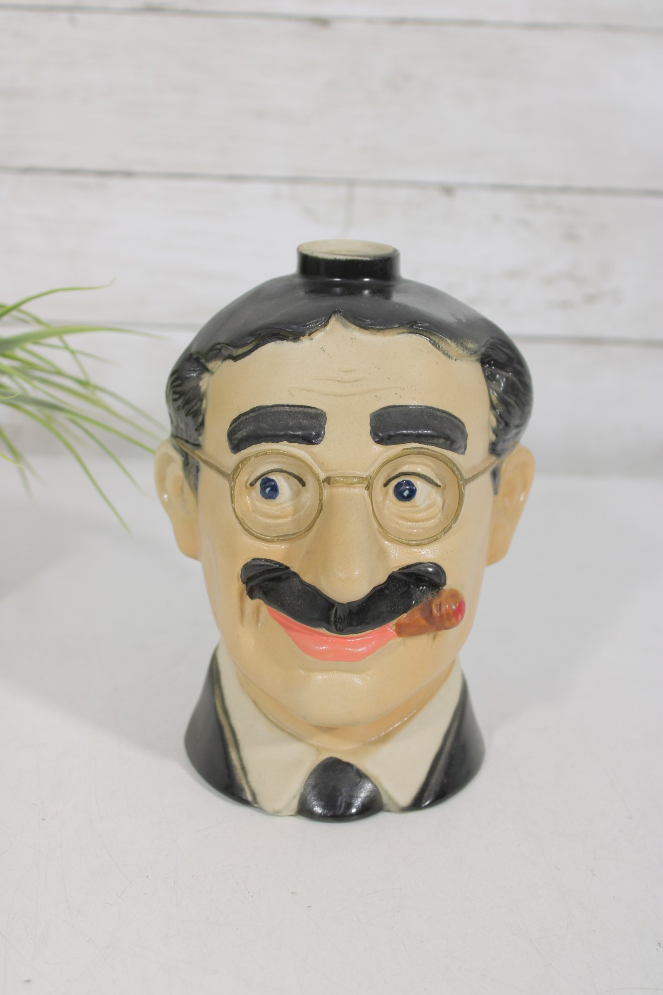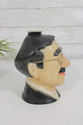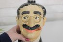 1977 ceramic Groucho Marx character decanter produced by Ezra Brooks, standing approximately 7 inches tall. This collectible liquor decanter is modeled after the famous comedian with his iconic round glasses, thick eyebrows, cigar, and mustache, making it a recognizable tribute to the legendary entertainer.