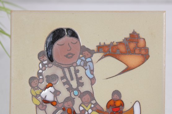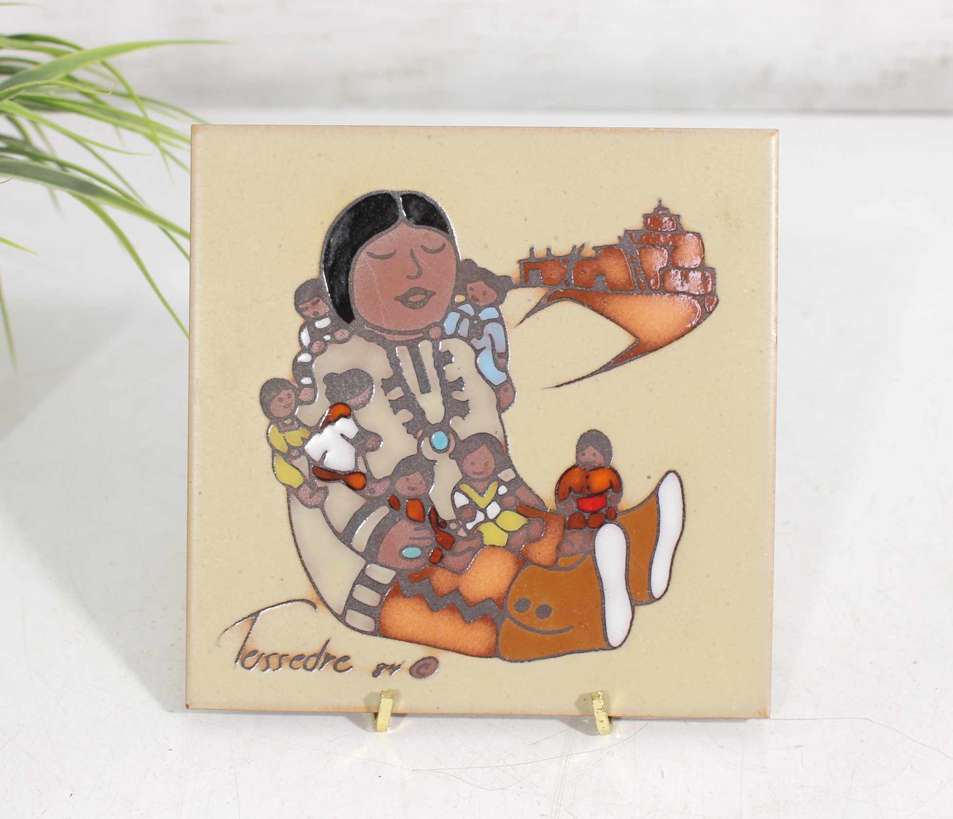 Beautiful signed art pottery tile by Cleo Teissedre, dated 1984, featuring a warm and expressive Native American-inspired mother and children scene. The composition depicts a seated figure surrounded by children and dolls, rendered in earthy tones with soft pastel accents, capturing a sense of storytelling and cultural heritage.