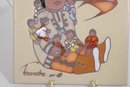 The artwork is framed in wood and retains its original signature “Teissedre 84” on the front, confirming authenticity. The tile has a smooth glazed surface with detailed linework and vibrant yet muted coloration typical of the artist’s style.