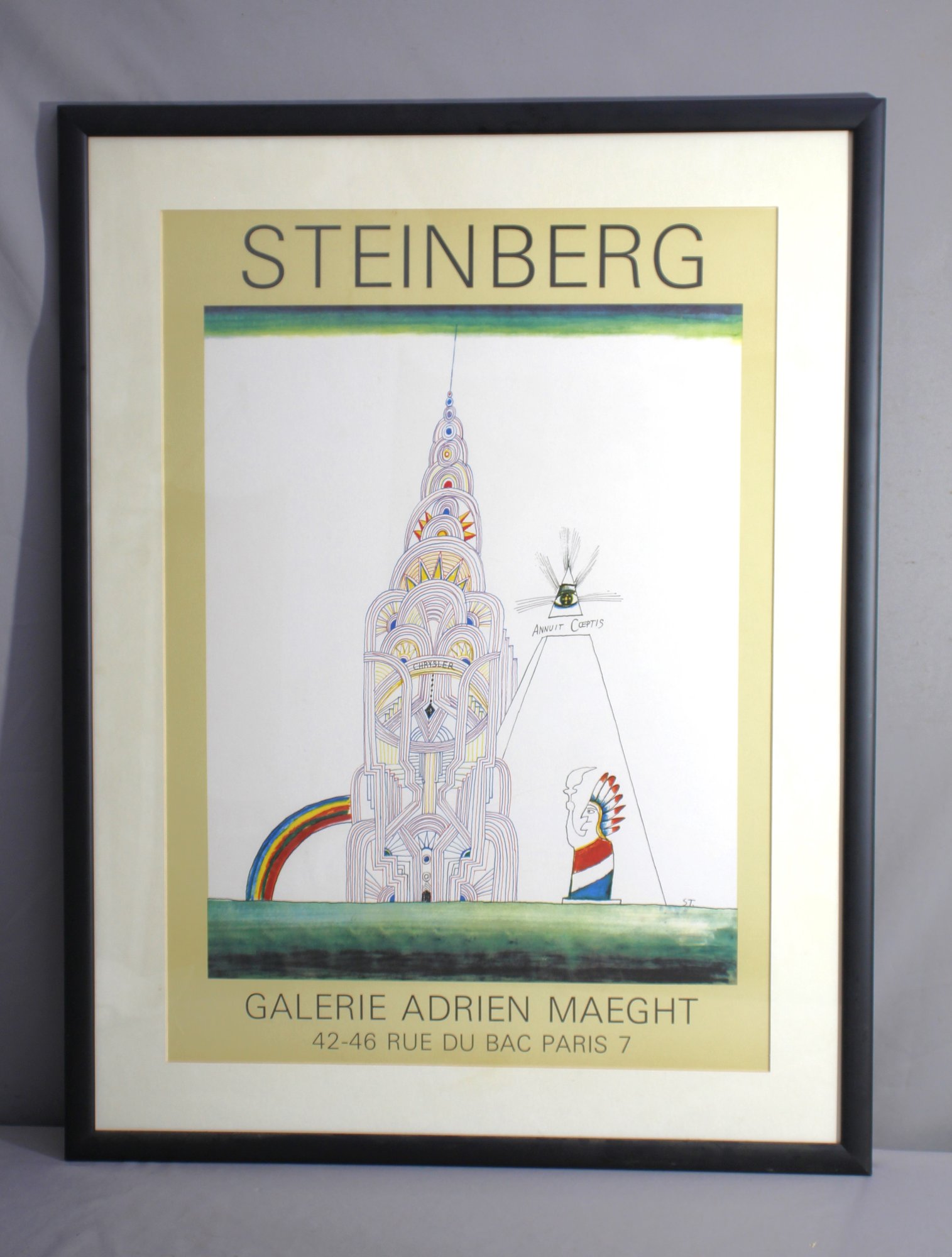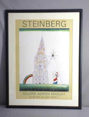 This 1988 exhibition poster featuring the artwork of renowned artist Saul Steinberg, displayed at the Galerie Adrien Maeght in Paris. The poster showcases Steinberg's unique and whimsical style, highlighting his intricate and imaginative architectural drawing.